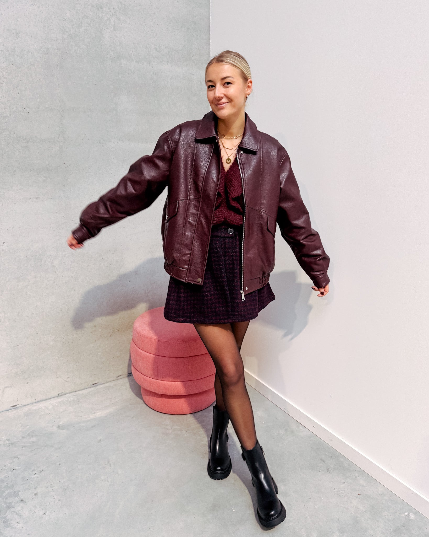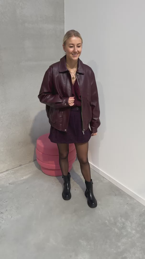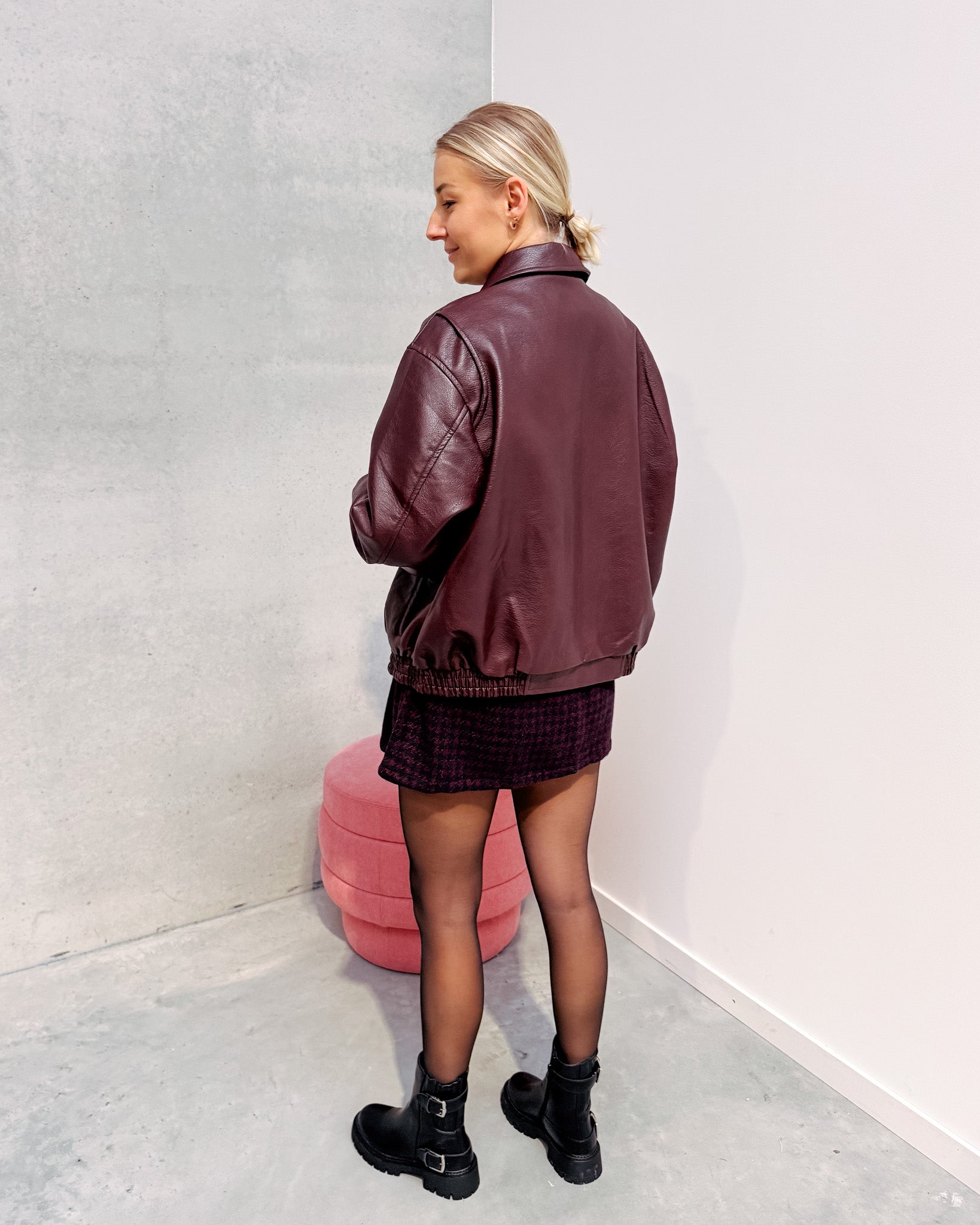 Het jasje heeft een oversized bomber model en valt iets langer. Het jasje is gemaakt van een leather look stofje in een prachtige Burgundy kleur! Dit jasje sluit met een rits en heeft handige zakjes. De onderkant van het jasje is afgewerkt met een elastiek. Wij combineerden het jasje met de ‘MIRA RUFFLE KNIT - BURGUNDY’, ‘PRETTY PLAID SKIRT - BURGUNDY/NAVY BLUE’, ‘PERFECT BLACK PANTY' & 'BLISS BUCKLE BOOTS - BLACK' samen vormen ze een perfect geheel!