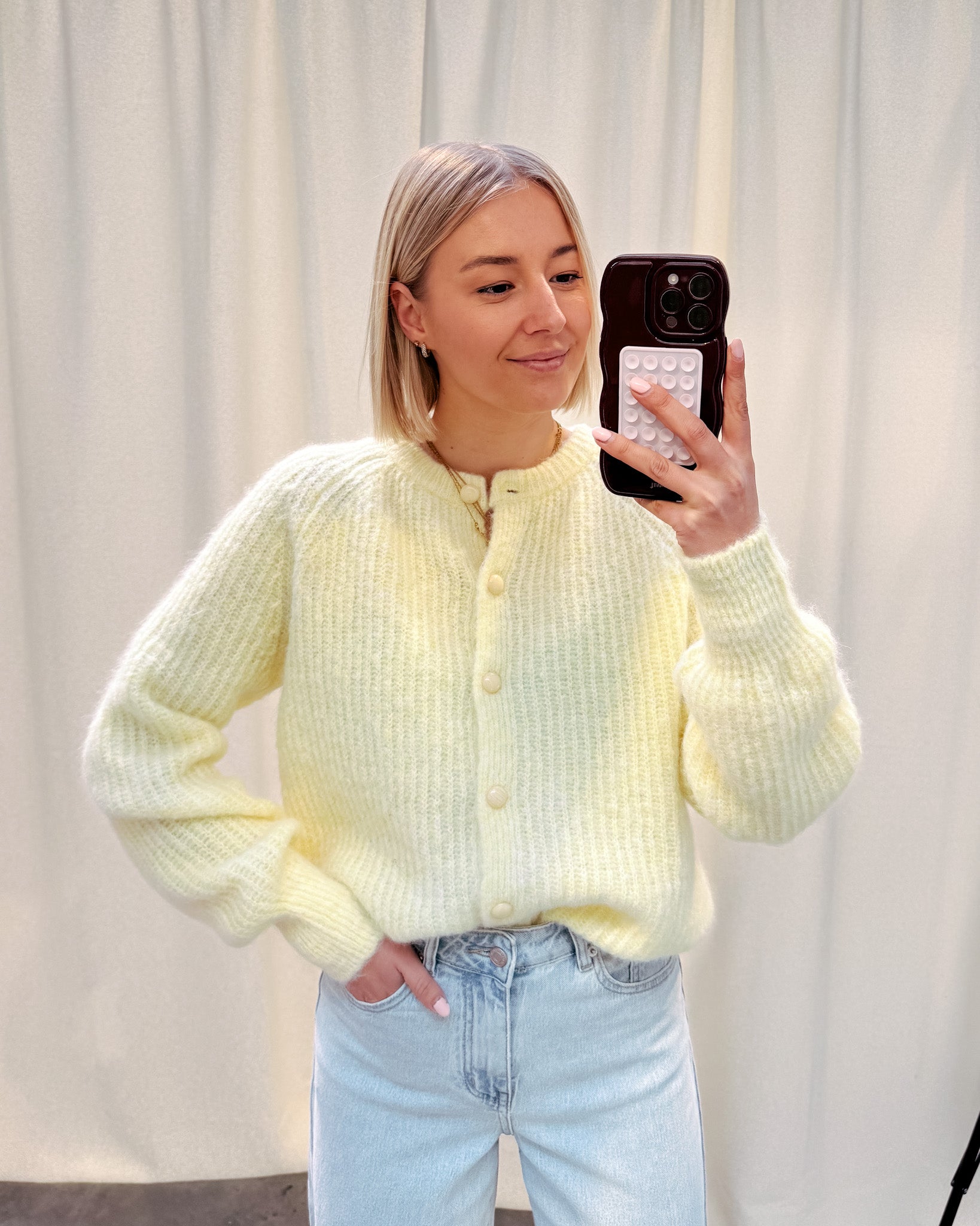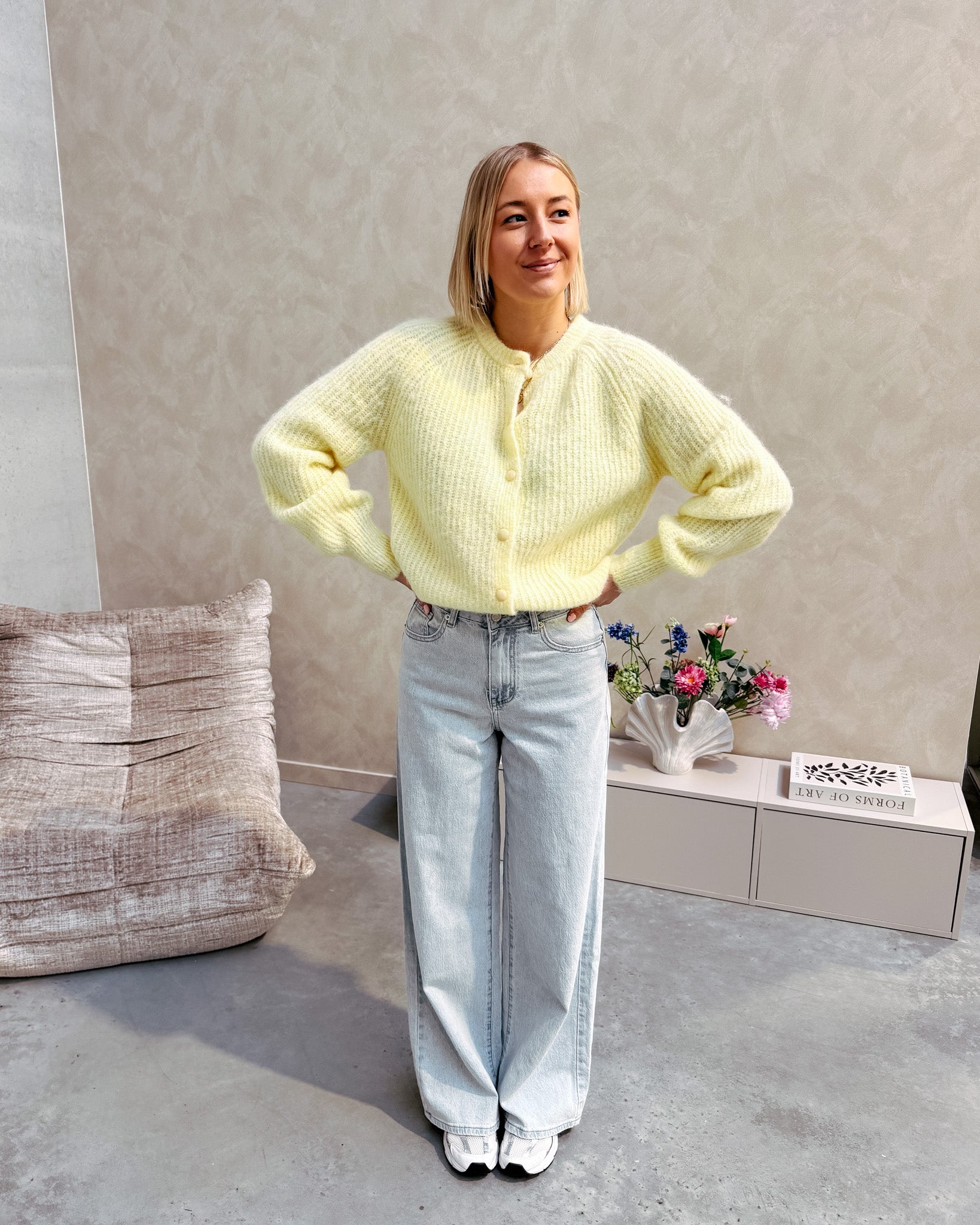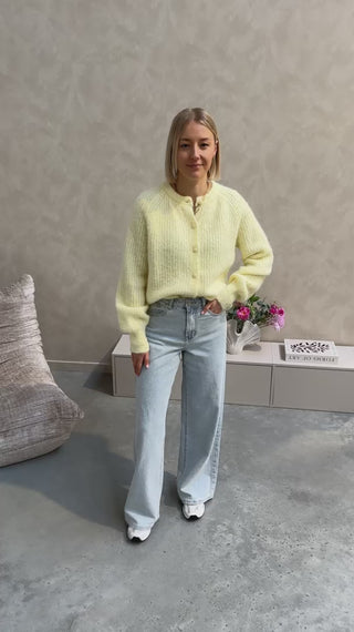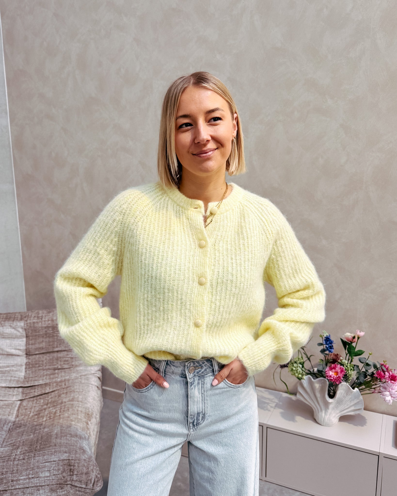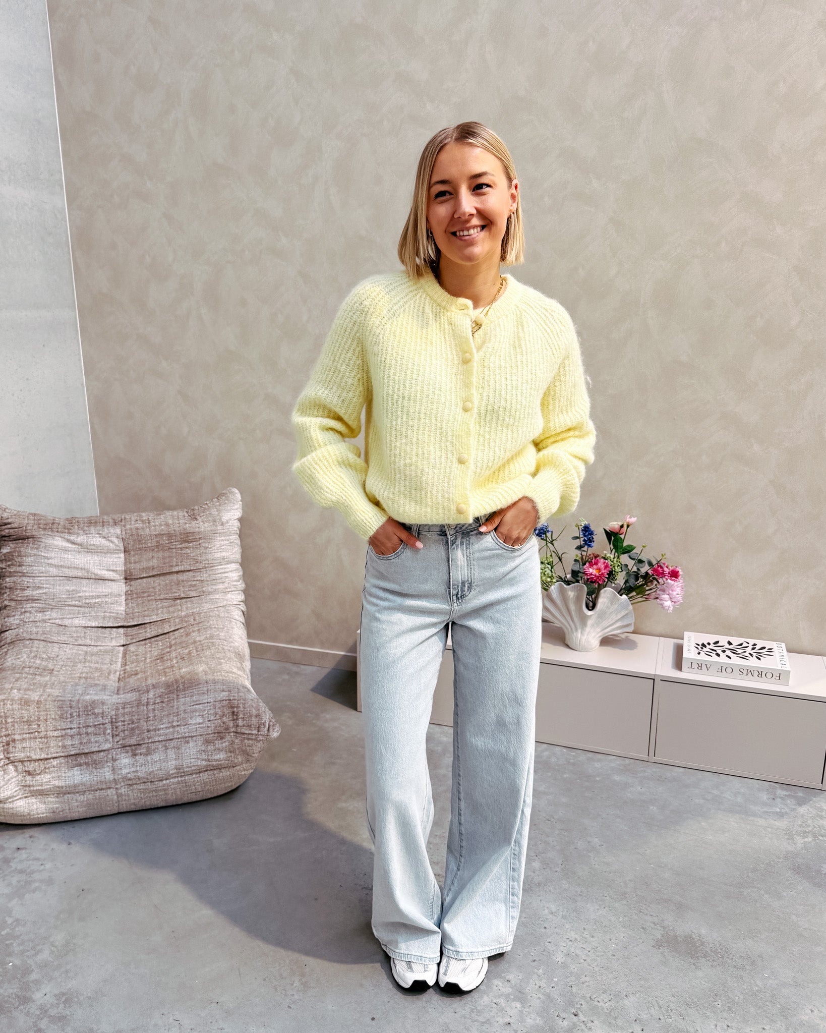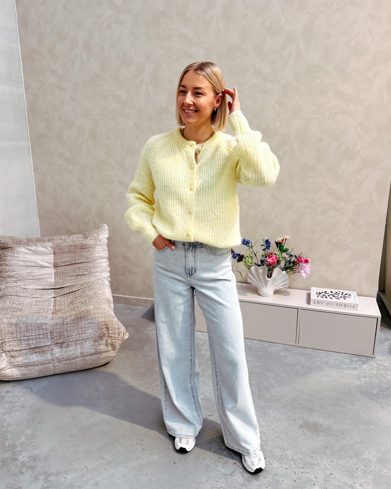 De cardigan sluit met hele mooie knopjes en heeft een prachtig lente kleurtje! Je kan deze zowel open dragen als een vestje of gesloten als een truitje. De cardigan draagt super zacht aan! Alhoewel er wol in zit, prikt deze niet! Wij combineerden de cardigan met de ‘MAUD WIDE LEG JEANS - LIGHT BLUE’ samen vormen ze een mooi geheel. We raden aan de cardigan met de hand te wassen.