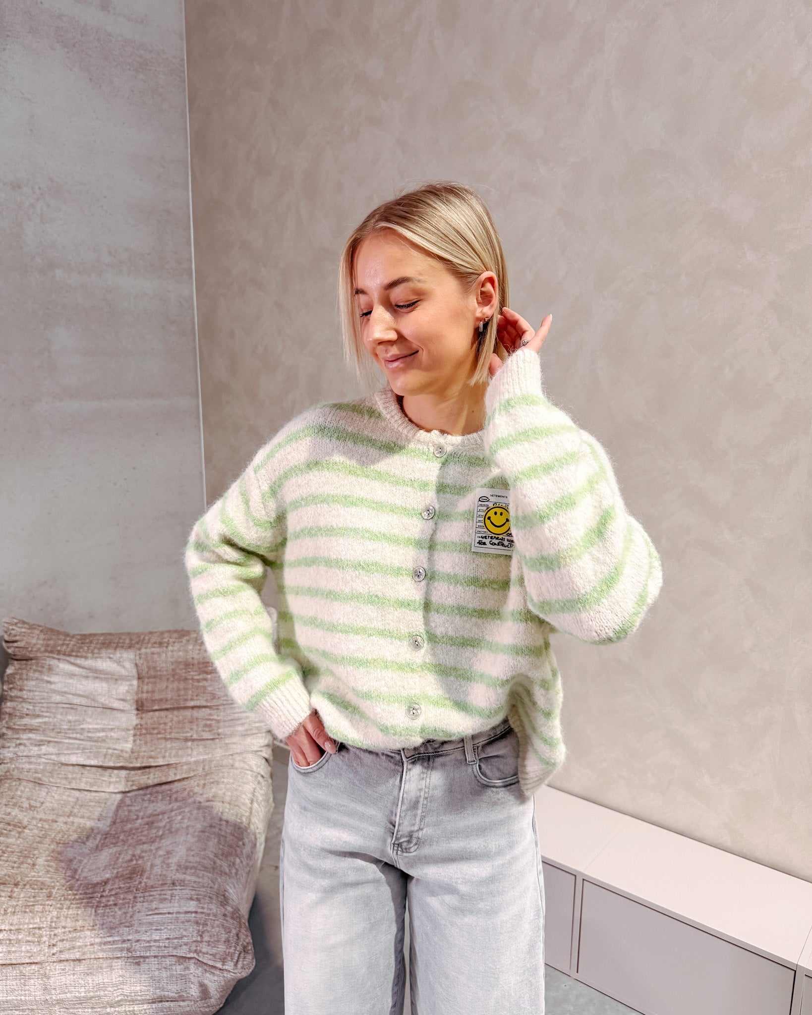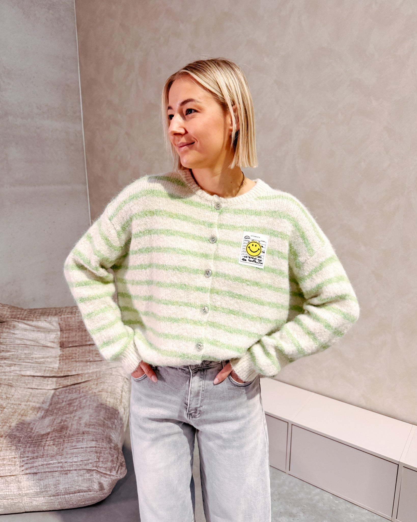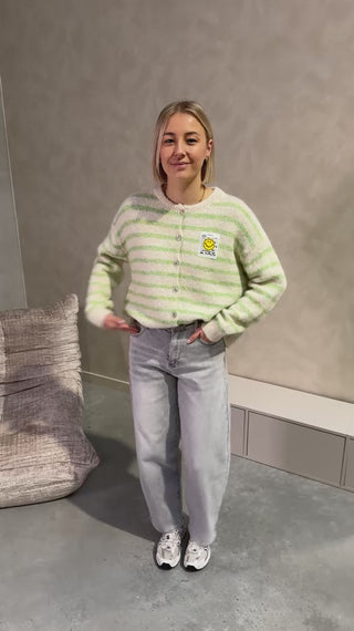 De cardigan sluit met witte knopjes. Je kan deze zowel open dragen als een vestje of gesloten als een truitje. De cardigan draagt super zacht aan! Alhoewel er wol in zit, prikt deze niet! Deze cardigan heeft een leuk streepjespatroon, ook zit er een afbeelding van een smiley op deze geeft het een extra leuke touch! Wij combineerden de cardigan met de ‘GAIA BALLOON FIT JEANS - LIGHT GREY’ samen vormen ze een mooi geheel. We raden aan de cardigan met de hand te wassen.
