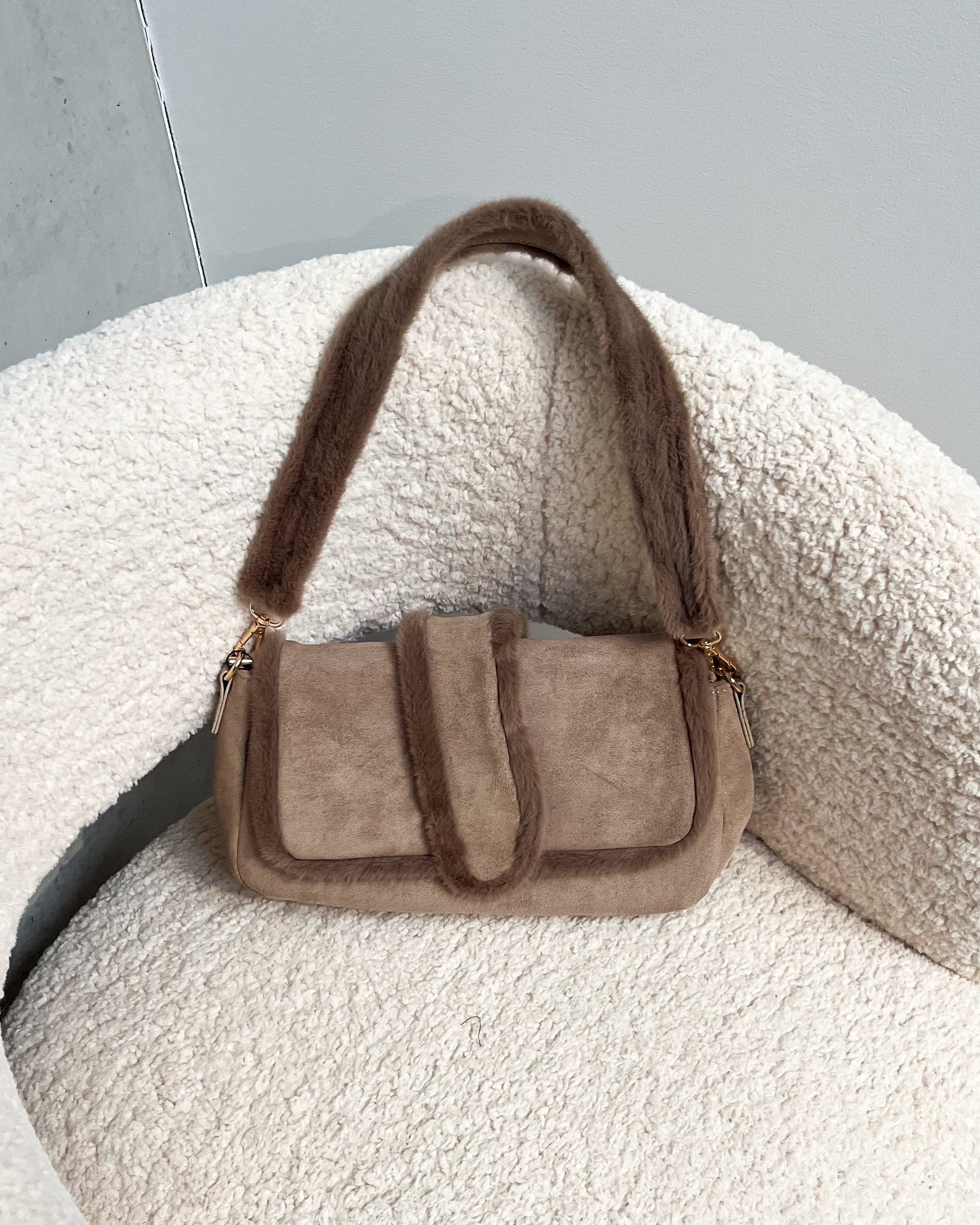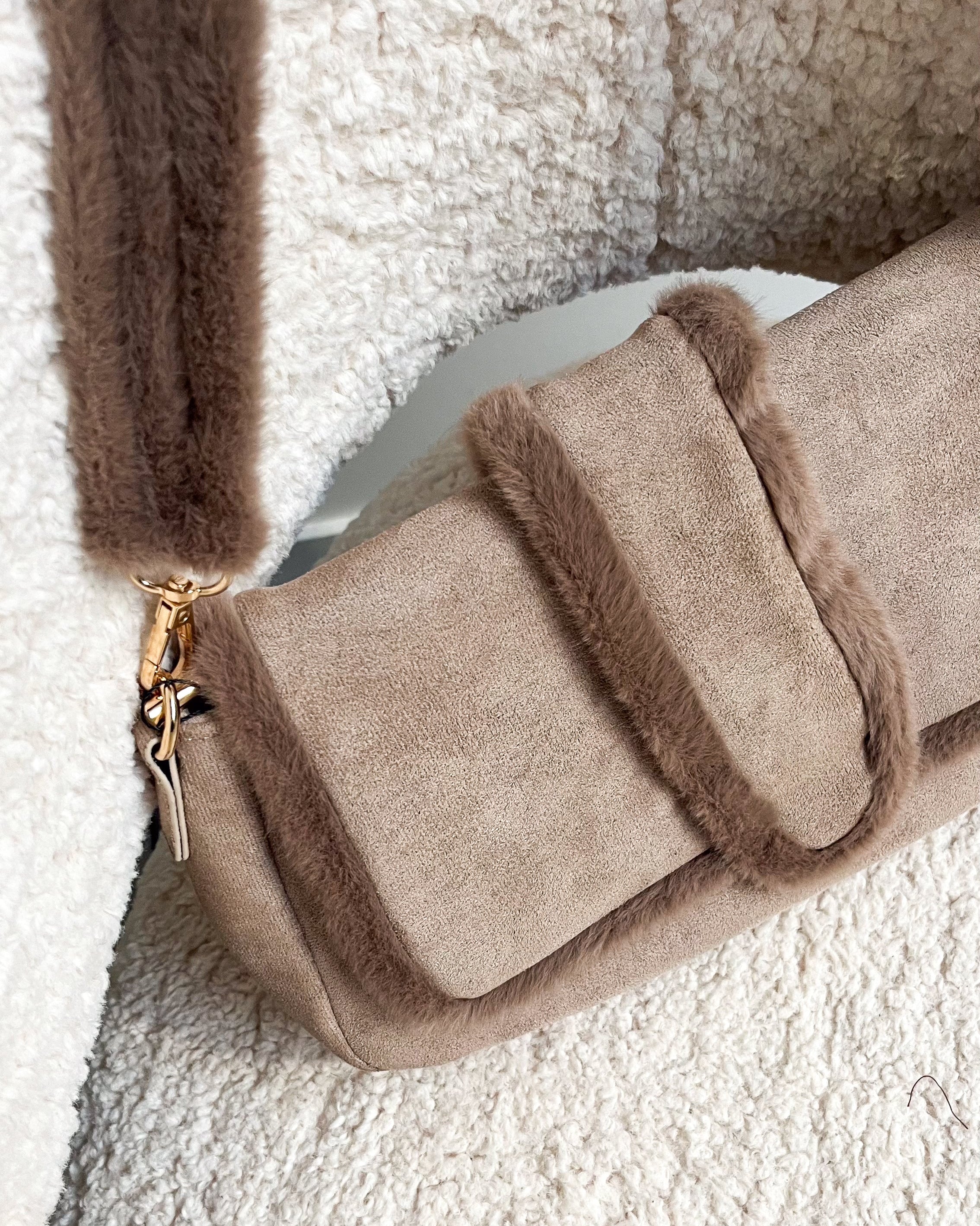 De tas heeft een hele mooie suede stof en is afgewerkt met gouden details. Ook heeft deze hele zachte fluffy accenten. Deze tas sluit met een rits en bestaat binnenin uit één vak met een zijvakje. Je kan de tas zowel crossbody dragen met de verstelbare riem, als in de hand of op de schouder.