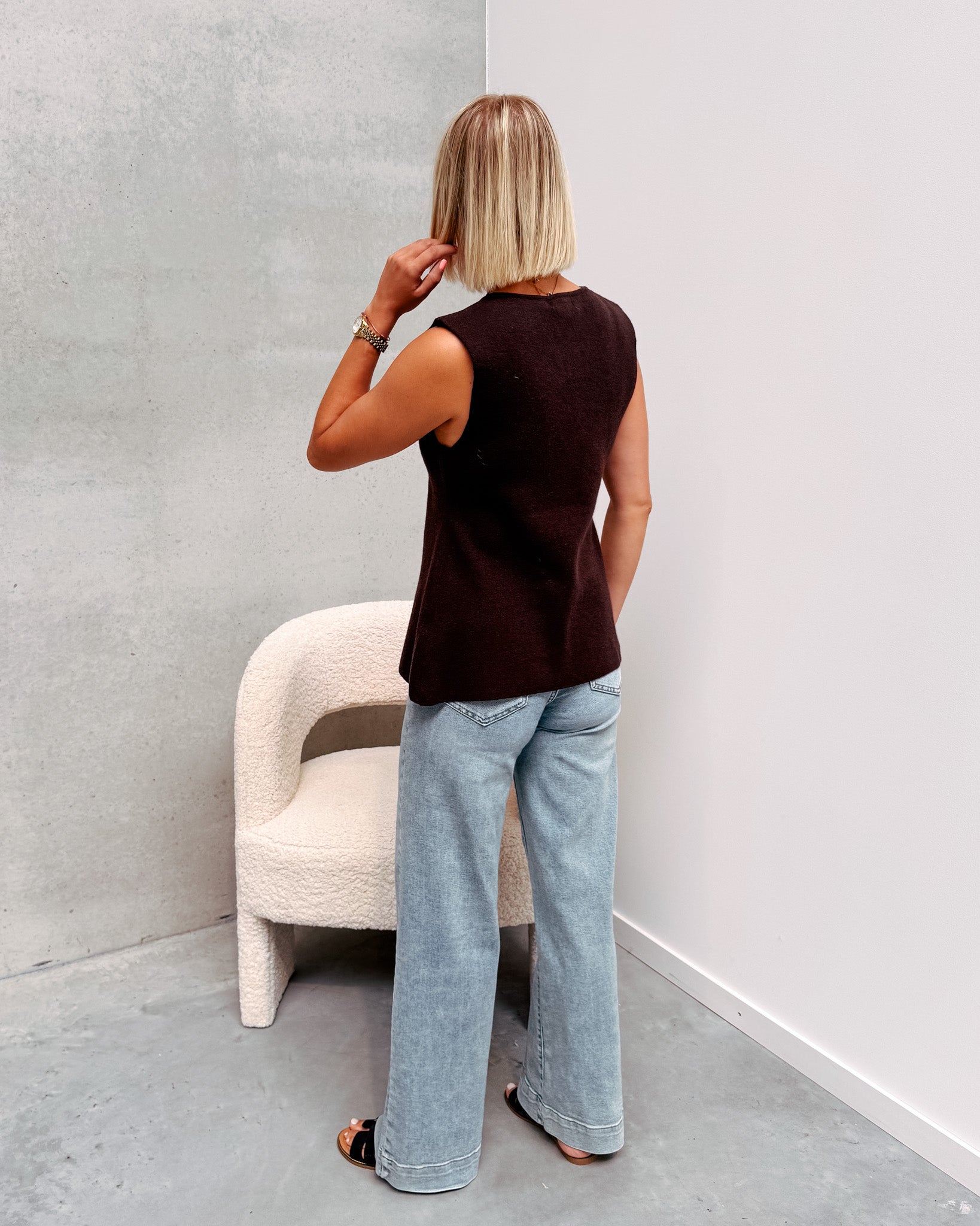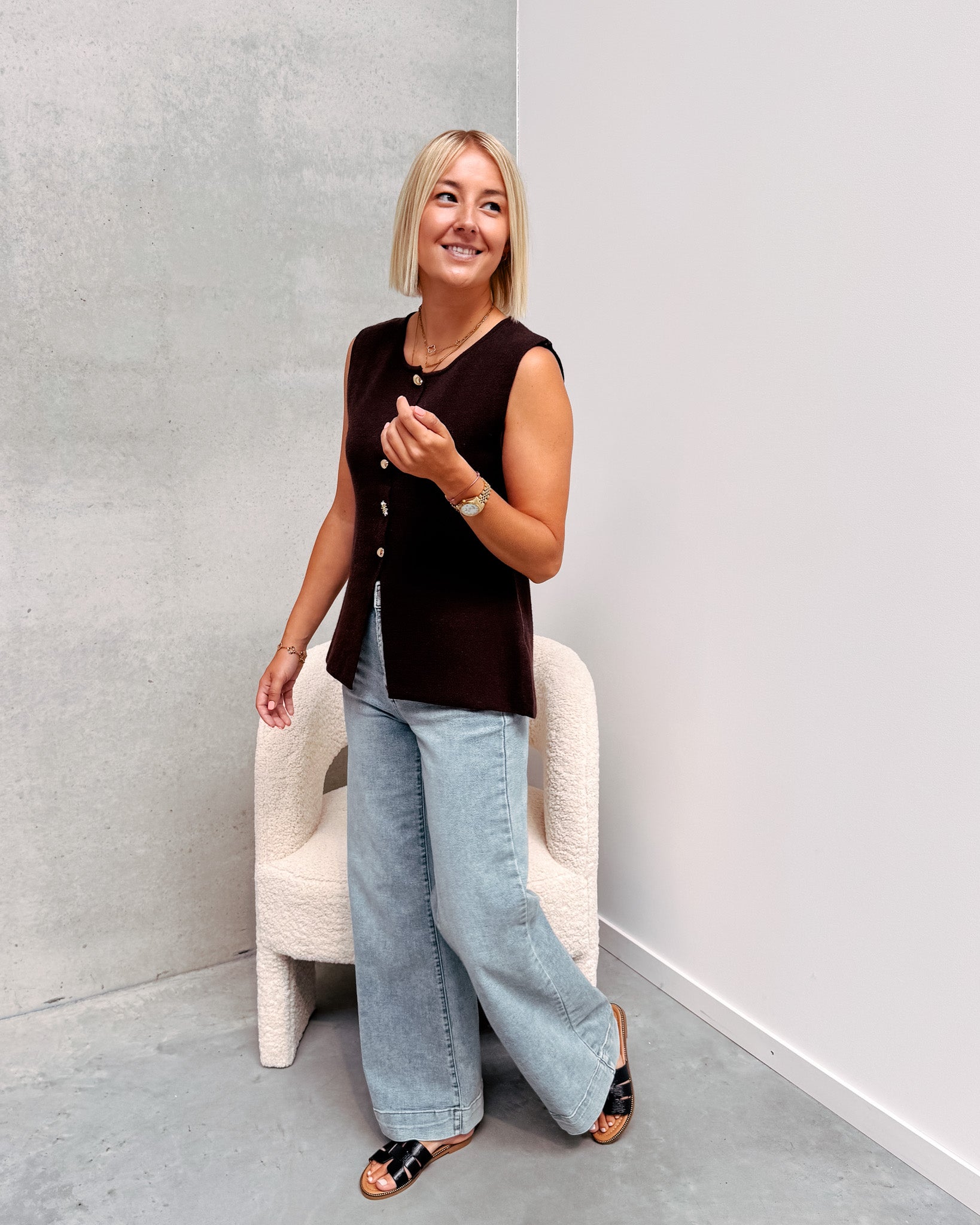 De gilet heeft een dun gebreid stofje en draagt heel zacht aan! De gilet is vooraan afgewerkt met mooie gouden knopjes. Het zijn super schattige knopjes in de vorm van een zonnetje en een ovaal. Deze gilet heeft onderaan een open uitsnede en valt iets langer. Als je de gilet met een hoge taille broek draagt is de open uitsnede niet zichtbaar. Alhoewel er wol in de gilet zit, prikt deze niet! Wij combineerden de gilet met de ‘MORANE JEANS’ en ‘HERMINE SLIPPERS - BLACK’ samen vormen ze een mooi geheel! We raden aan de gilet met de hand te wassen.
