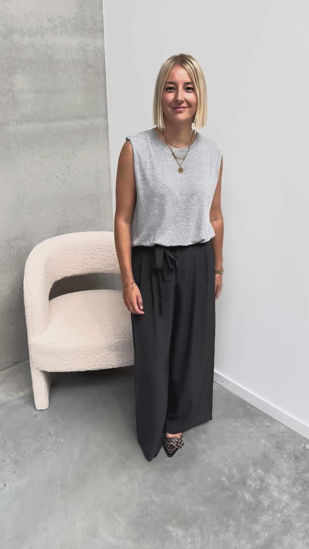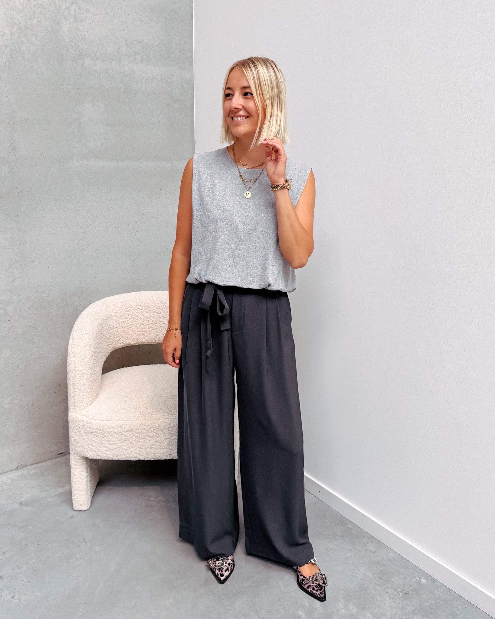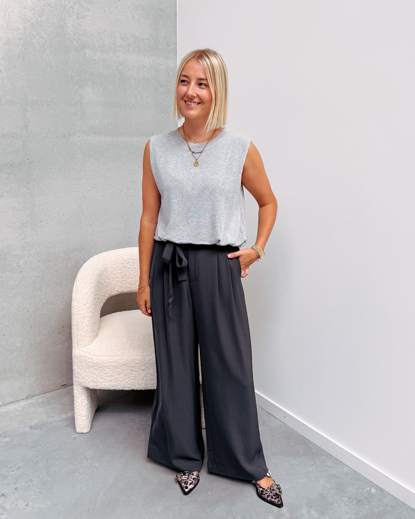 De broek sluit vooraan met een rits, achteraan heeft deze een elastische band. Ook heeft de broek vooraan een leuk geknoopt detail! Deze broek heeft een gekleed model met wijde pijpen en een hoge taille. Wij combineerden de broek met de ‘PERFECT BALLOON TOP - GREY’ en ‘LEO SLINGBACKS’ samen vormen ze een perfect geheel! We raden aan de broek met de hand te wassen.