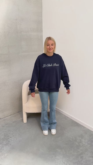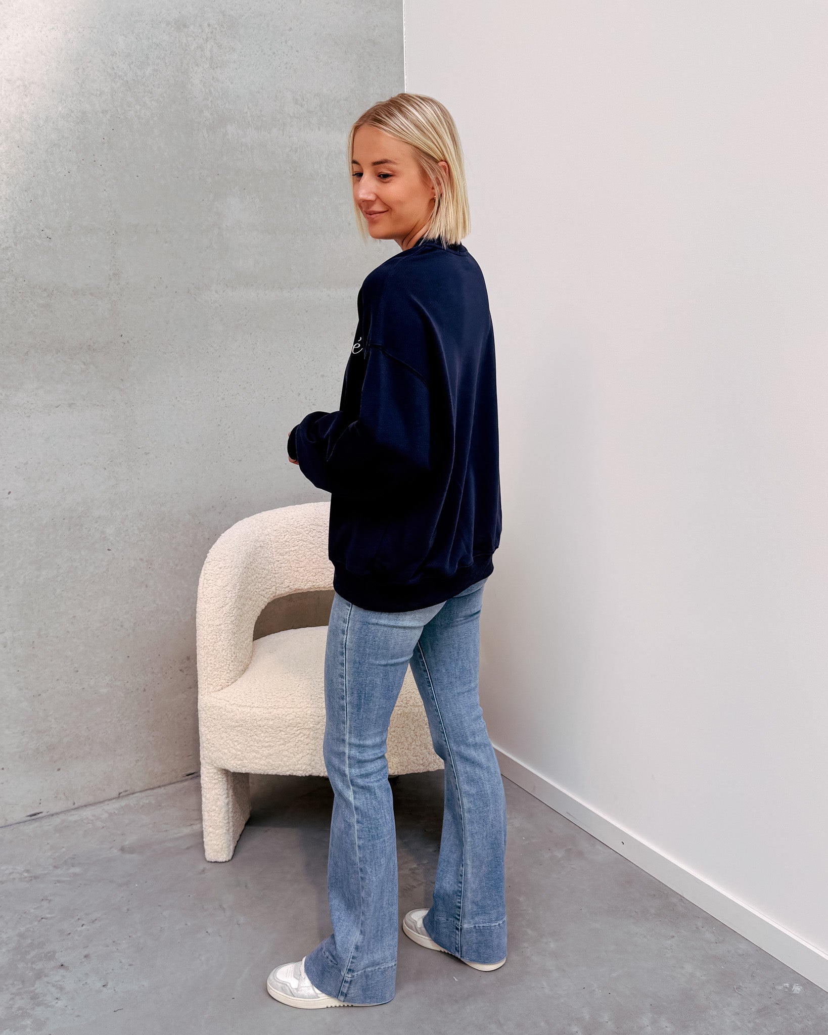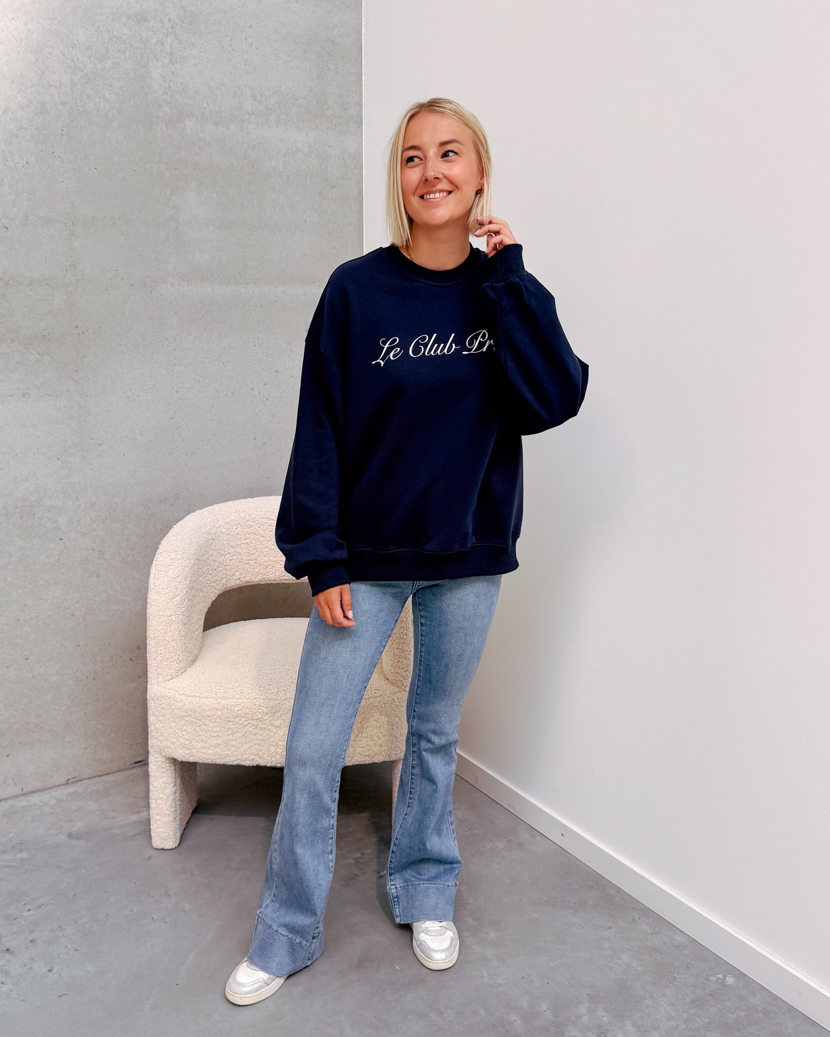 De broek heeft een hoge taille met een flared effect, bovenaan strak en onderaan wijde pijpen. Er zit veel stretch in de jeans wat het heel aangenaam maakt om te dragen! Deze jeans heeft een hele mooi blauwe kleur. Wij combineerden de jeans met de ‘LE CLUB PRIVÉ SWEATER - BLUE‘ samen vormen ze een mooi geheel.