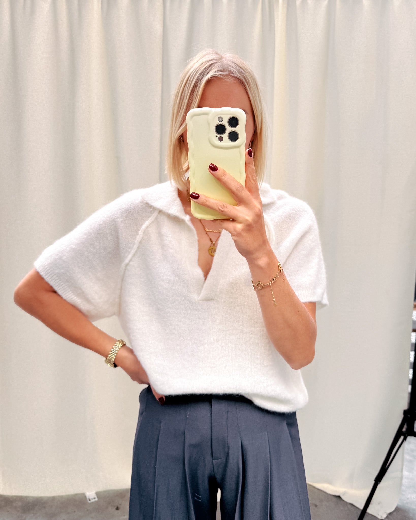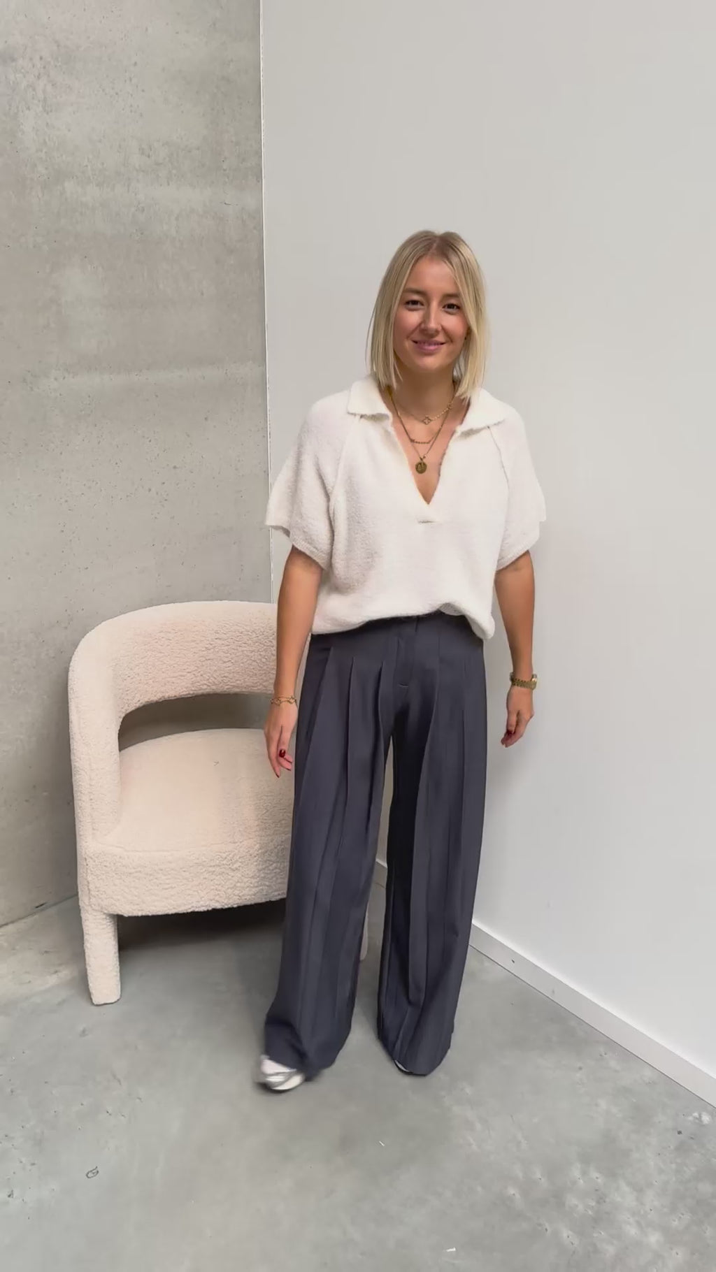Deze trui heeft een korte mouw met een polo kraagje. Ook heeft het een leuke afwerking met de naden. De trui draagt heel zacht aan. Alhoewel er wol in zit, prikt deze niet! Wij combineerden de trui met de ‘GOOD GIRL TROUSERS - GREY’ samen vormen ze een perfect match!