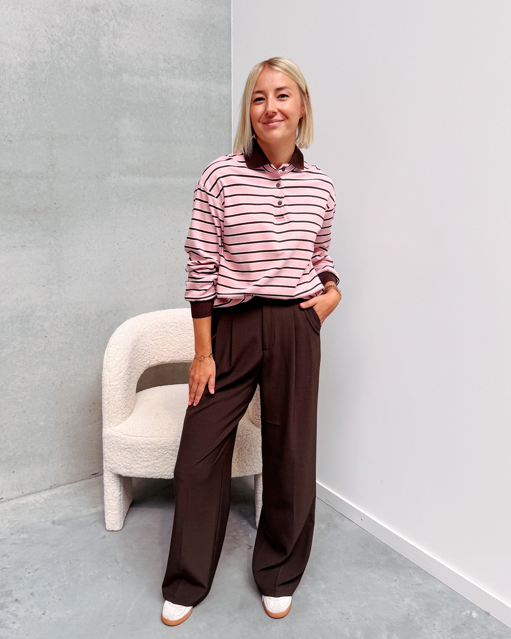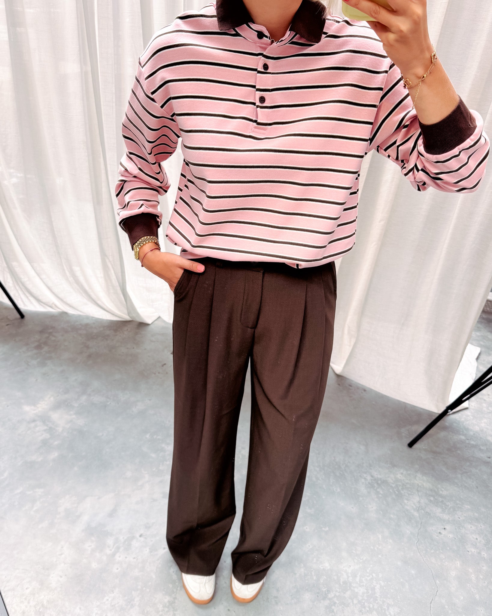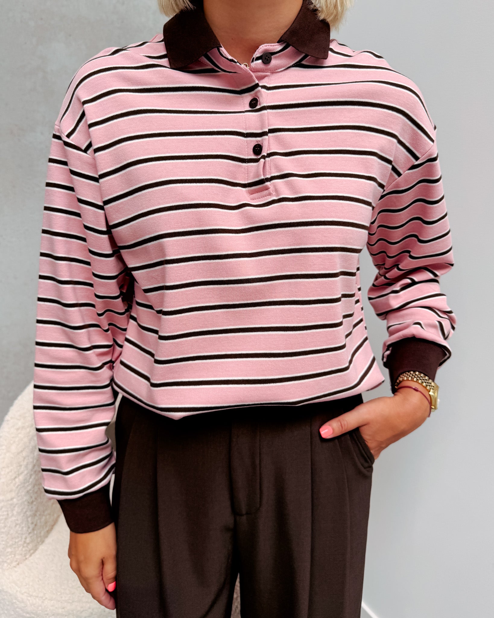 Het polo truitje heeft een dun stofje, deze kan je ideaal nu al dragen! Dit truitje heeft een leuk bruin streepjespatroon met licht roze! De trui is afgewerkt met een bruin polo kraagje en een bruin detail aan de mouwen. Wij combineerden de trui met de ‘TAILORED PANT - BROWN’ samen vormen ze een perfect match! We raden aan de trui met de hand te wassen.