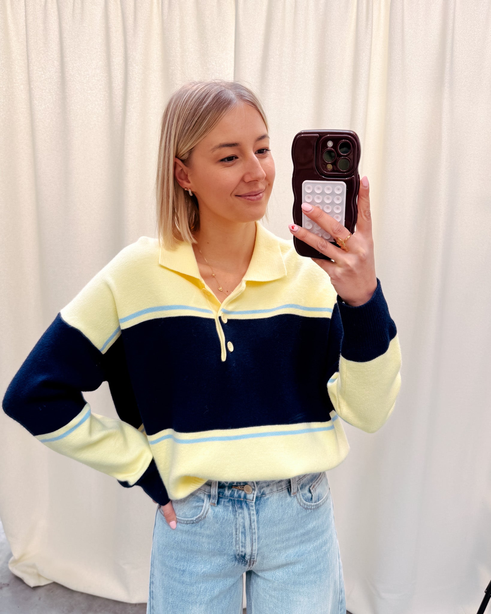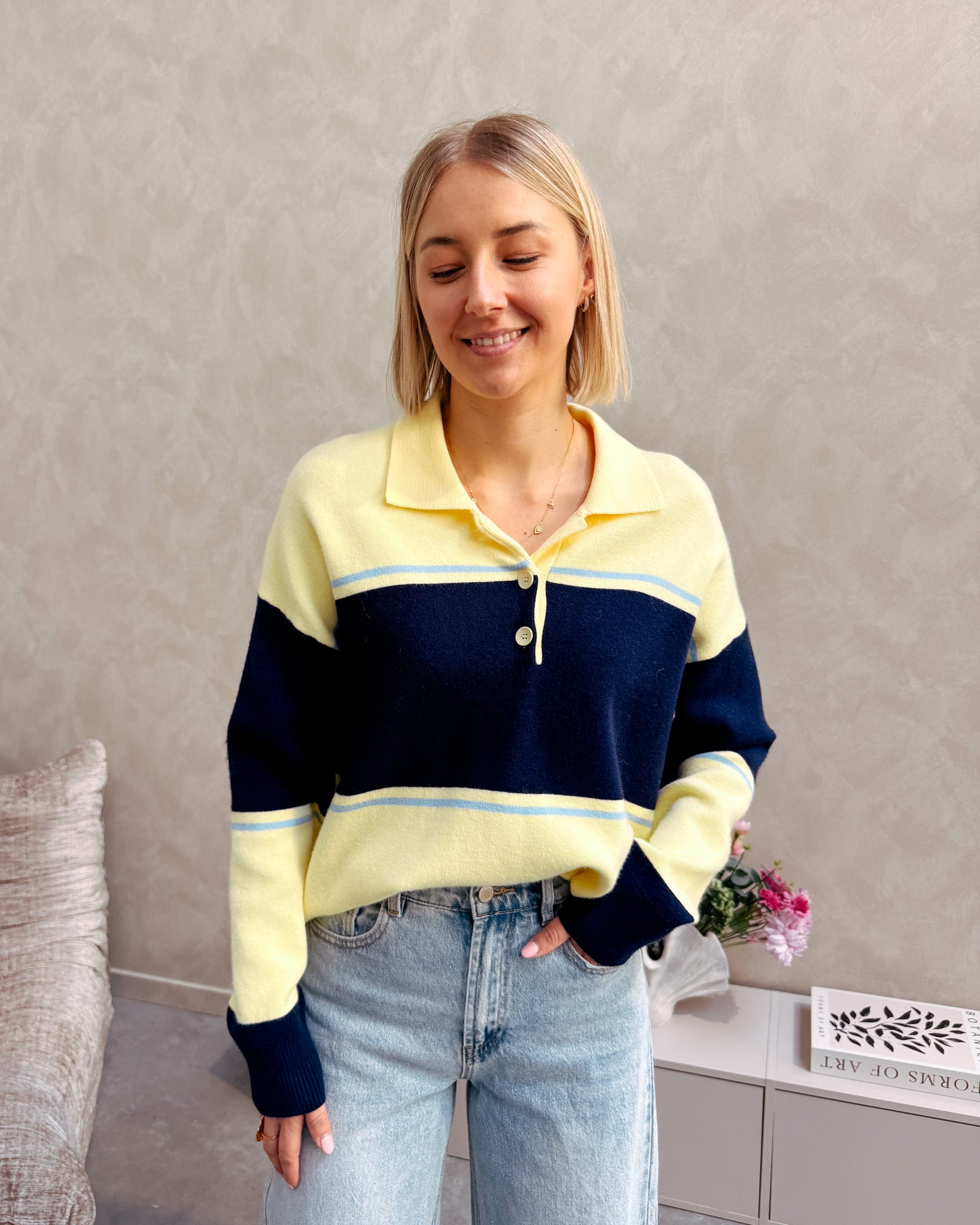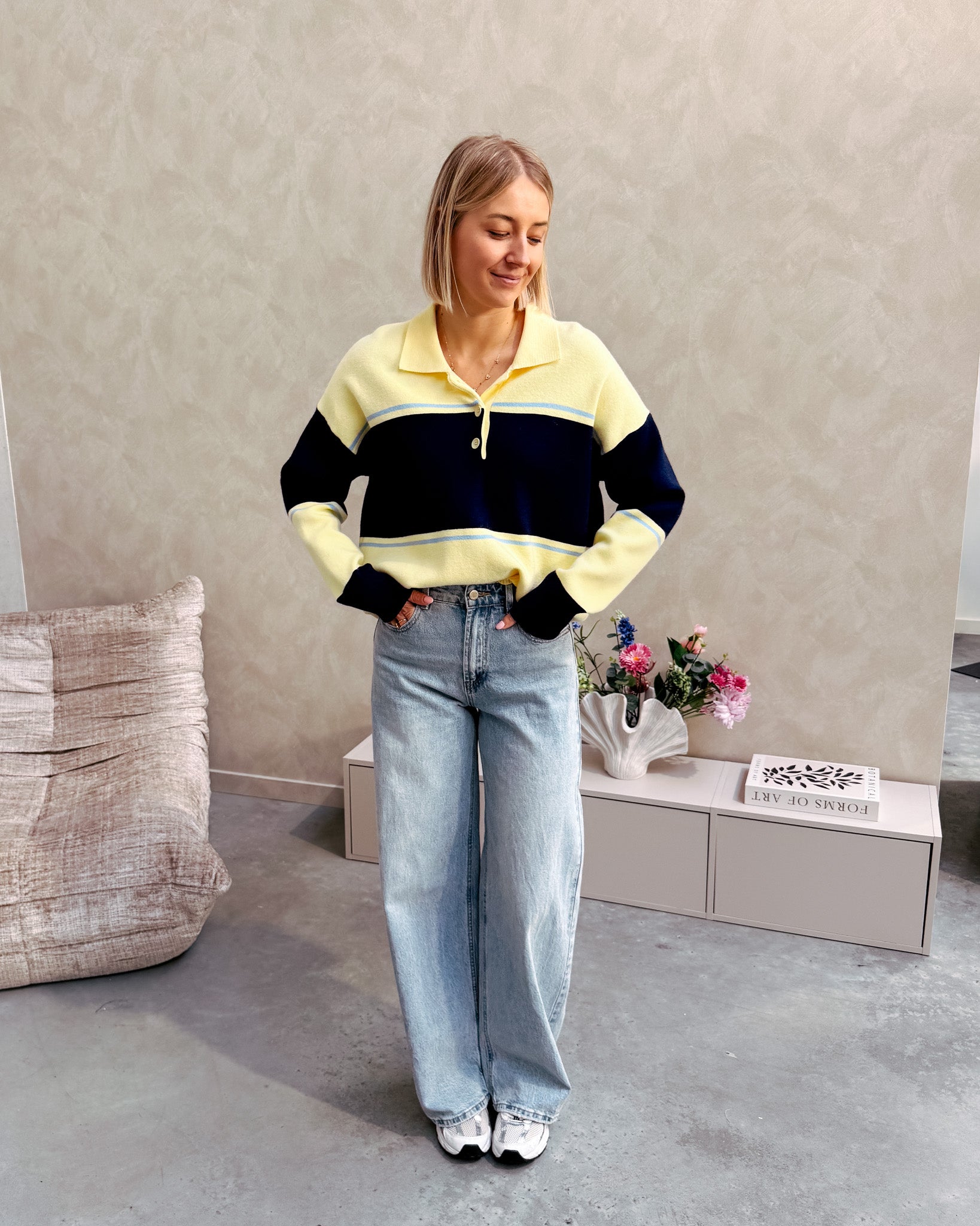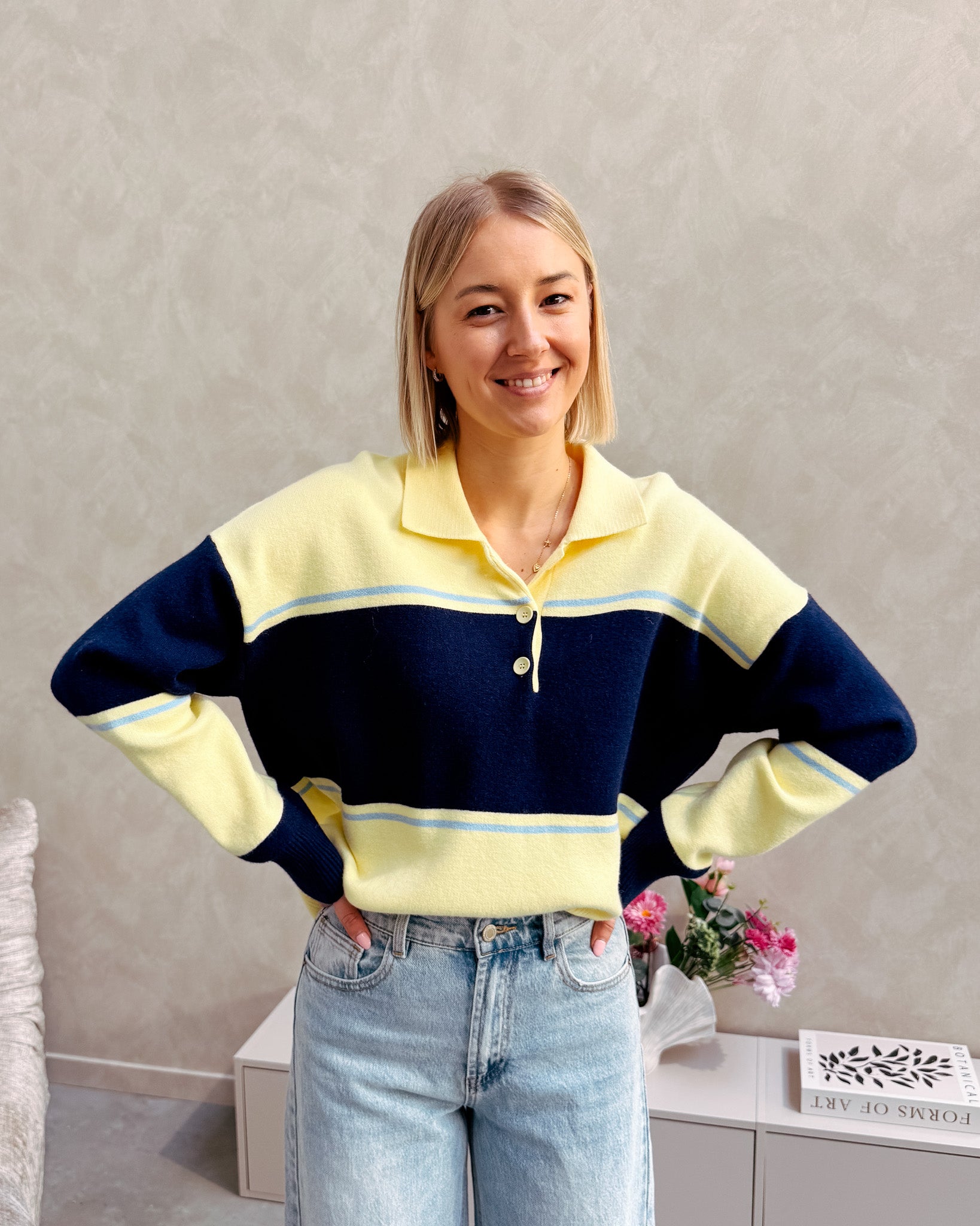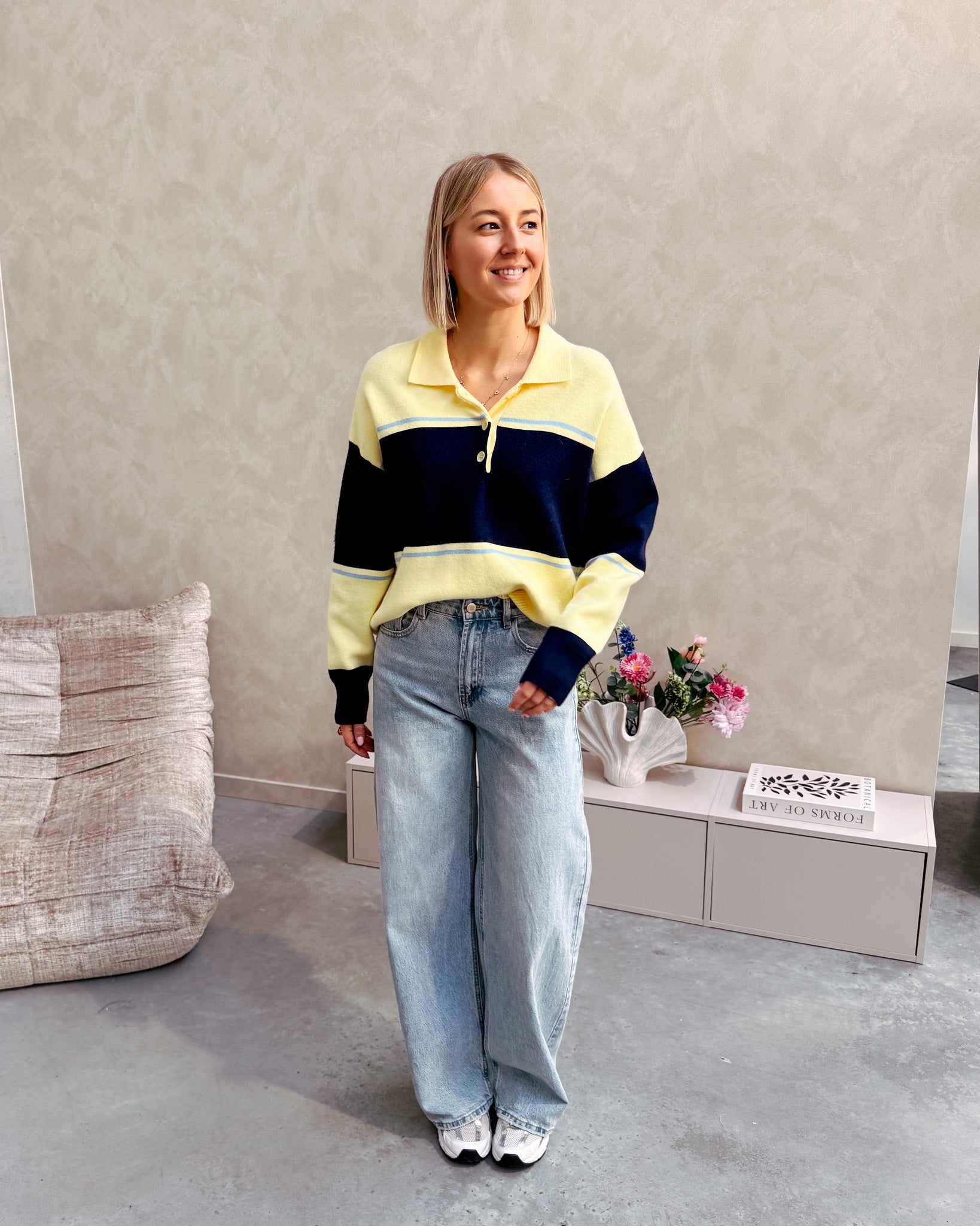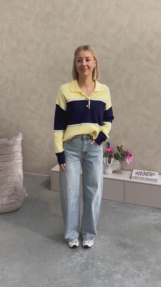 De trui heeft een los model, deze is vooraan afgewerkt met een polo kraagje en gele knopjes. Alhoewel er wol in de trui zit, prikt deze niet! Wij combineerden de trui met de ‘BOWIE BAGGY BALLOON FIT JEANS - LIGHT BLUE’ samen vormen ze een perfect match! We raden aan de trui met de hand te wassen.