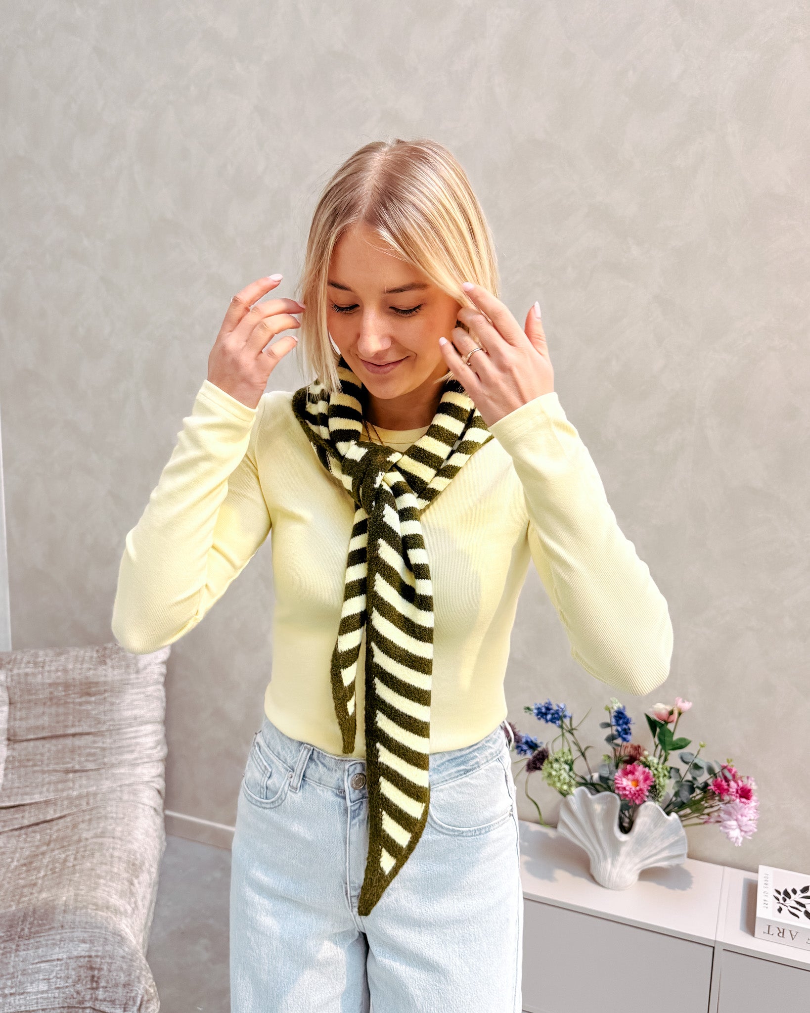 Deze korte sjaal met een speelse en veelzijdige vorm, perfect om je outfit een subtiele en modieuze touch te geven. Het toffe streepjesmotief geeft het nog een extra touch! Het sjaaltje kan perfect gedragen worden op een trui, blazer of jas. Style je look in één knoop! Alhoewel er wol in zit, prikt deze sjaal niet! Wij combineerden de sjaal met de 'MAREN BUTTERCUP LONGSLEEVE' en 'MAUD WIDE LEG JEANS - LIGHT BLUE' samen vormen ze een perfect match! We raden aan het sjaaltje met de hand te wassen.