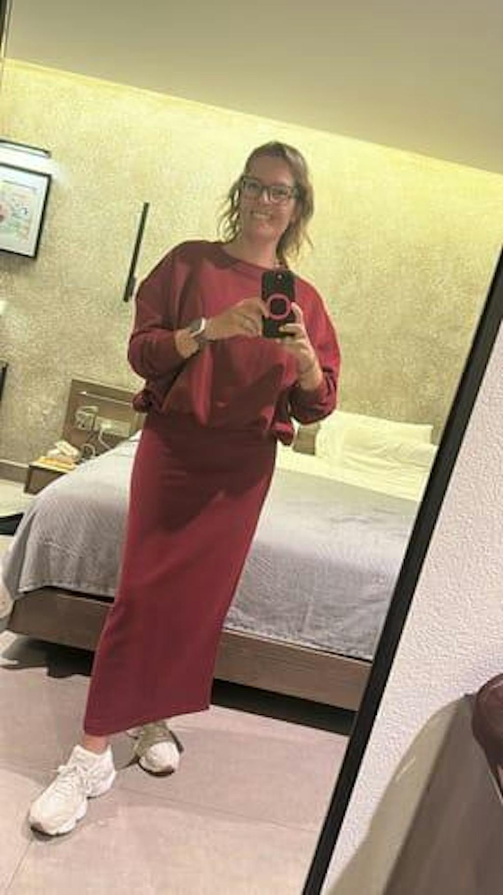De rok heeft bovenaan een elastische band en zit heel comfortabel aan. Achteraan heeft de rok een split, deze geeft het een leuk detail! Je zou de rok ook kunnen omdraaien en zo dragen dat de split vooraan zit. Wij combineerden de rok met de matching ‘NIKKI BALLOON SWEATER - BURGUNDY’ samen vormen ze een mooi geheel! Je kan de rok zeker ook combineren met een toffe blouse/shirt!