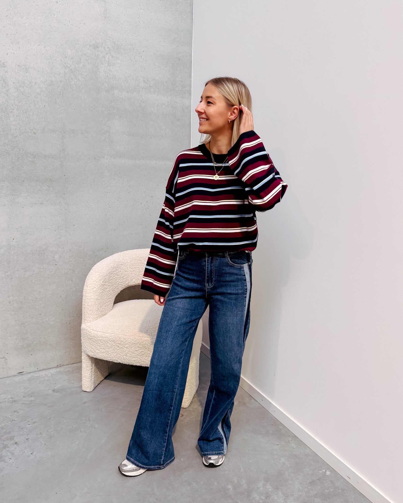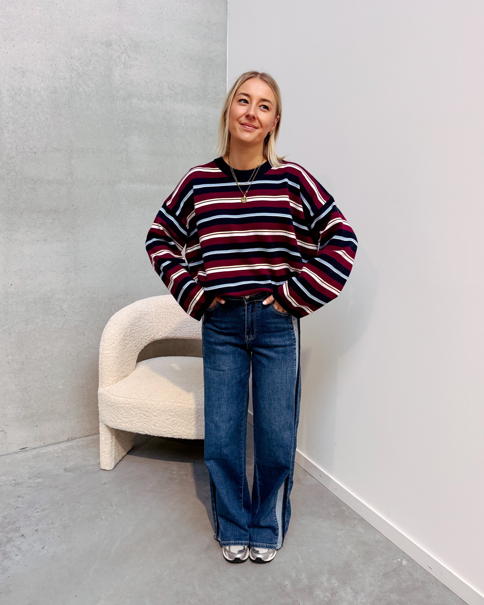 De trui heeft een oversized model en valt iets langer. Ook heeft het brede mouwen. Deze trui heeft een tof streepjespatroon met vele mooie kleurtjes, zo kan deze trui op veel onderstukken gecombineerd worden. Alhoewel er wol in de trui zit, prikt deze niet! Wij combineerden de trui met de ‘METRO STRIPE DENIM JEANS - BLUE’ samen vormen ze een mooi geheel. We raden aan de trui met de hand te wassen.