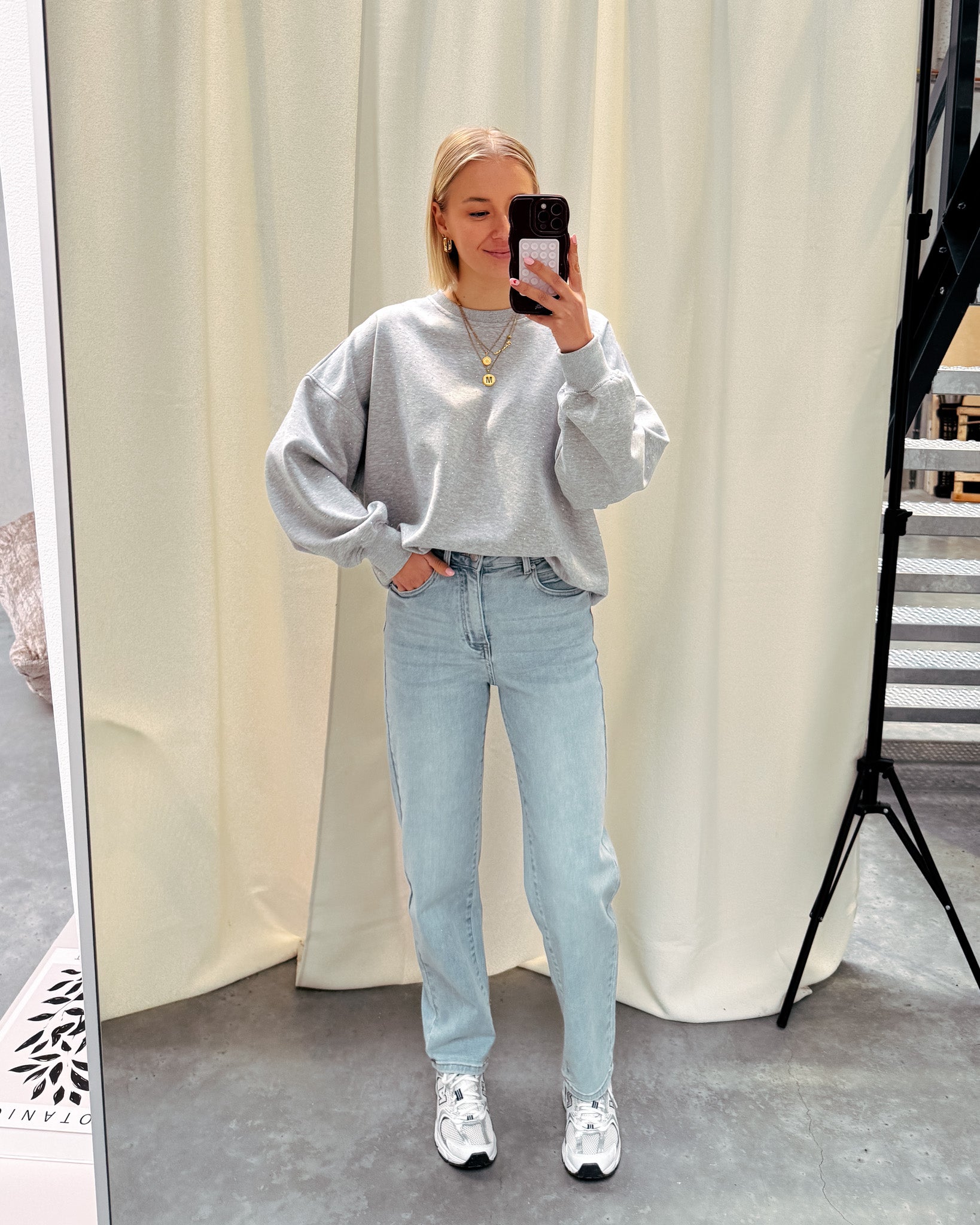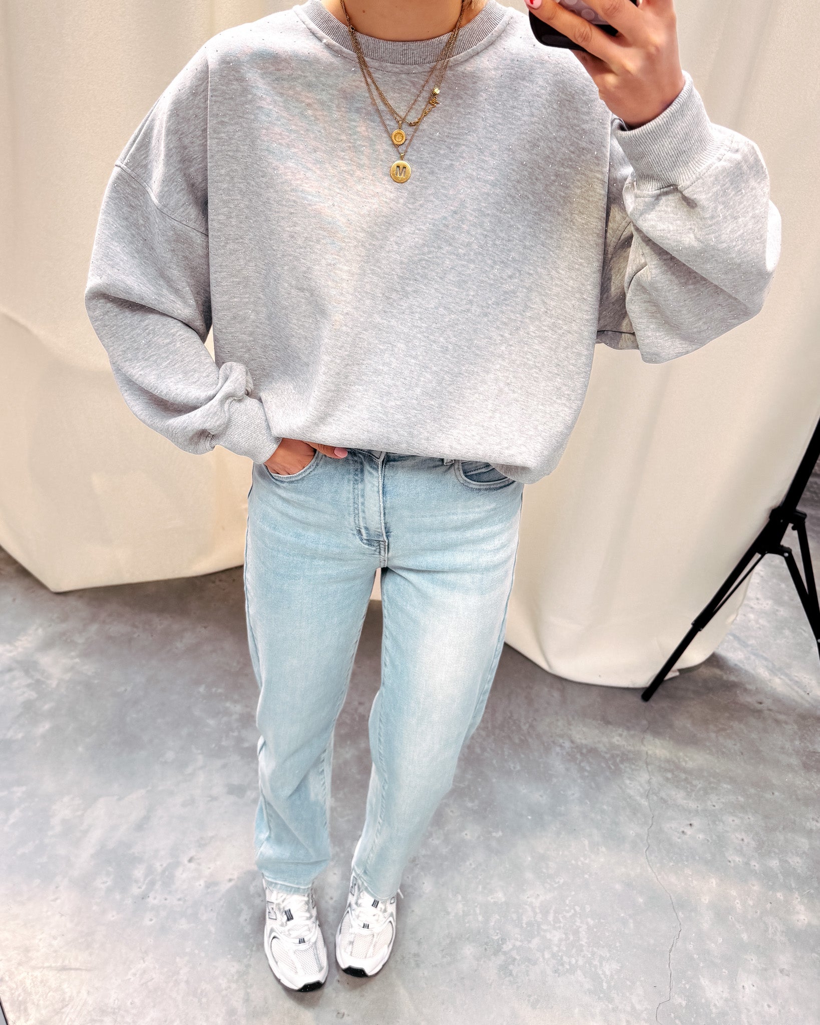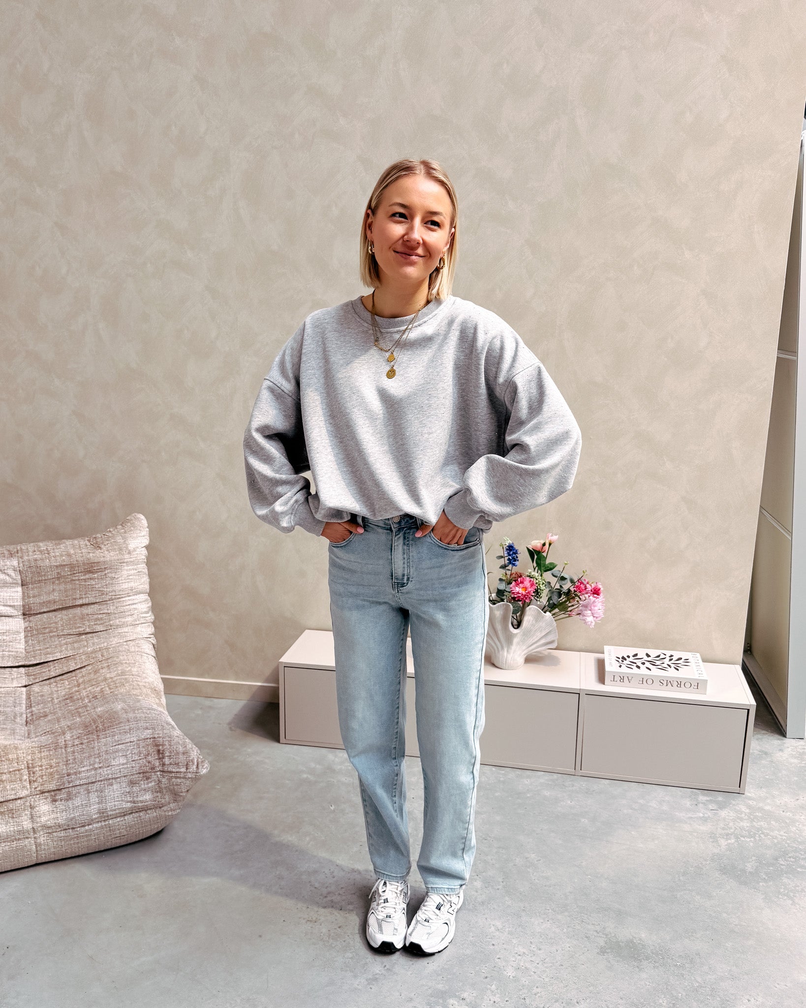 De sweater heeft een oversized model en valt los. Deze sweater is verwerkt met zilveren strass steentjes, zowel voor als achteraan en op de mouwen. Wij combineerden de sweater met de ‘ZOEY MOM JEANS - LIGHT BLUE’ samen vormen ze een mooi geheel! We raden aan om de sweater met de hand te wassen.