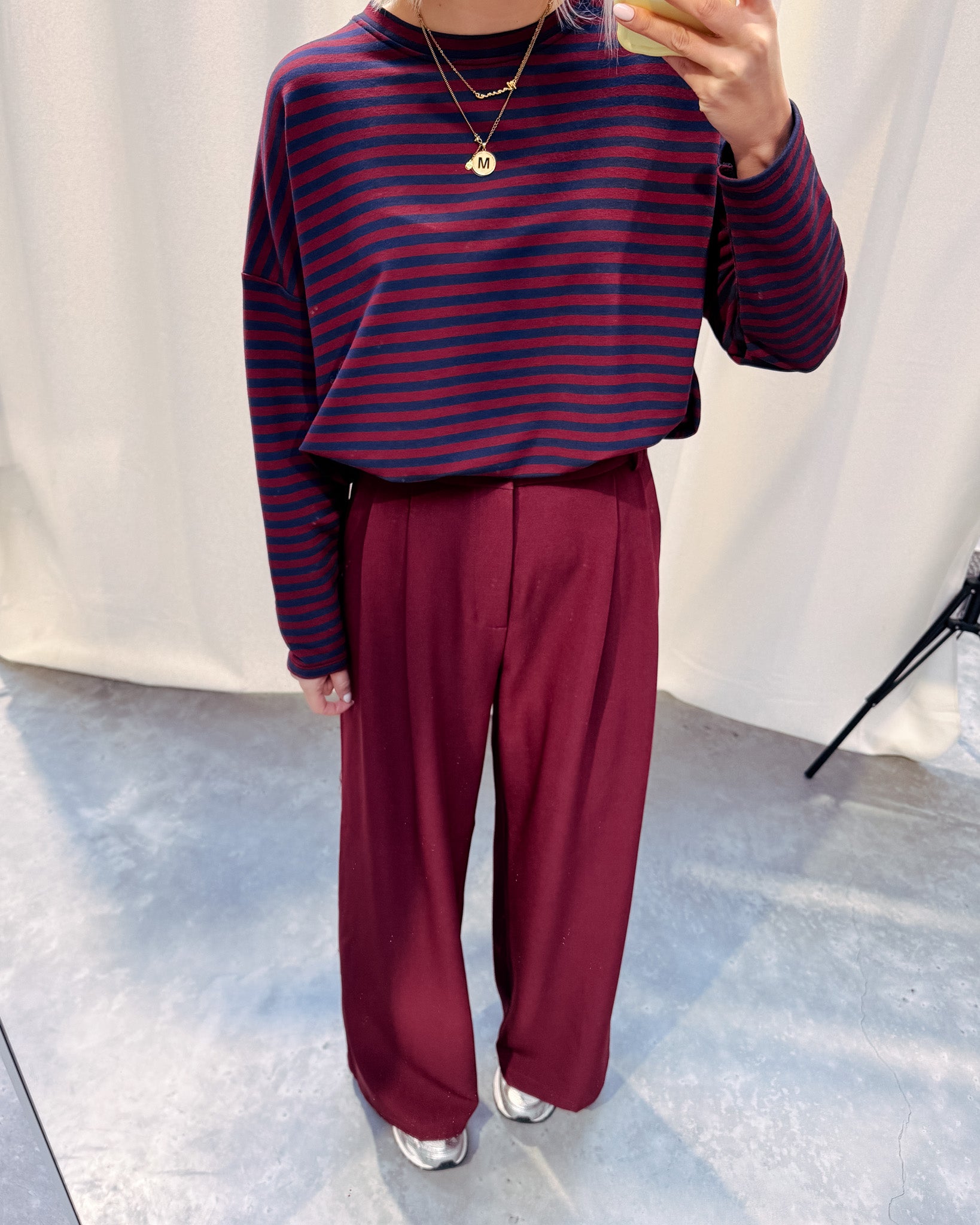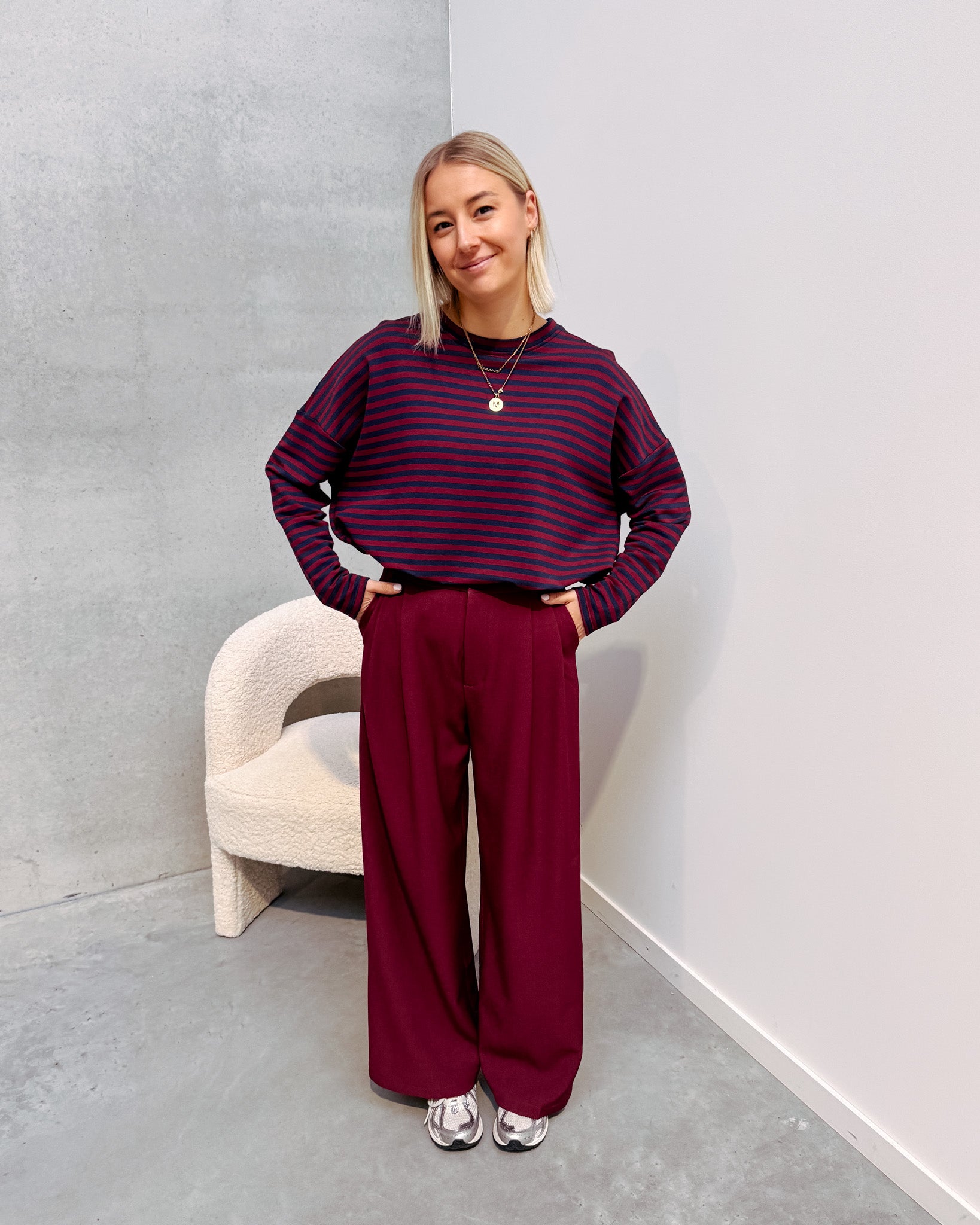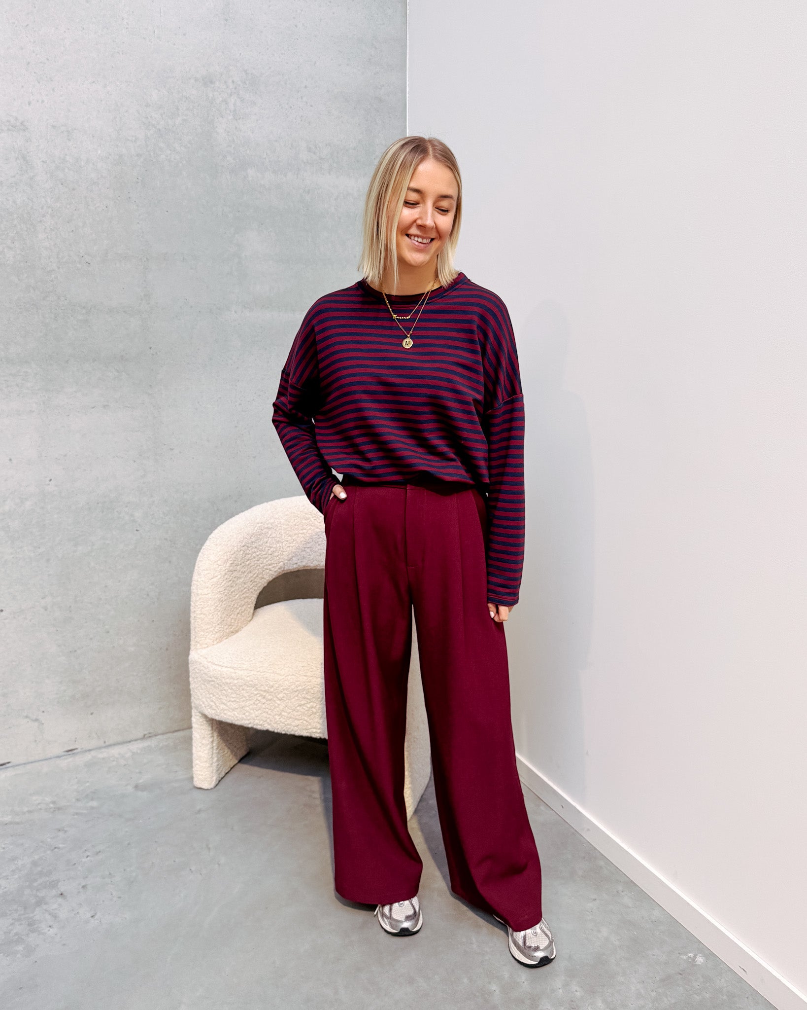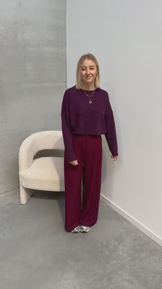 Het shirt heeft een oversized model met een tof streepjespatroon met een bordeaux touch! Wij combineerden het shirt met de ‘EMILIA TAILORED TROUSERS - BURGUNDY’ samen vormen ze een mooi geheel. Dit shirt combineert ook heel leuk met een jeans!