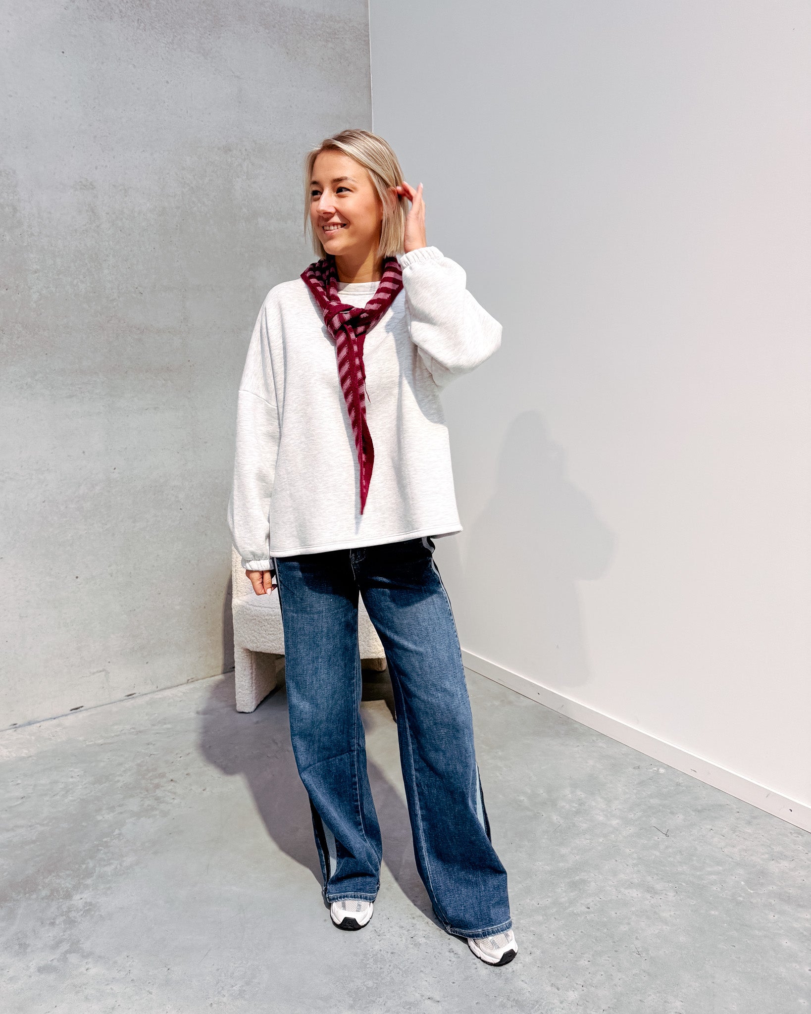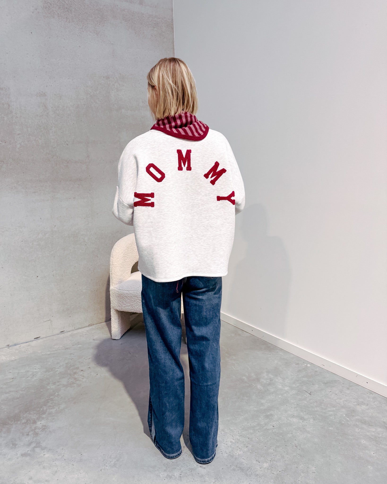 De sweater heeft een oversized model met zachte fleece stof binnen. Deze sweater draagt super zacht & comfortabel aan! Aan de mouwen zit er een elastiek, deze geven het een poofy detail! Op de sweater staat achteraan de tekst ‘MOMMY’ in bordeaux letters, deze geven een extra leuk detail aan de trui! Mom life, but make it comfy. Deze mommy sweater is jouw nieuwe favoriet voor elke dag – zacht, relaxed en met een knipoog. De perfecte mix van comfort en stijl voor elke mama! Wij combineerden de sweater met de ‘METRO STRIPE DENIM JEANS - BLUE’ samen vormen ze een perfect geheel!