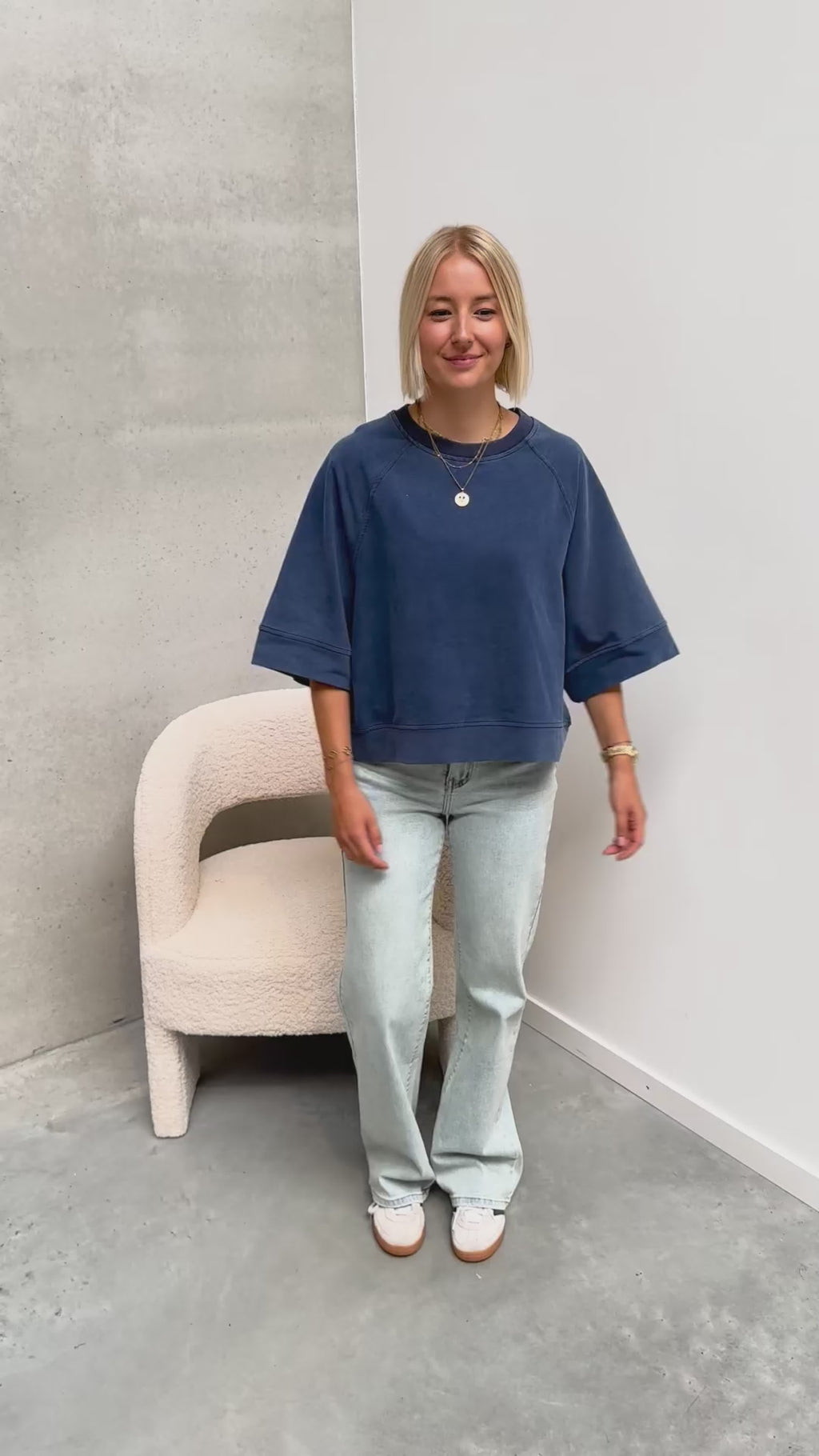 Het shirt heeft een los model met brede 3/4 mouwen. Dit shirt valt oversized en zit heel aangenaam aan. Het shirt heeft een afgewassen look! Wij combineerden het shirt met de ‘JAMIE WIDE JEANS’ samen vormen ze een mooi geheel. We raden aan het shirt met de hand te wassen.