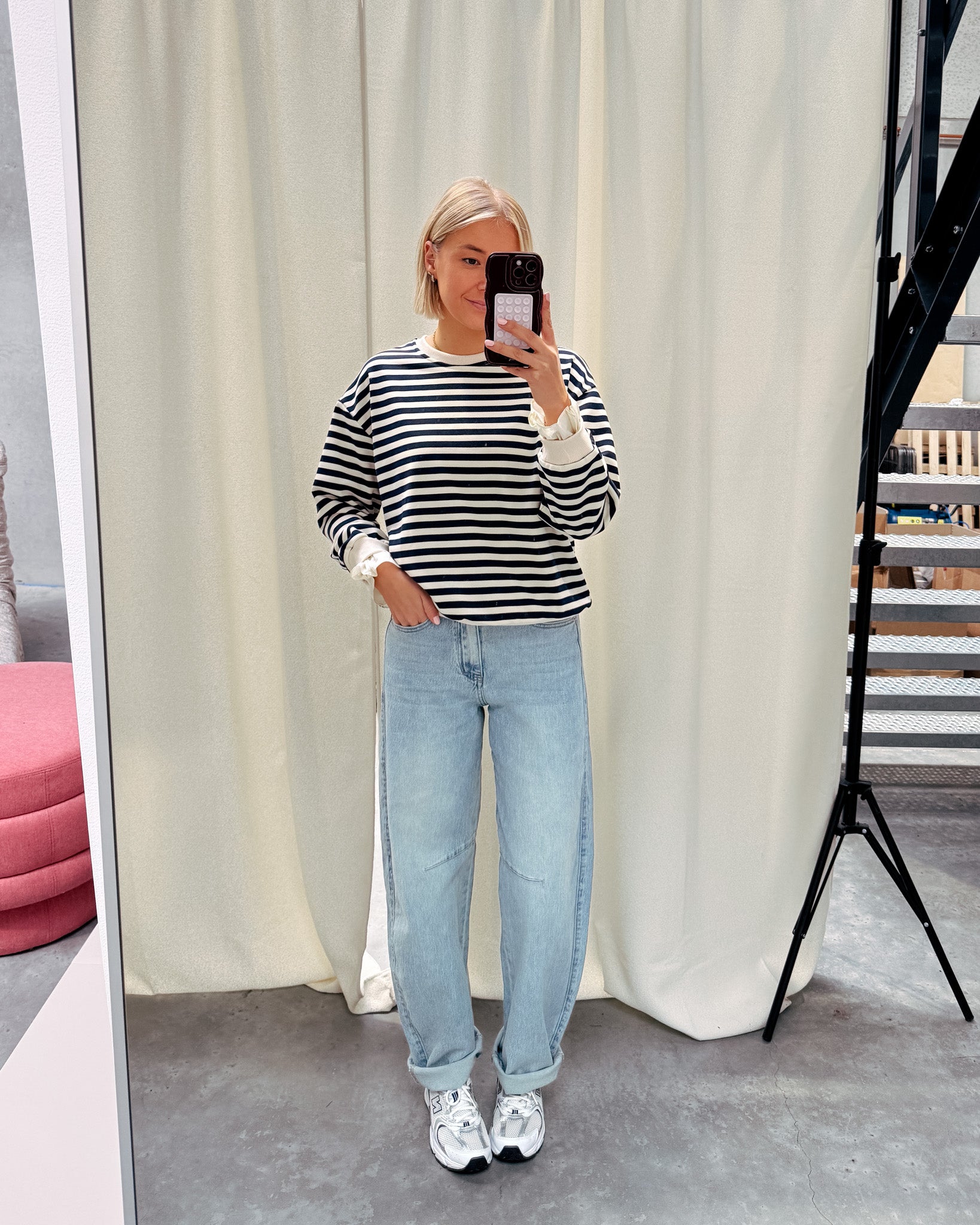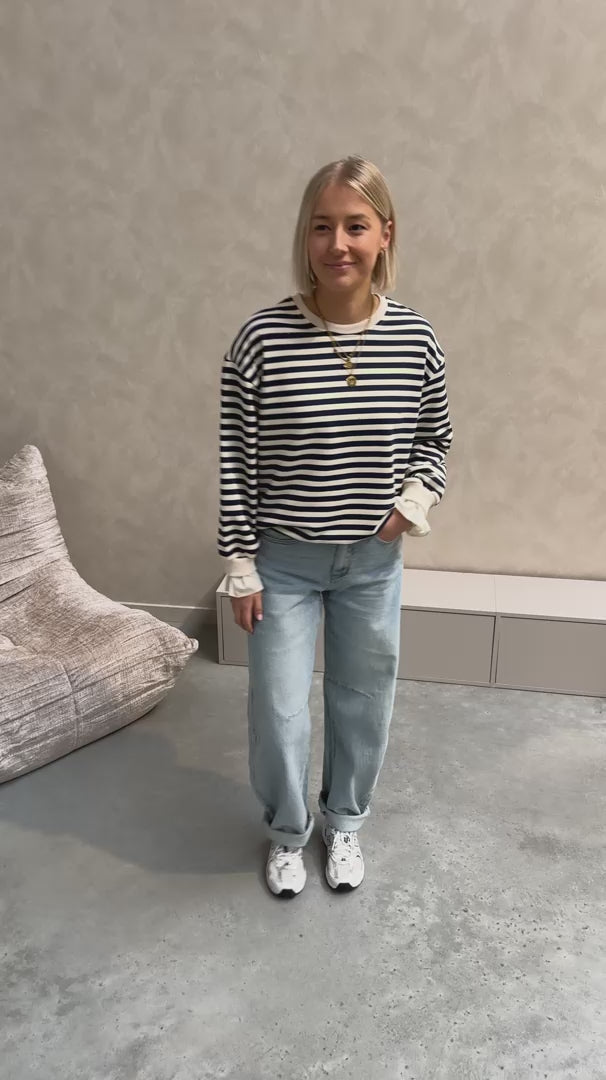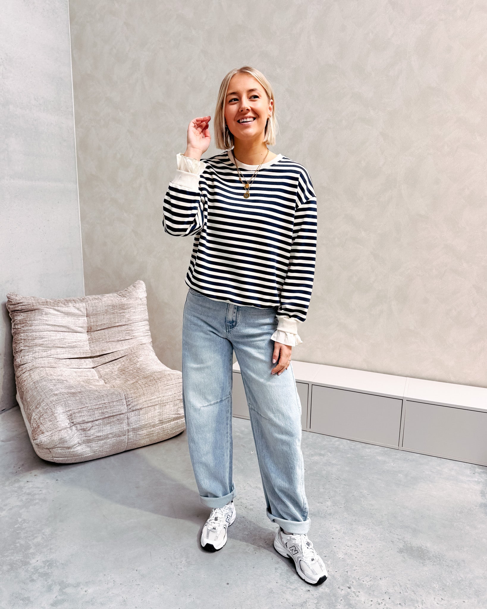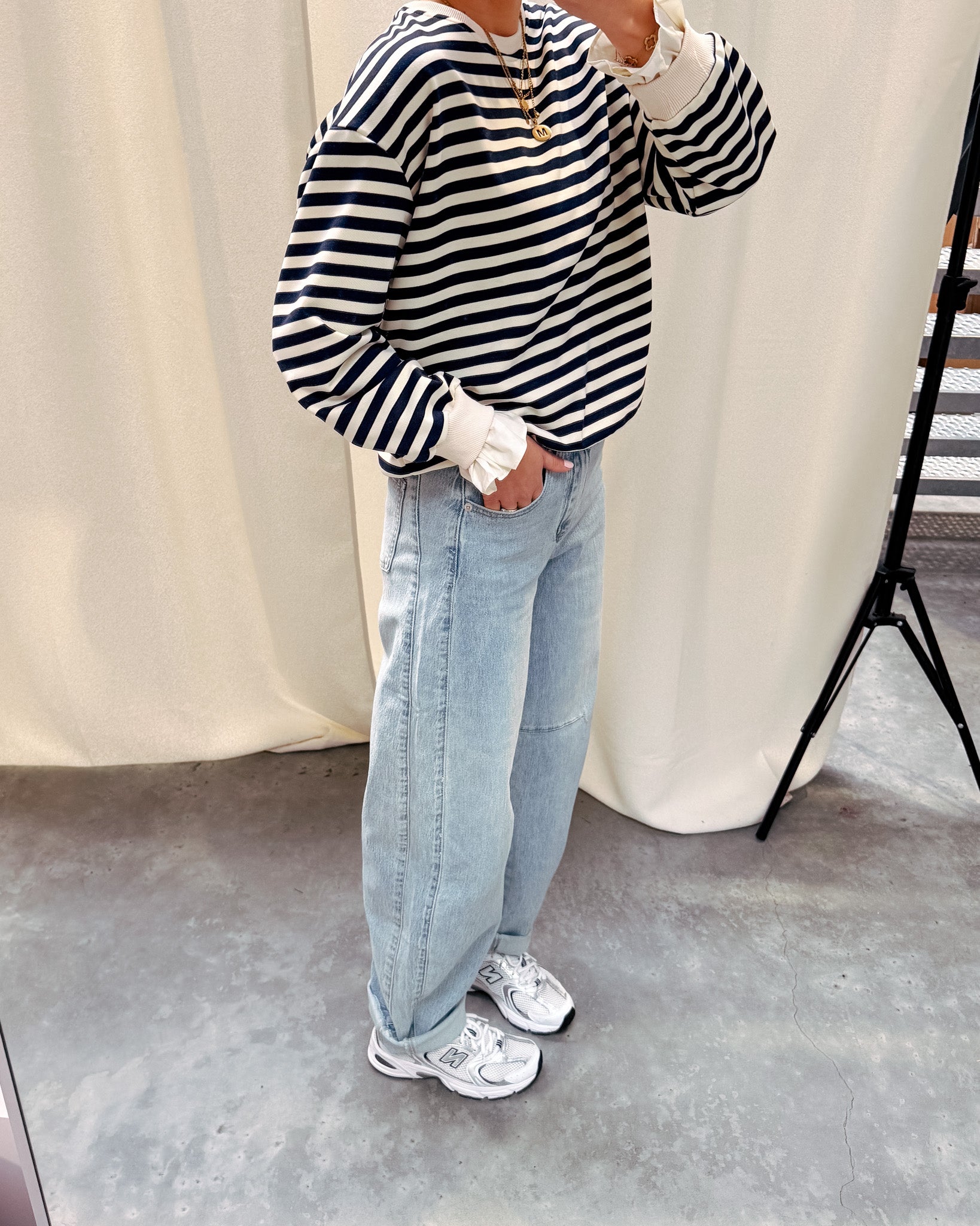 Deze jeans heeft een balloon model. De jeans heeft een hoge taille met stretch waardoor deze heel aangenaam zit. Deze jeans heeft wijde pijpen en valt dan smaller toe naar de enkels, zo creëer je het balloon effect. Ook heeft deze jeans nog een leuk naad detail aan de zijkant. Wij combineerden de jeans met de ‘SWEET SAILOR SWEATER - NAVY BLUE/CREAM’ samen vormen ze een mooi geheel!