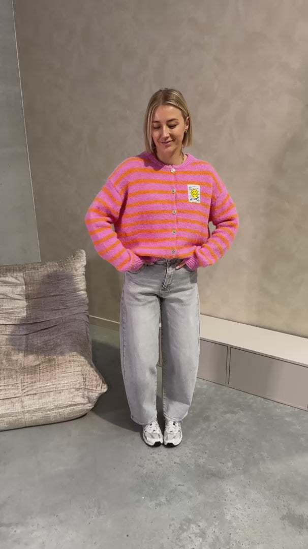 De cardigan sluit met witte knopjes. Je kan deze zowel open dragen als een vestje of gesloten als een truitje. De cardigan draagt super zacht aan! Alhoewel er wol in zit, prikt deze niet! Deze cardigan heeft een leuk streepjespatroon in vrolijke kleurtjes, ook zit er een afbeelding van een smiley op deze geeft het een extra leuke touch! Wij combineerden de cardigan met de ‘GAIA BALLOON FIT JEANS - LIGHT GREY’ samen vormen ze een mooi geheel. We raden aan de cardigan met de hand te wassen.