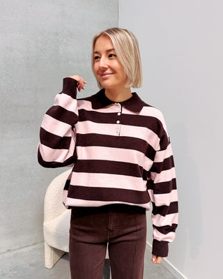 LAUREN BOLD STRIPES POLO KNIT - PINK/BROWN