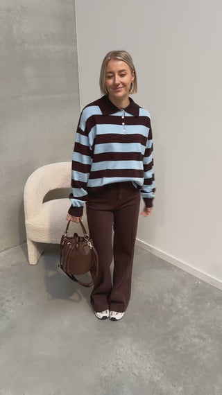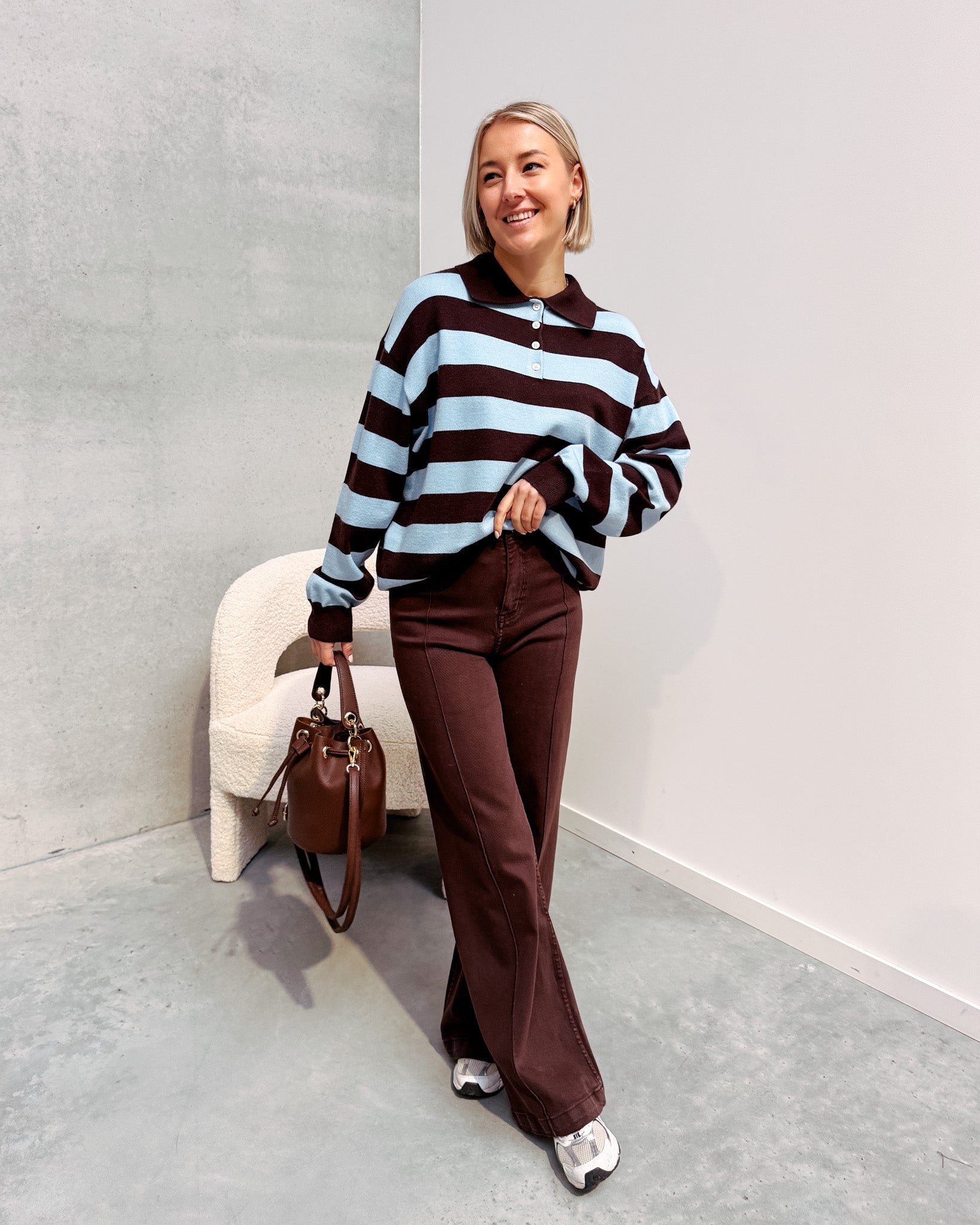 De trui heeft een leuk streepjespatroon met lichtblauw en bruin! De trui is vooraan afgewerkt met een polo kraagje en witte knopjes. Het truitje draagt super zacht aan en heeft een los model. Alhoewel er wol in zit, prikt deze niet!  Wij combineerden de trui met de ‘LENI TOFFEE JEANS - BROWN’ en 'LUMA BROWN BUCKET BAG' samen vormen ze een perfect match! We raden aan de trui met de hand te wassen.