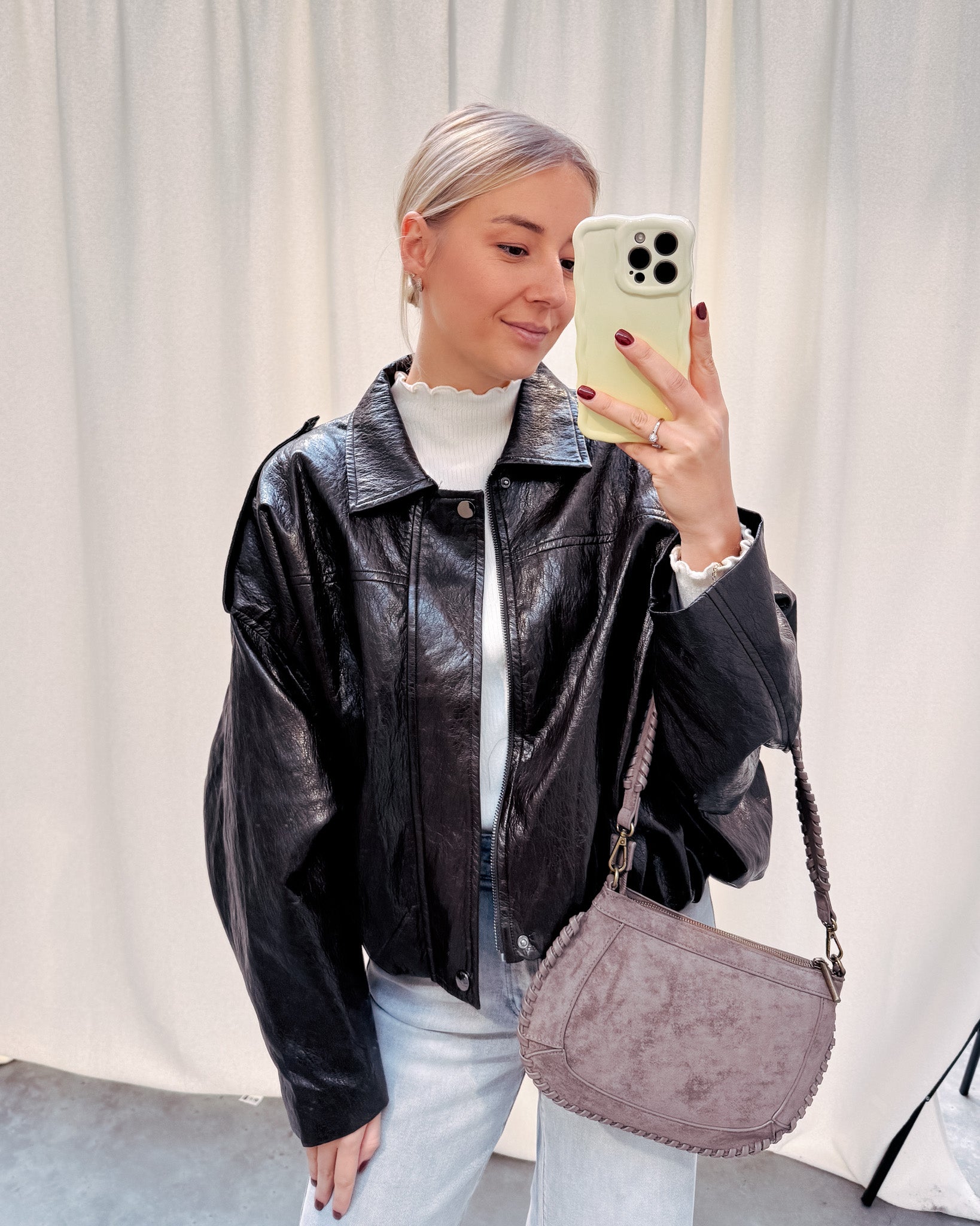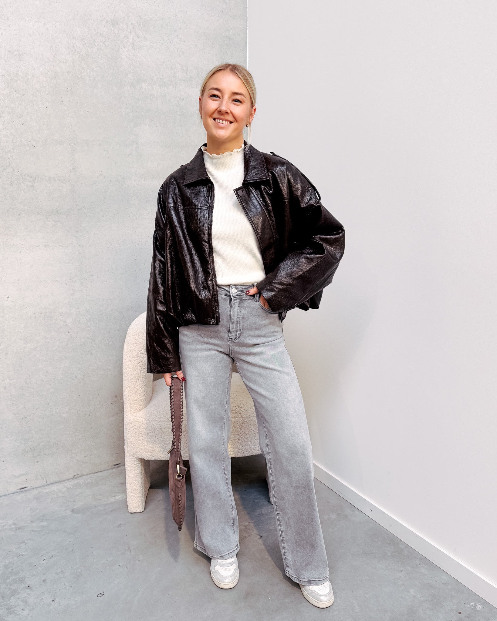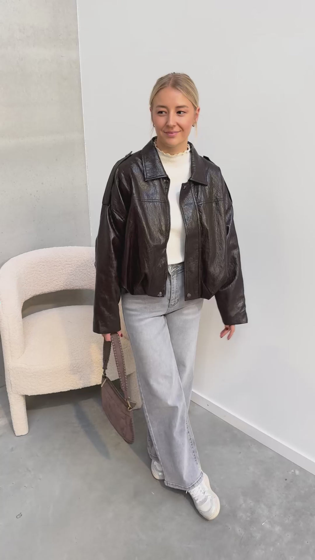 Deze jas is momenteel helemaal on trend. De jas heeft een mooi glanzend PU stofje in een prachtige bruine kleur! De jas heeft leuke pofmouwen, een oversized model en valt lekker poofy! Wij combineerden de jas met de ‘CUTEST SOFT BASIC KNIT - BEIGE’ en ‘ABBY JEANS - LIGHT GREY’ samen vormen ze een perfect geheel!
