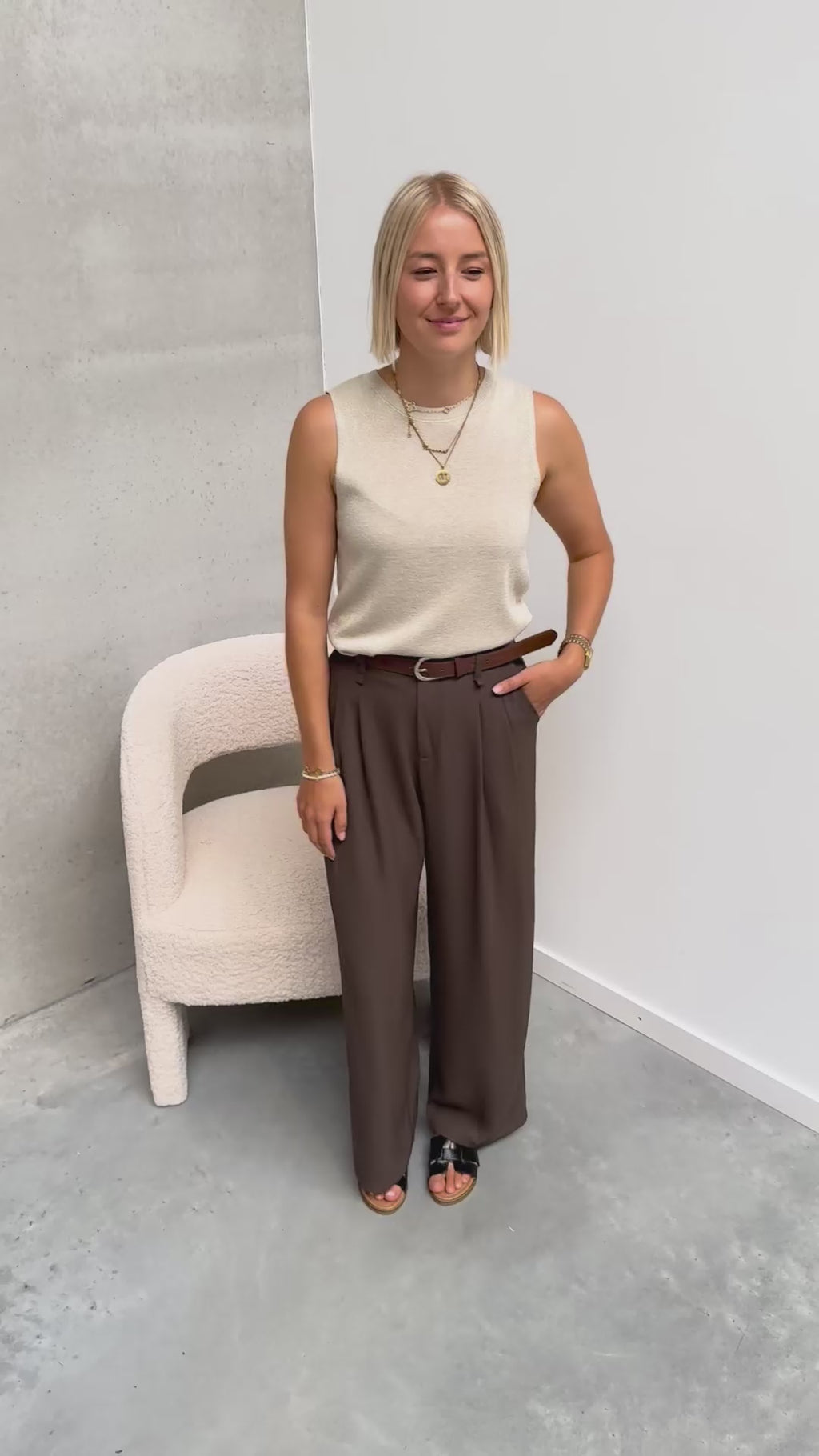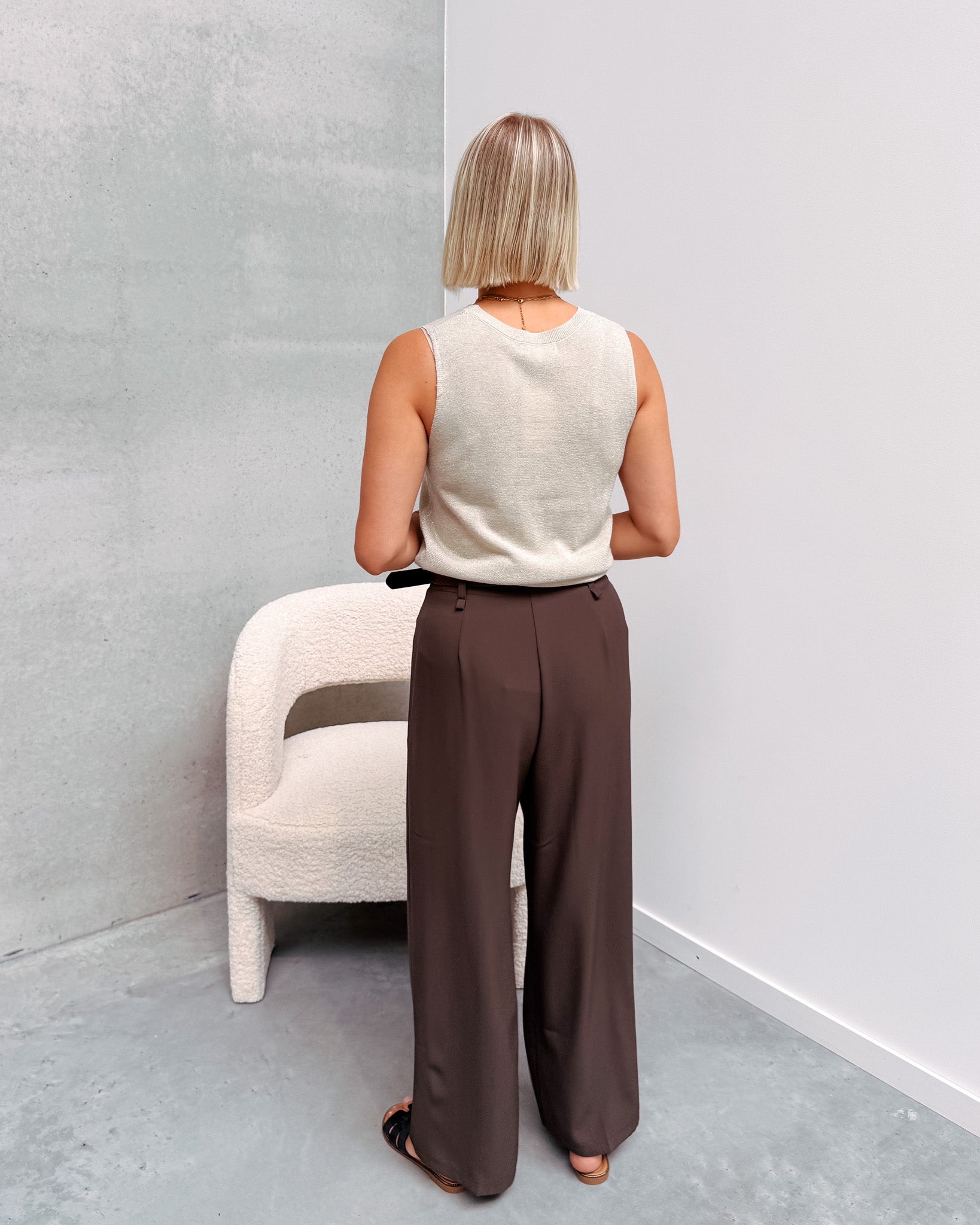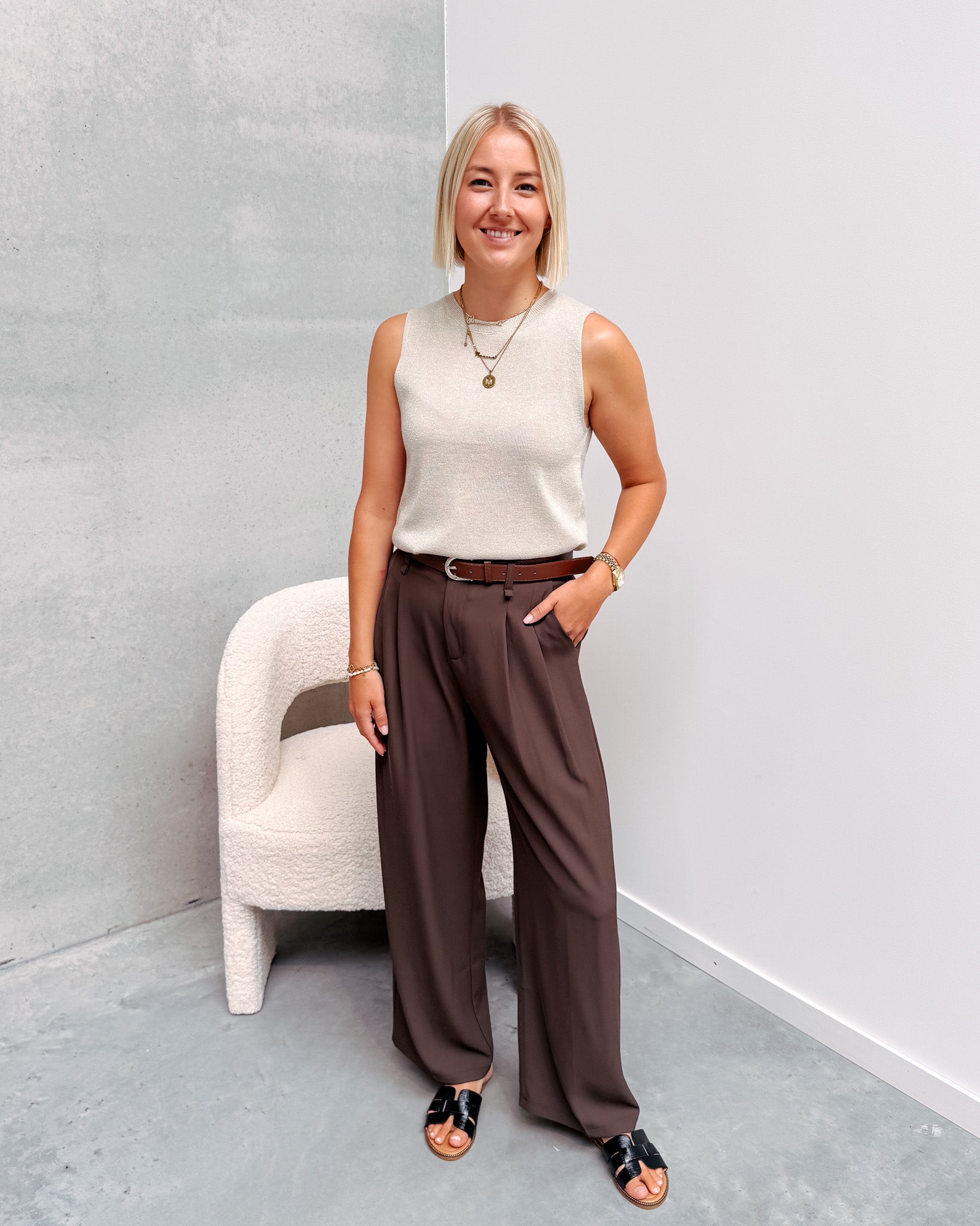 De broek heeft een klassiek gekleed model en zit heel comfortabel aan. Deze broek sluit met een rits vooraan, er zit een bruin riempje bij dat perfect bij de broek kan gedragen worden. Wij combineerden de broek met de ’SPARKLY KNITTED TOP - BEIGE’ en ‘HERMINE SLIPPERS - BLACK’ samen vormen ze een mooi geheel!