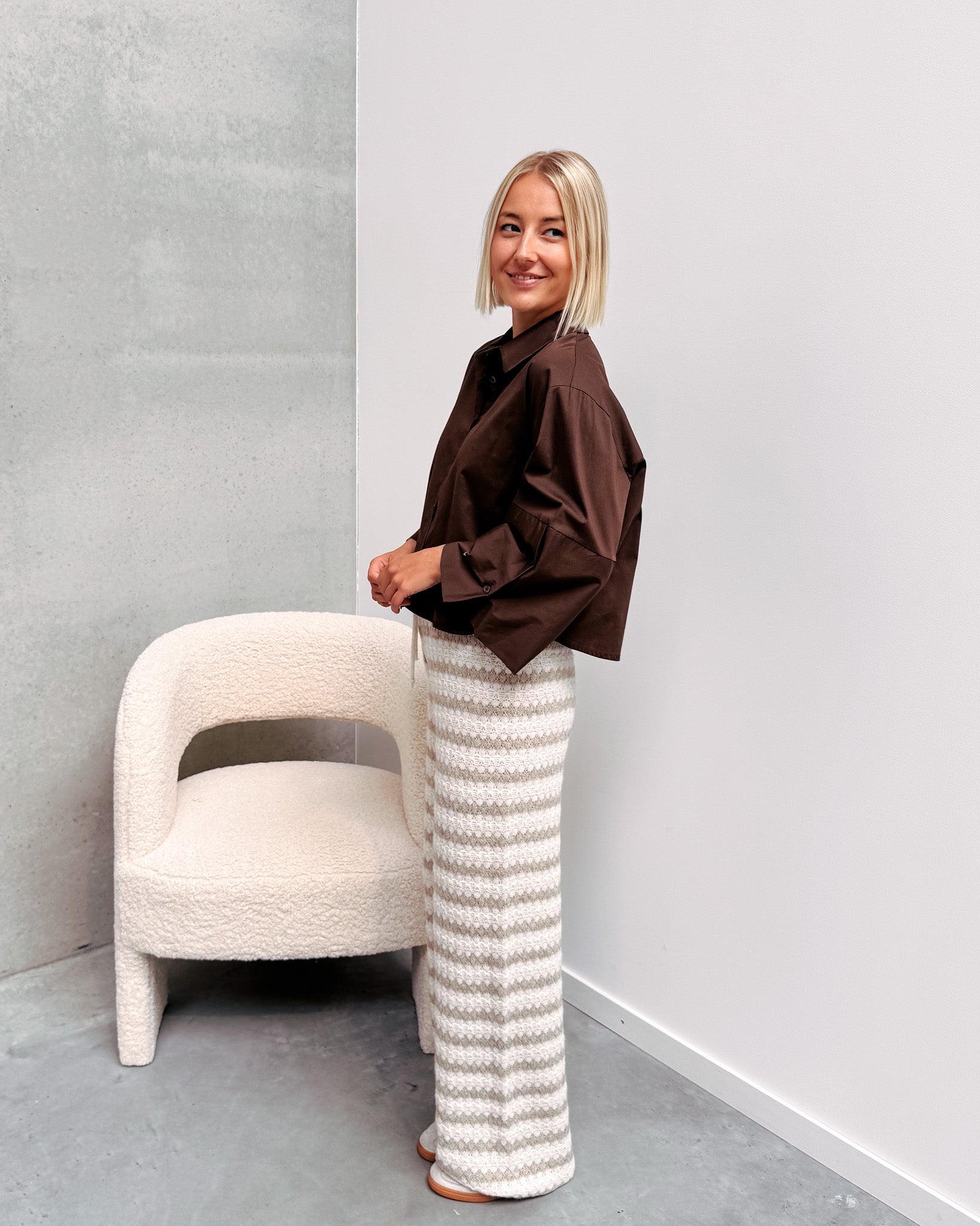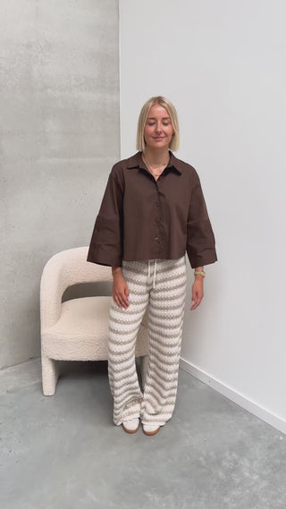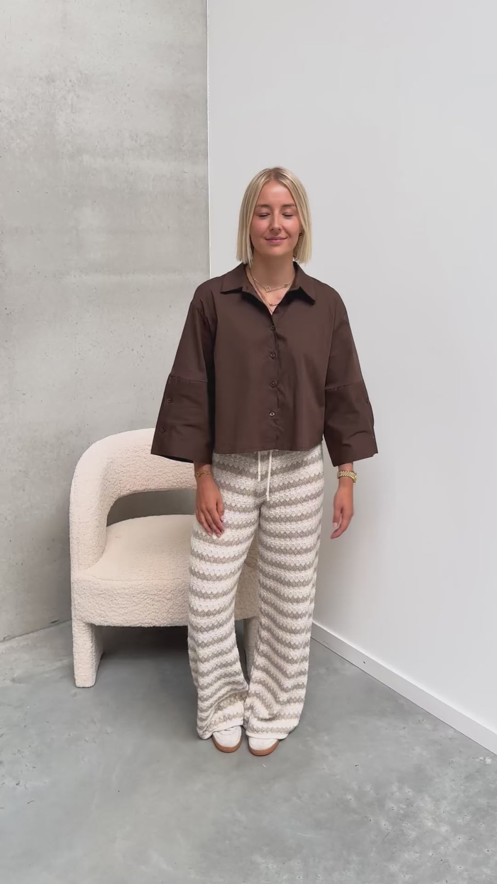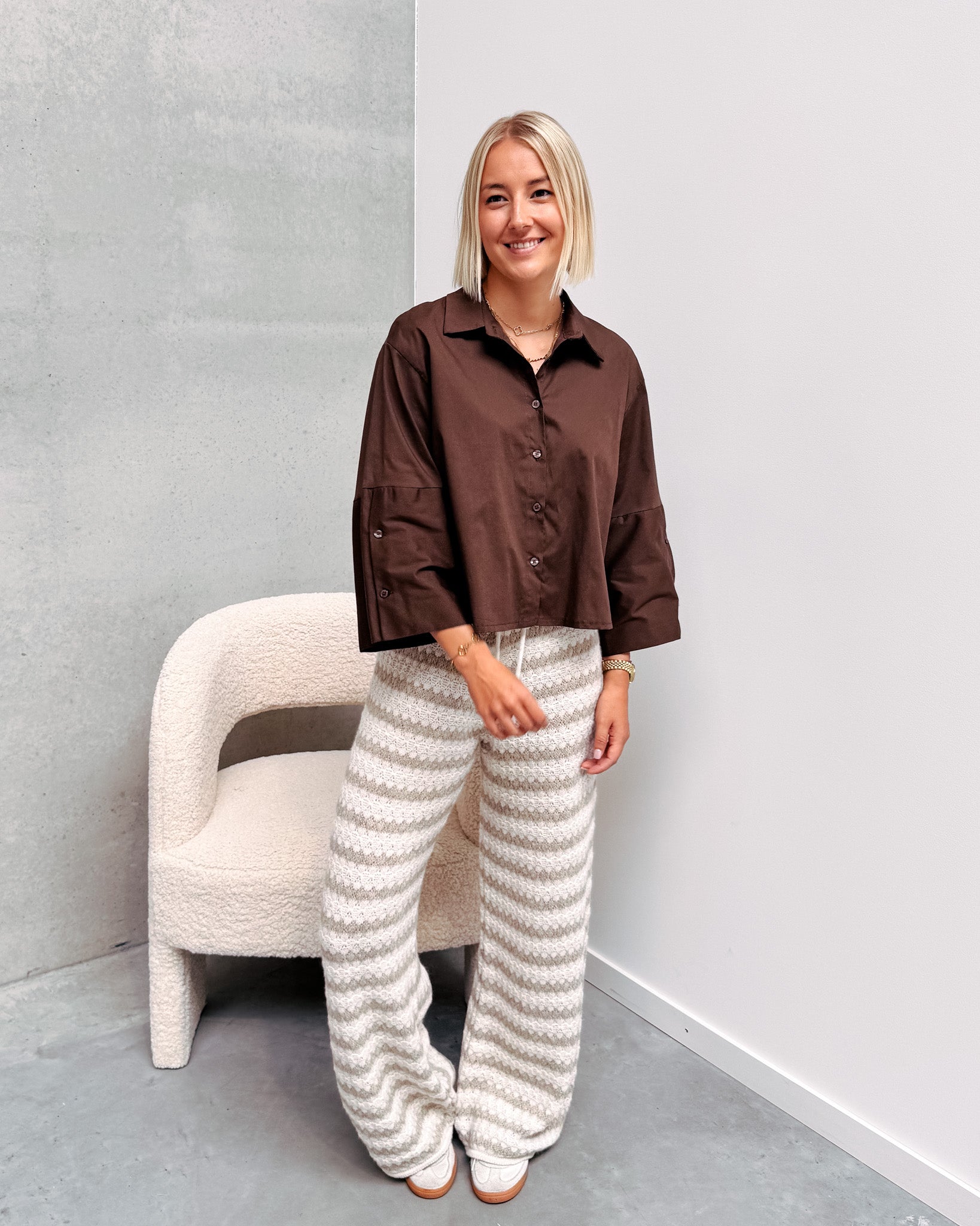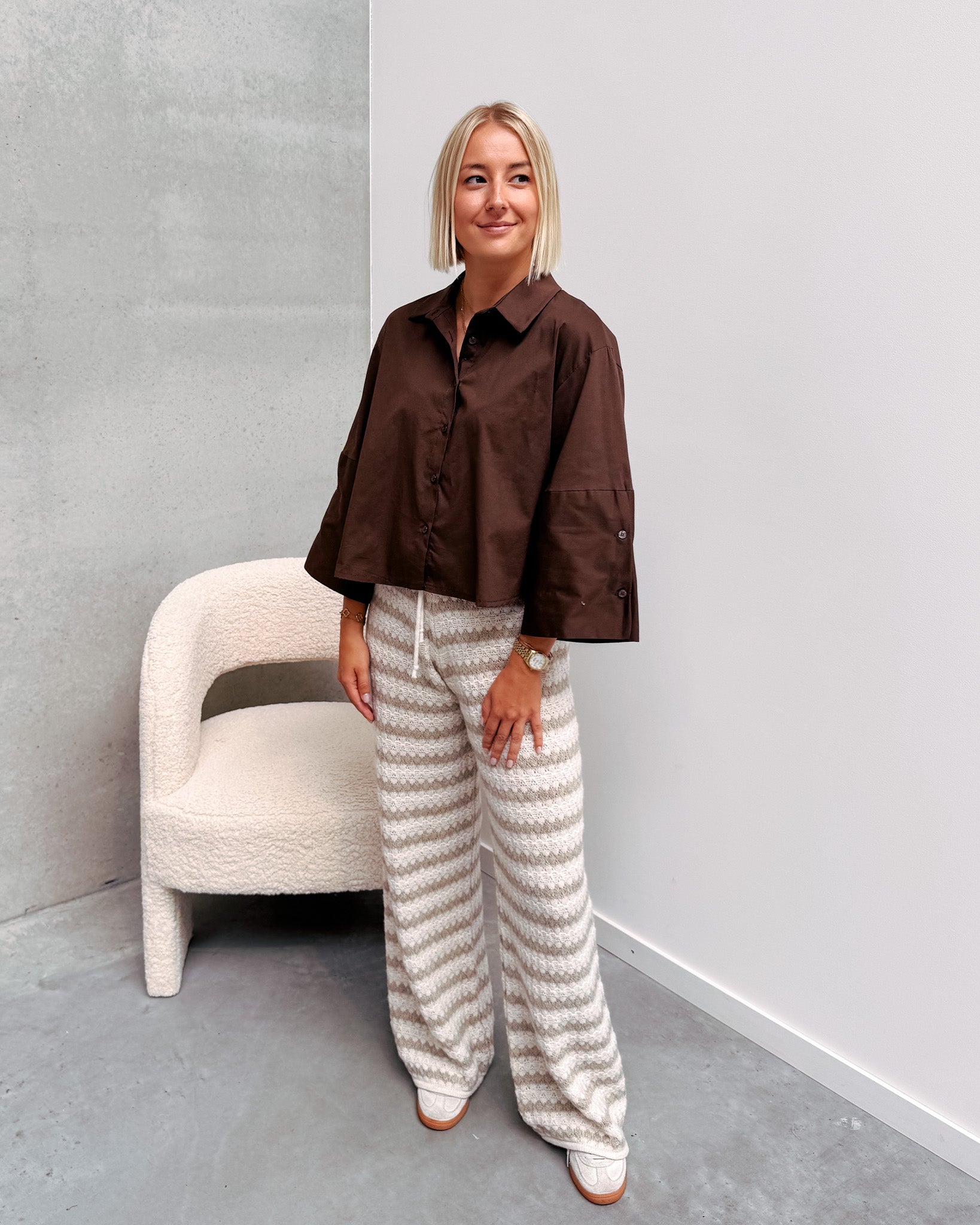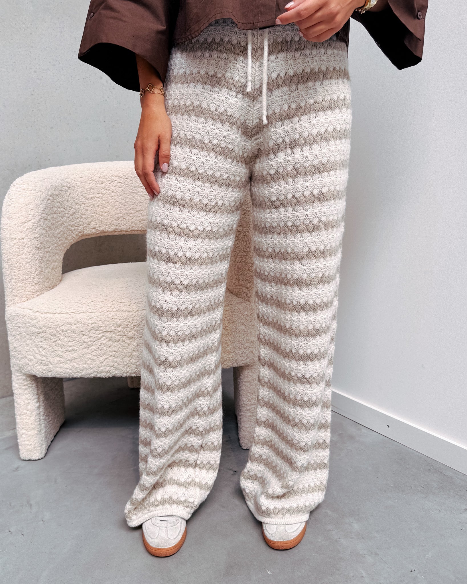 De broek heeft een dik gebreid stofje in een leuk streepjespatroon! Deze broek heeft bovenaan een elastische band met vooraan een lintje dat je kan strikken. Ook heeft deze een hoge taille en brede pijpen. De broek zit super zacht & heel comfortabel aan. Alhoewel er wol in de broek zit, prikt deze niet! Wij combineerden de broek met de ‘PHILOU CROPPED BLOUSE - BROWN’ samen vormen ze een perfect geheel! We raden aan de broek met de hand te wassen.