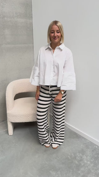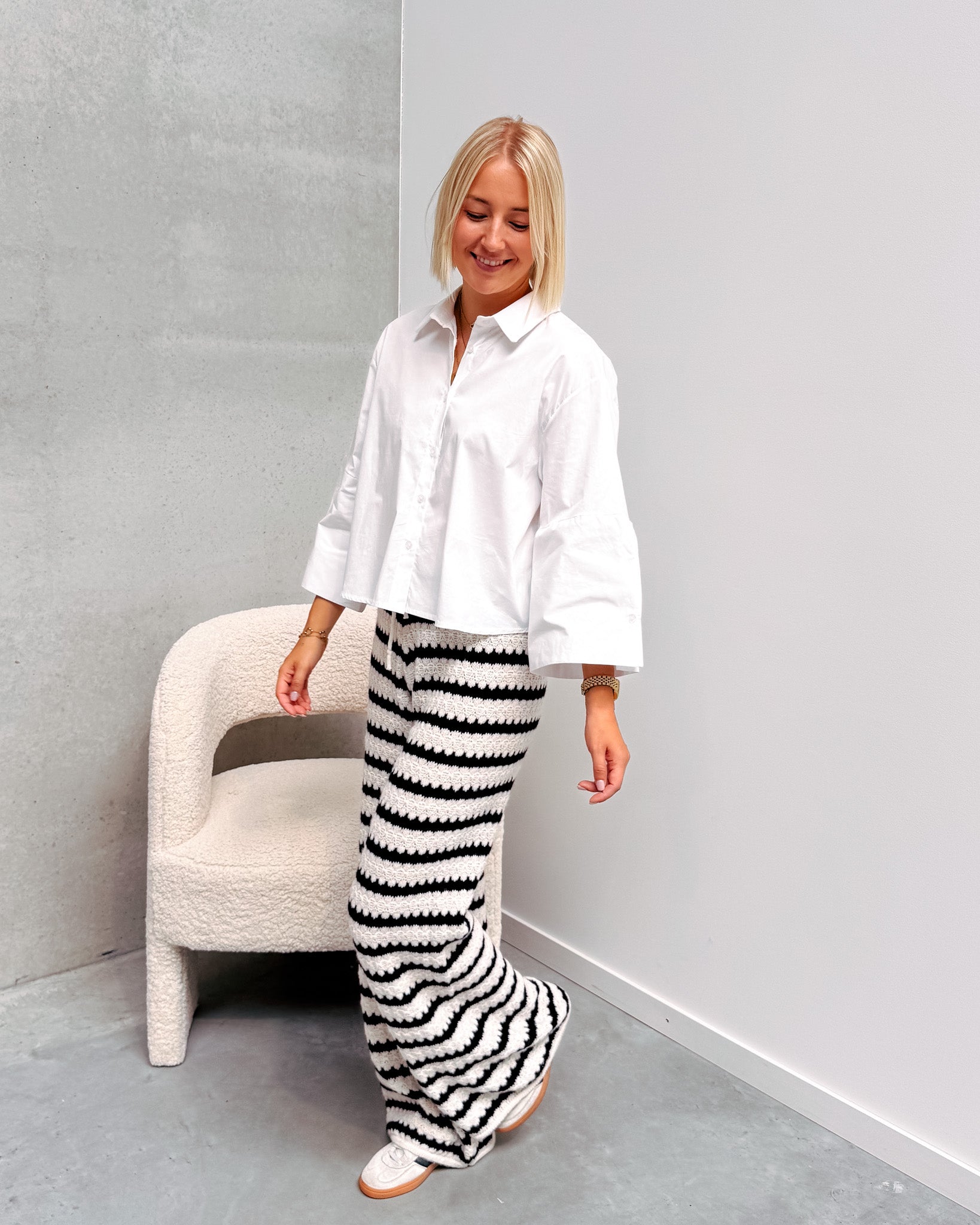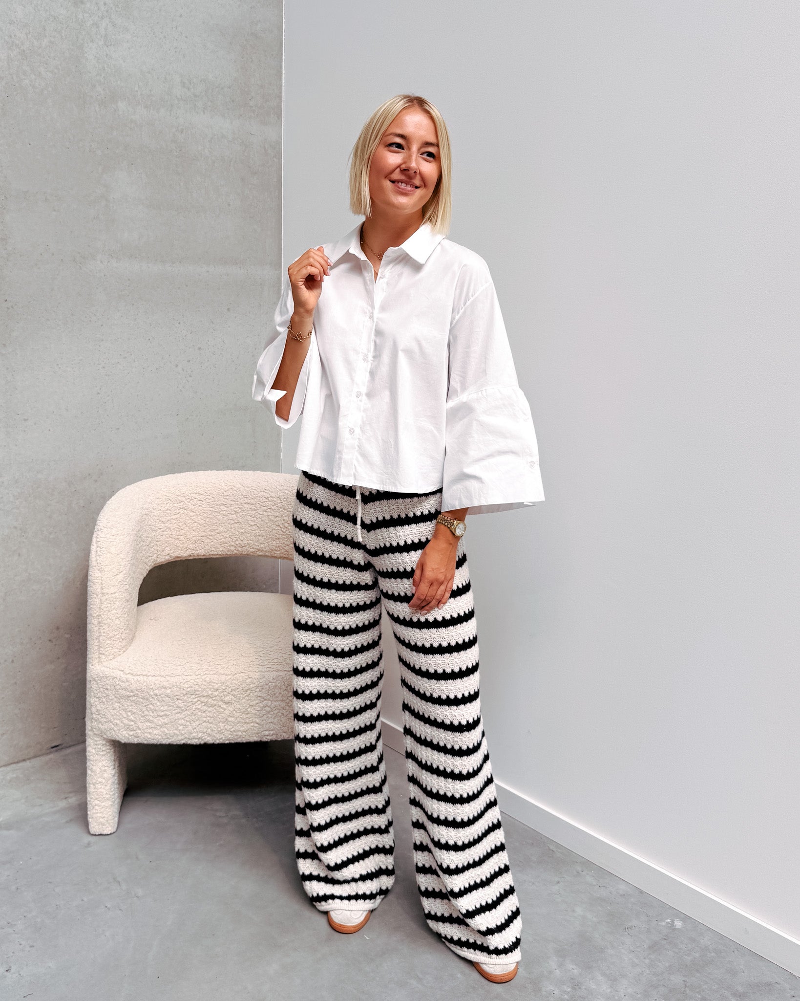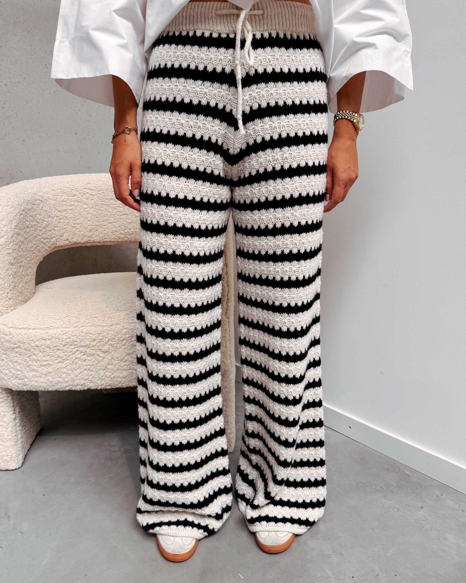 De broek heeft een dik gebreid stofje in een leuk streepjespatroon! Deze broek heeft bovenaan een elastische band met vooraan een lintje dat je kan strikken. Ook heeft deze een hoge taille en brede pijpen. De broek zit super zacht en heel comfortabel aan. Alhoewel er wol in de broek zit, prikt deze niet! Wij combineerden de broek met de ‘PHILOU CROPPED BLOUSE - WHITE’ samen vormen ze een perfect geheel! We raden aan de broek met de hand te wassen.