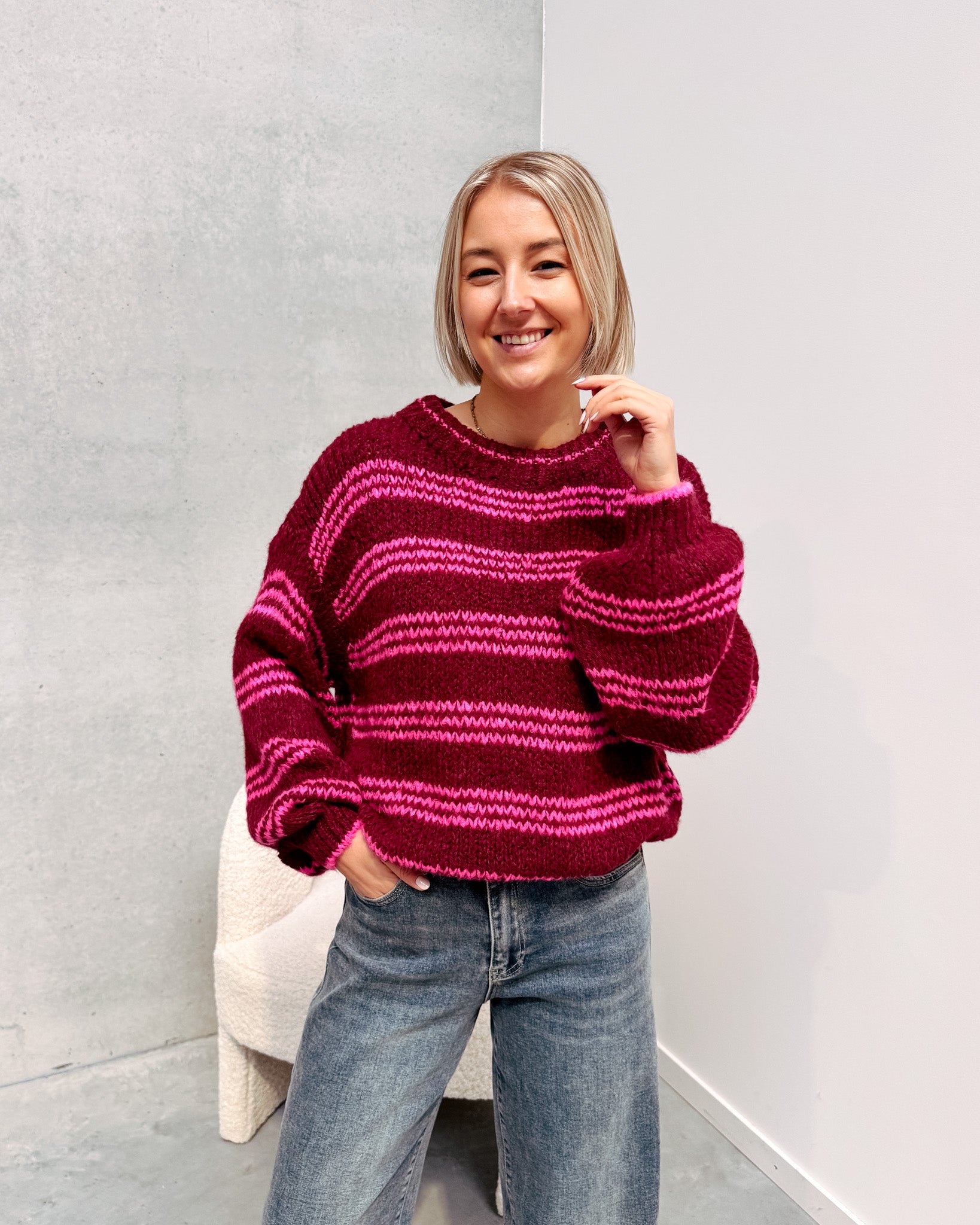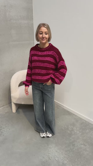 Het is een gebreide trui met bordeaux en fel roze. De fel roze touch zorgt meteen voor kleur & happy vibes! Ook het streepjespatroon geeft de trui nog een extra leuk detail! Deze trui draagt heel zacht, warm en gezellig aan! Alhoewel er wol in de trui zit, prikt deze niet. Wij combineerden de trui met de ‘FENNE FULL LENGTH JEANS - BLUE’ samen vormen ze een perfect match! We raden aan de trui met de hand te wassen.