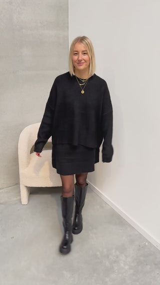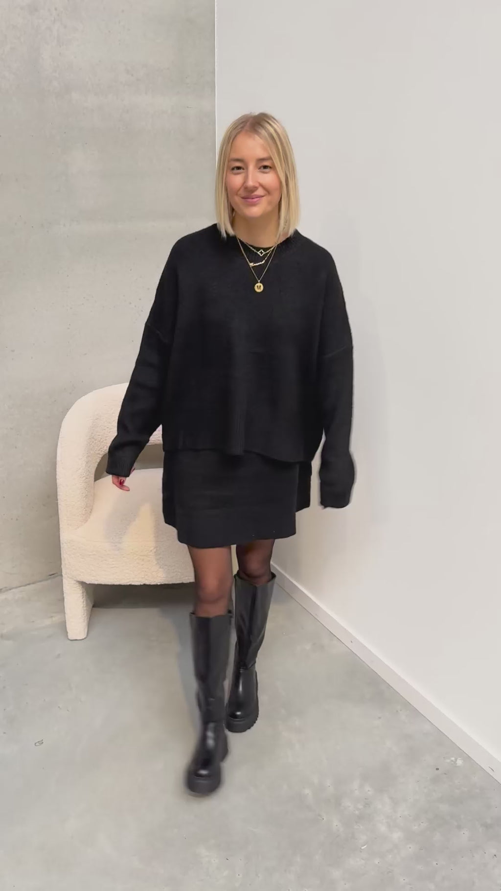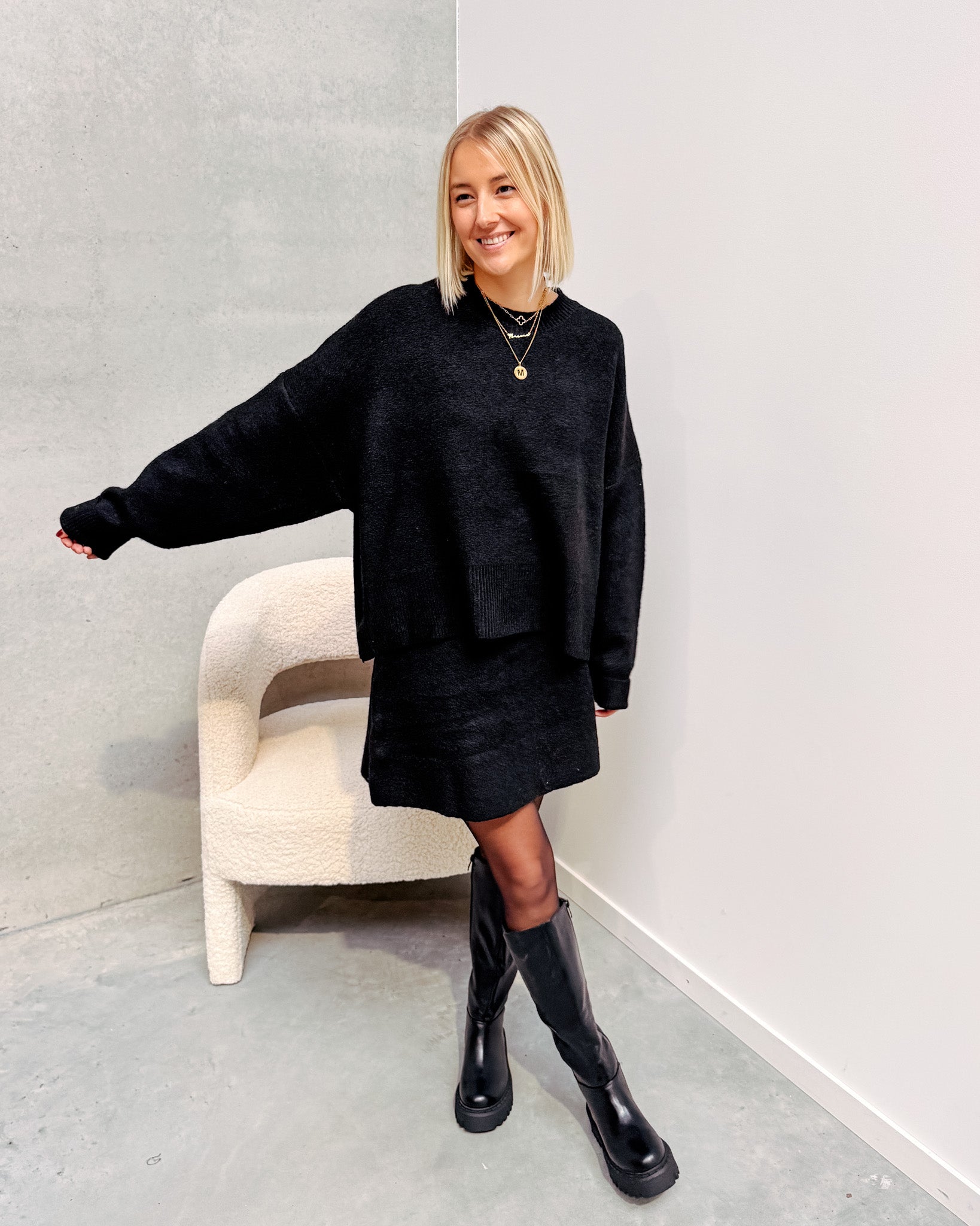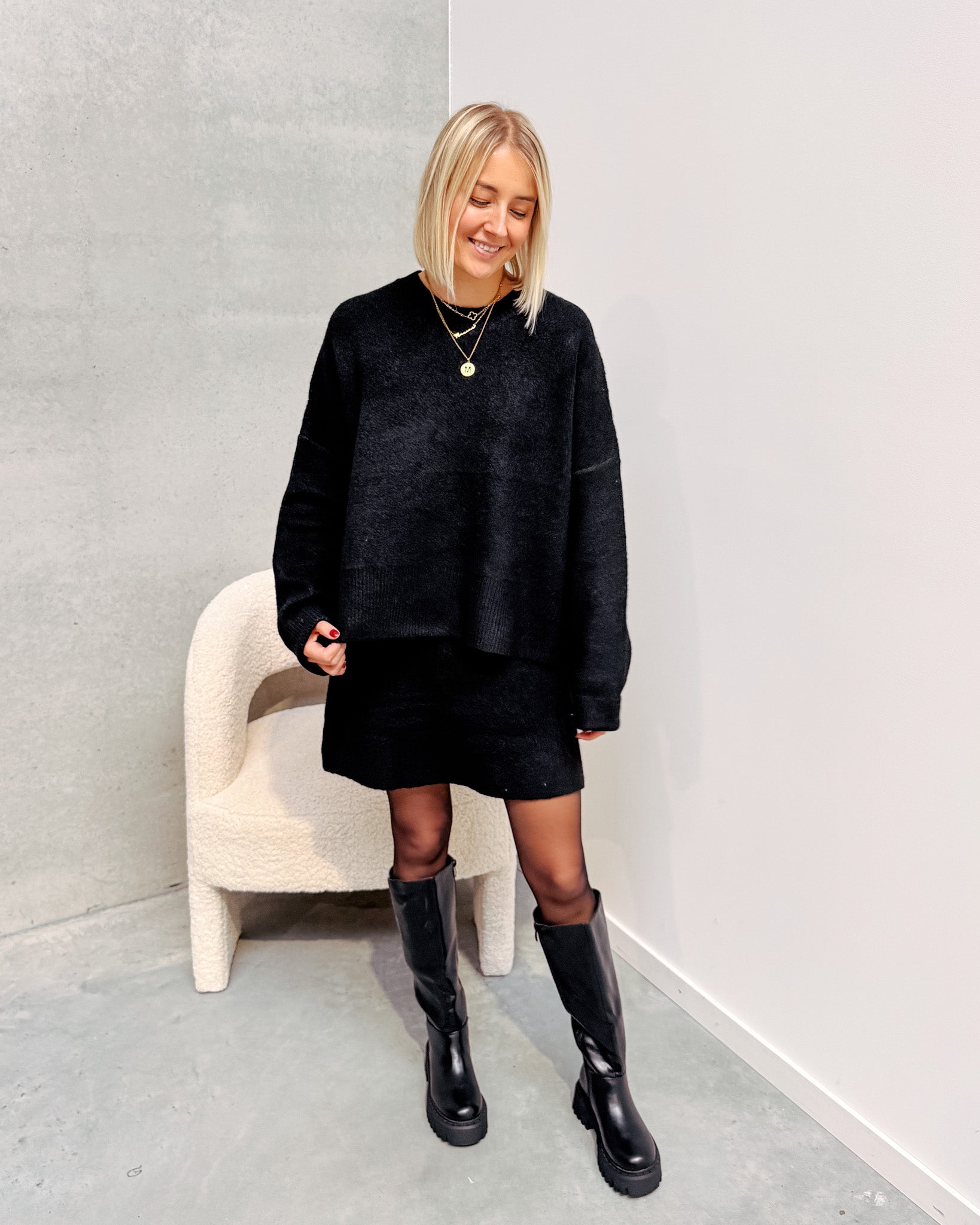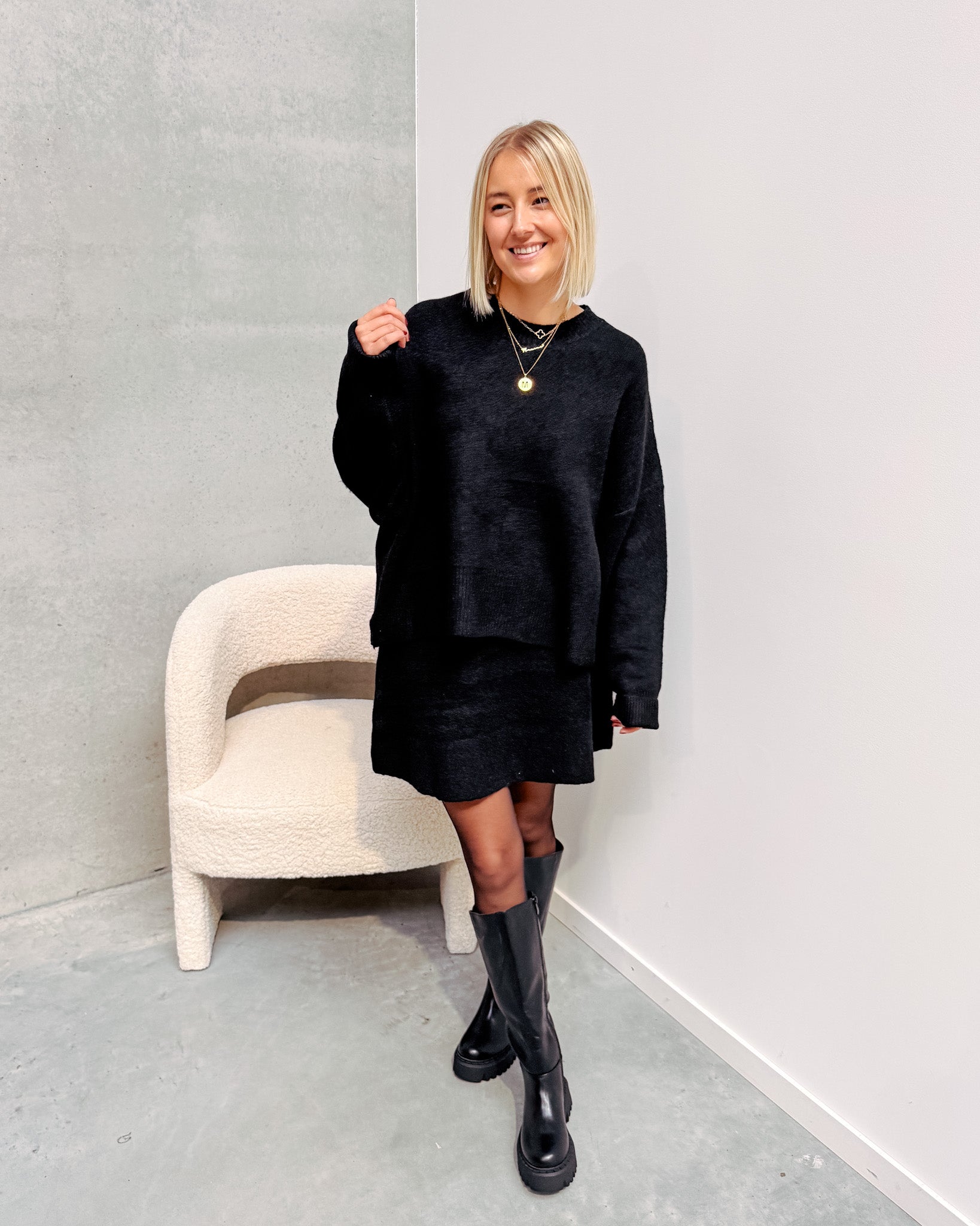 Het setje bestaat uit een gebreid truitje met een matching gebreid rokje. De trui heeft een los model. Het rokje heeft bovenaan een elastische band. Het setje draagt super zacht en warm aan! Je kan het truitje los of in de rok dragen. Alhoewel er wol in de set zit, prikt deze niet! Wij combineerden het setje met de ‘PERFECT BLACK PANTY’ en ‘FAY BLACK BOOTS’ samen vormen ze een perfect geheel. We raden aan het setje met de hand te wassen.