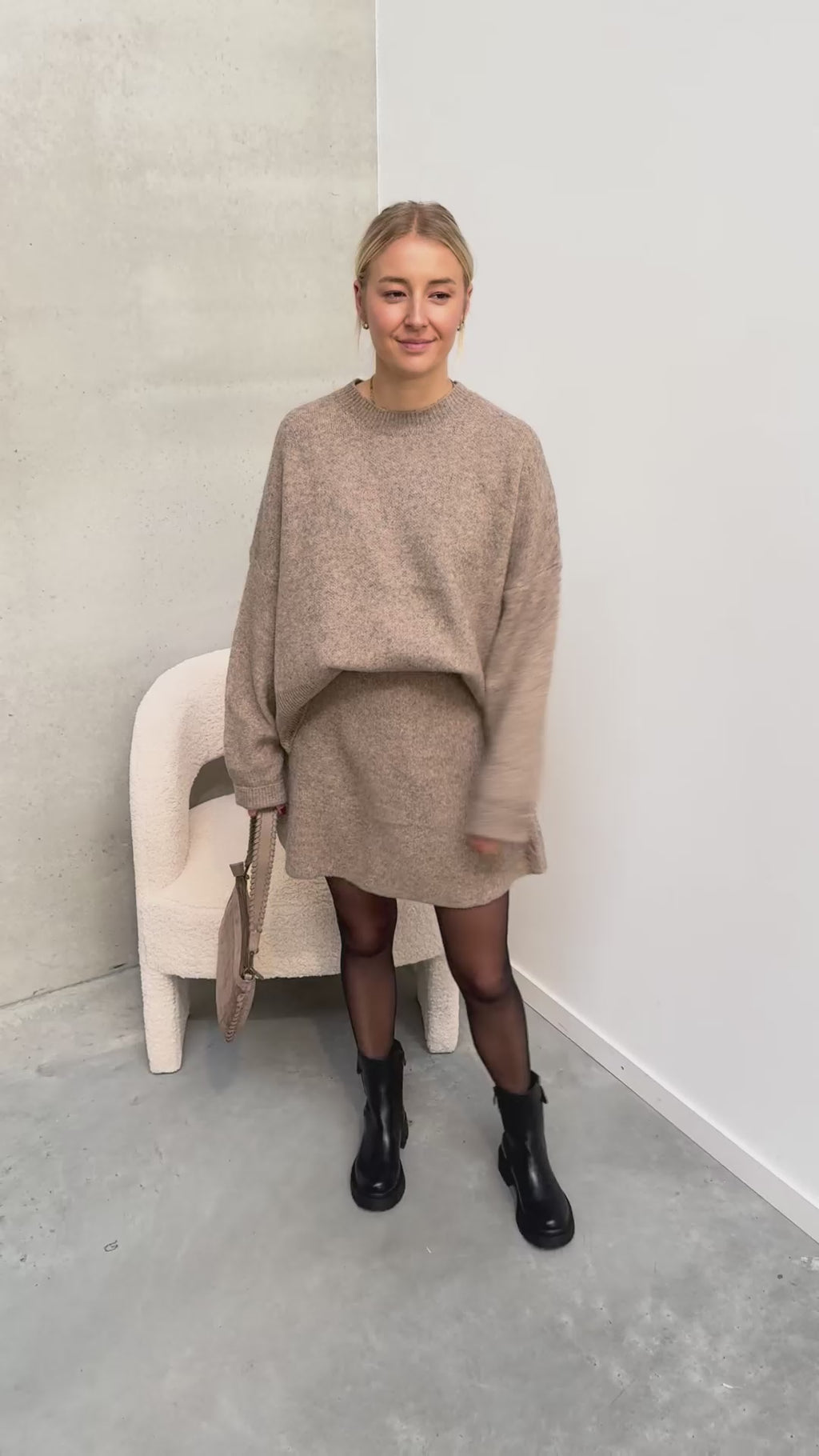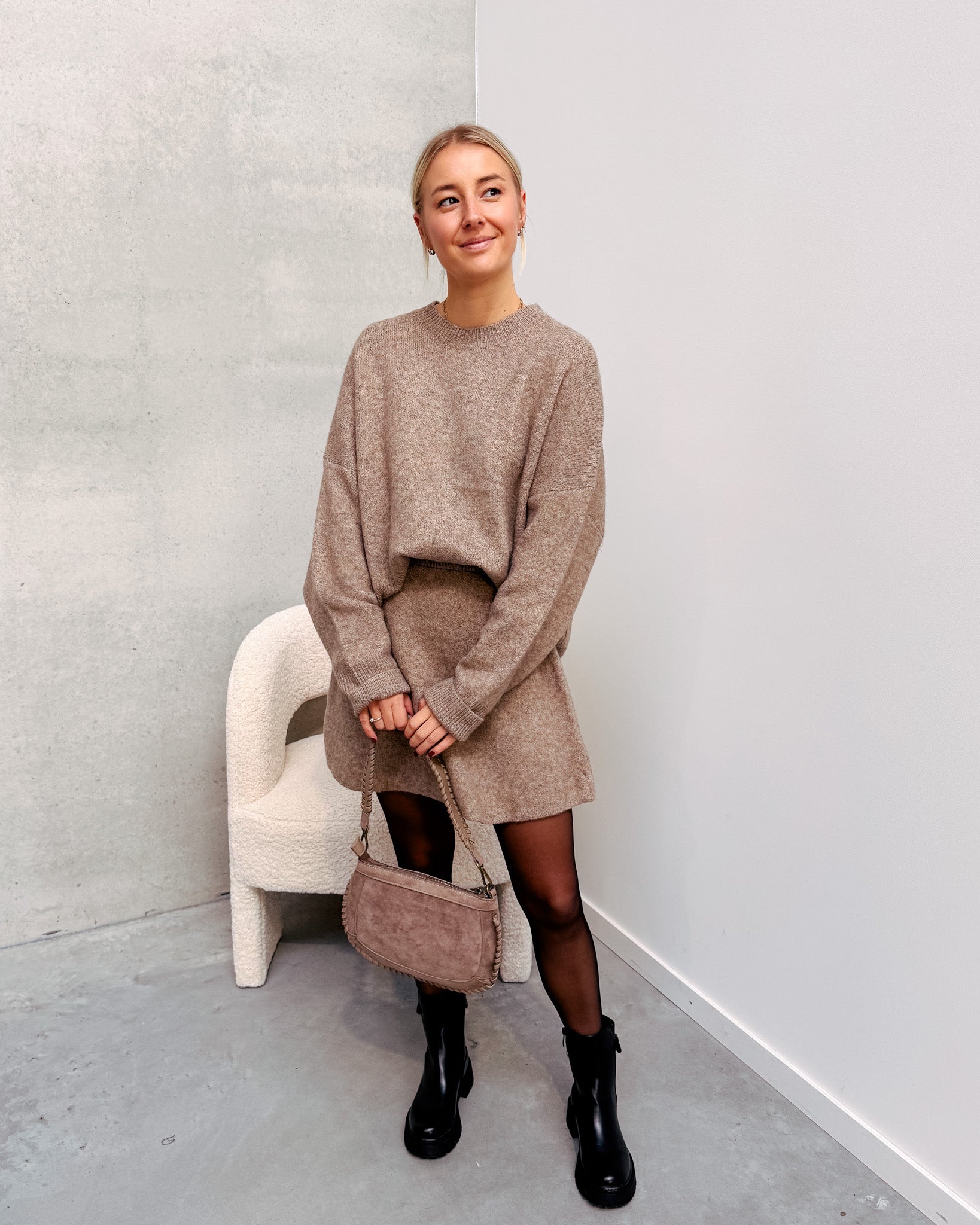 Het setje bestaat uit een gebreid truitje met een matching gebreid rokje. De trui heeft een los model. Het rokje heeft bovenaan een elastische band. Het setje draagt super zacht en warm aan! Je kan het truitje los of in de rok dragen. Alhoewel er wol in de set zit, prikt deze niet! Wij combineerden het setje met de ‘PERFECT BLACK PANTY’, ‘LILOU BAG - TAUPE’ & de ‘BLISS BUCKLE BOOTS - BLACK’ samen vormen ze een perfect geheel. We raden aan het setje met de hand te wassen.