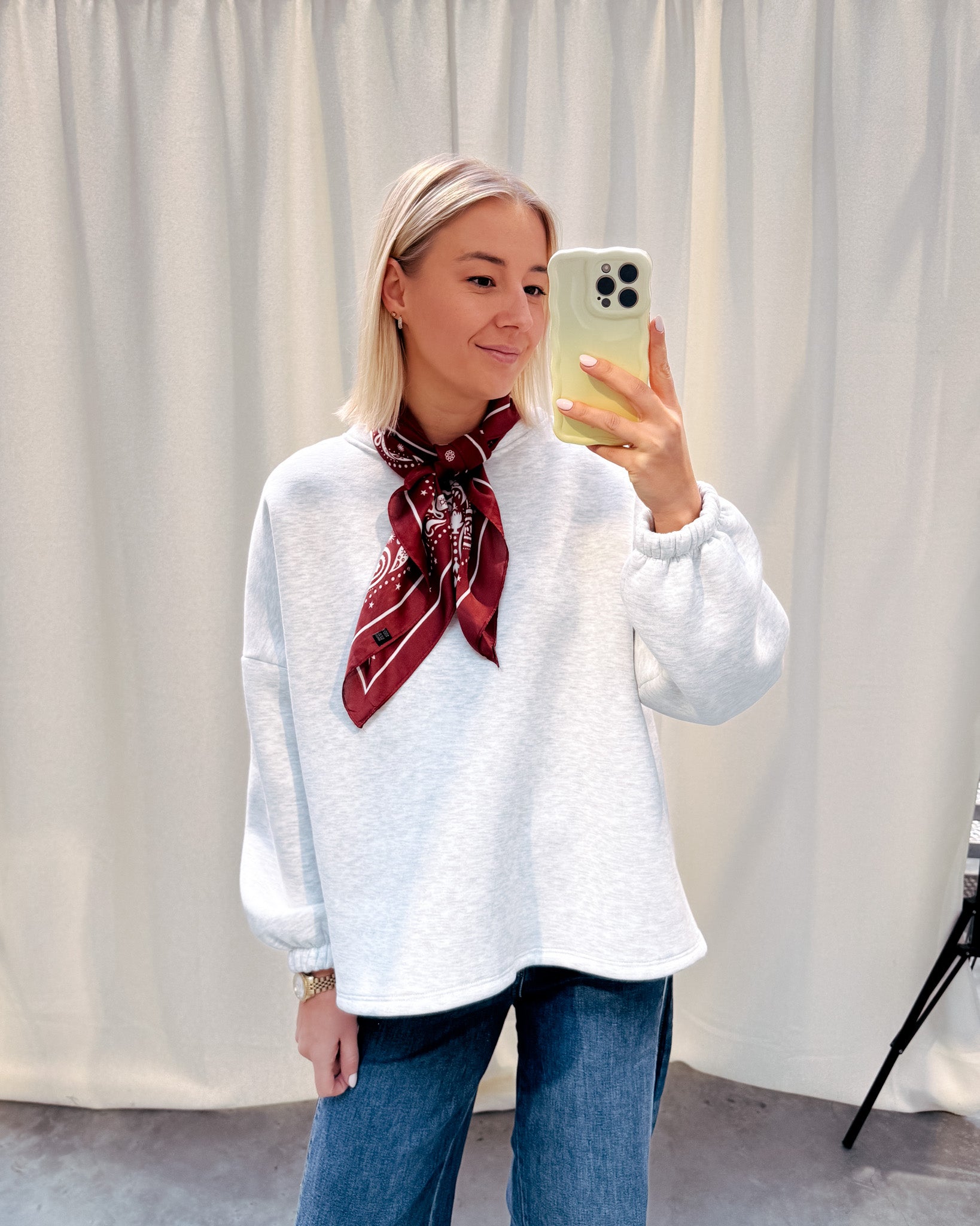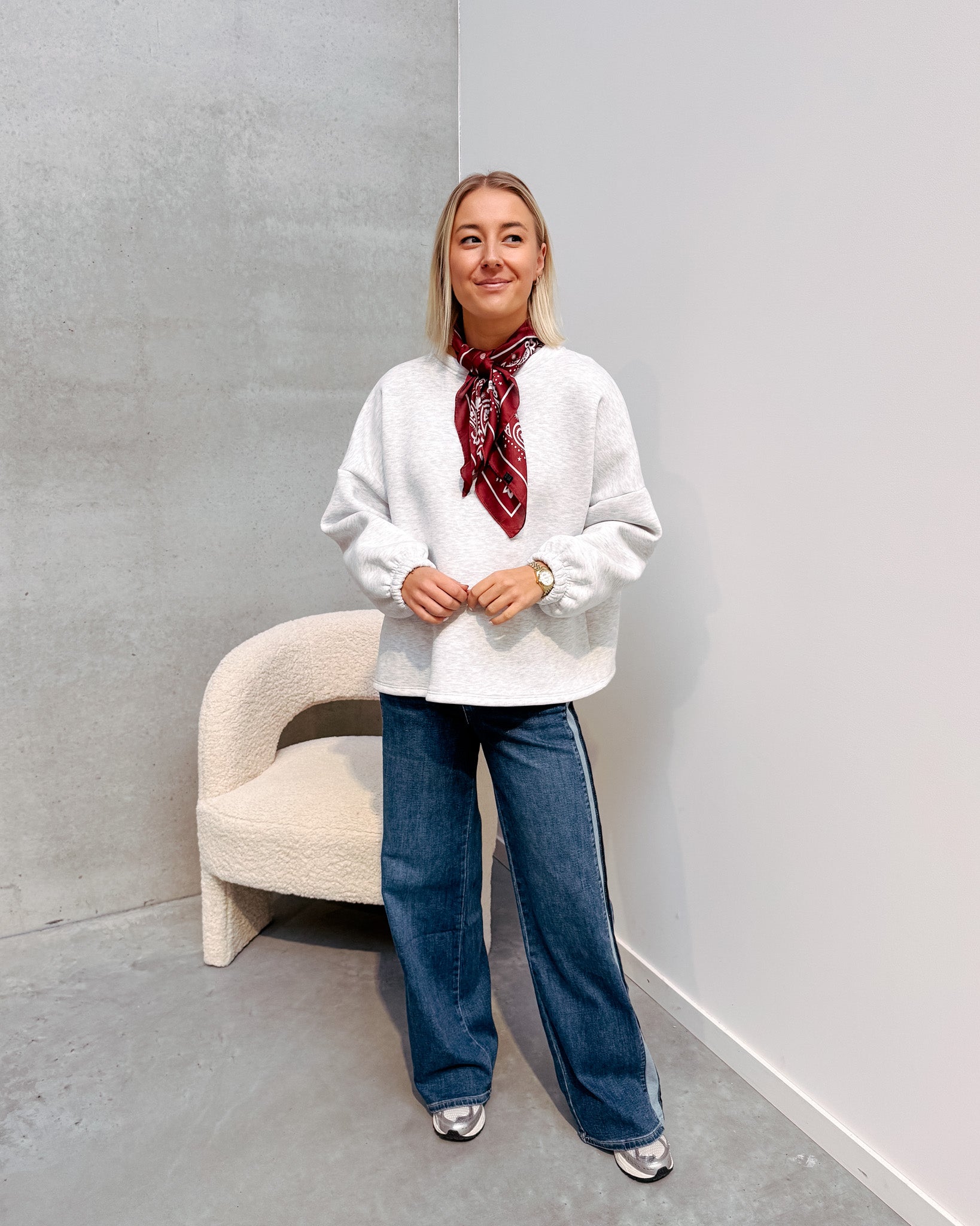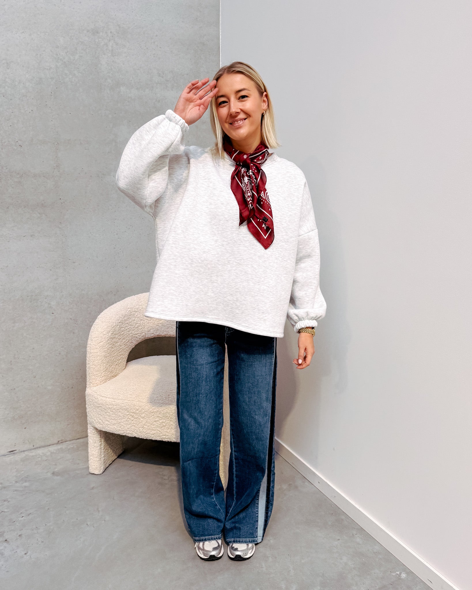 De sweater heeft een oversized model met zachte fleece stof binnen. Deze sweater draagt super zacht & comfortabel aan! Aan de mouwen zit er een elastiek, deze geven het een poofy detail! Op de sweater staat achteraan de tekst ‘BISOU’ in rode letters, deze geven een extra leuk detail aan de trui! Wij combineerden de sweater met de ‘METRO STRIPE DENIM JEANS - BLUE’ en ‘PETIT SCARF - BURGUNDY/WHITE’ samen vormen ze een perfect geheel!