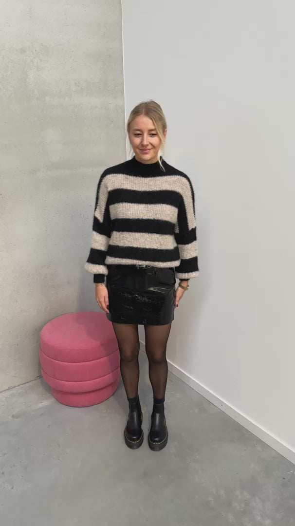 De trui heeft een breed strepen patroon met zwart en beige! Dit vinden wij zo een toffe kleuren combo! De trui draagt heel zacht & comfy aan! Alhoewel er wol in de trui zit, prikt deze niet. Wij combineerden de trui met de 'WILD HEART SKIRT - BLACK' & 'PERFECT BLACK PANTY' samen vormen ze de ideale match! We raden aan de trui met de hand te wassen.