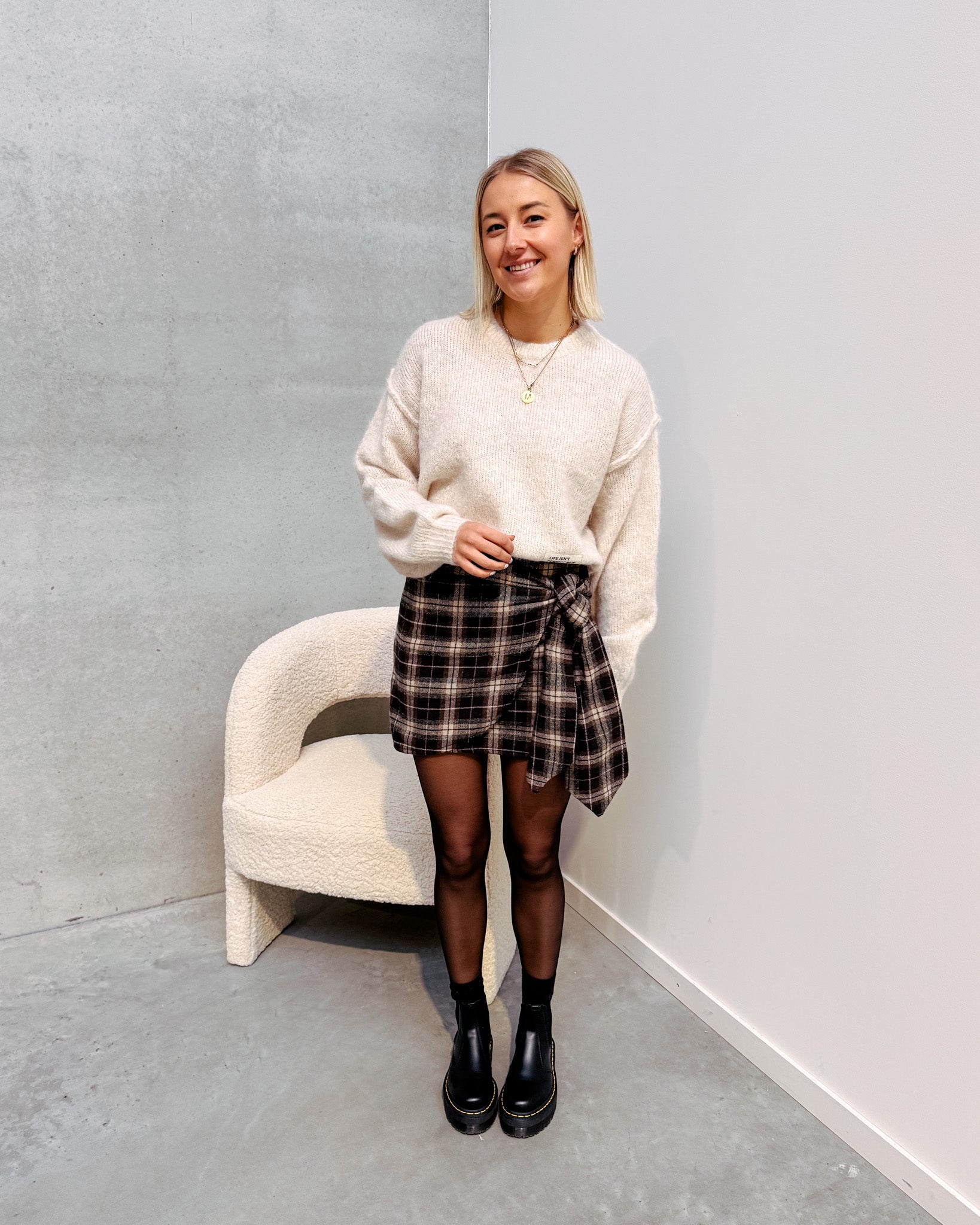 Het rokje is gemaakt van een flanellen stofje en heeft een leuk geruit printje! De rok sluit met een rits aan de zijkant en heeft een overslag model. Je kan het overslag stukje zelf vaster of losser knopen met de lintjes. Wij combineerden het rokje met de ‘PERFECT OUTFIT KNIT - BEIGE’ en 'PERFECT BLACK PANTY’ samen vormen ze een perfect match!