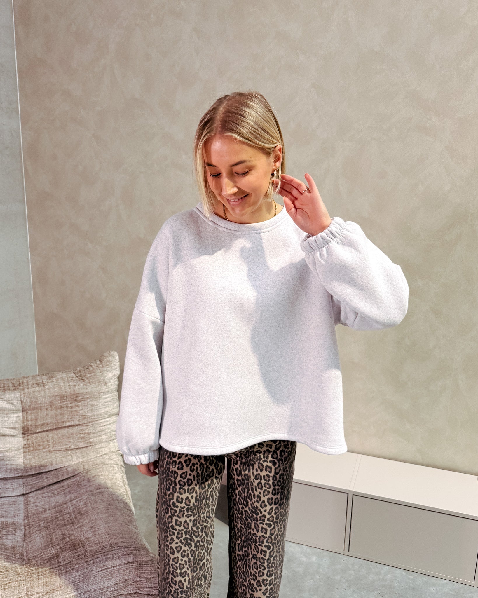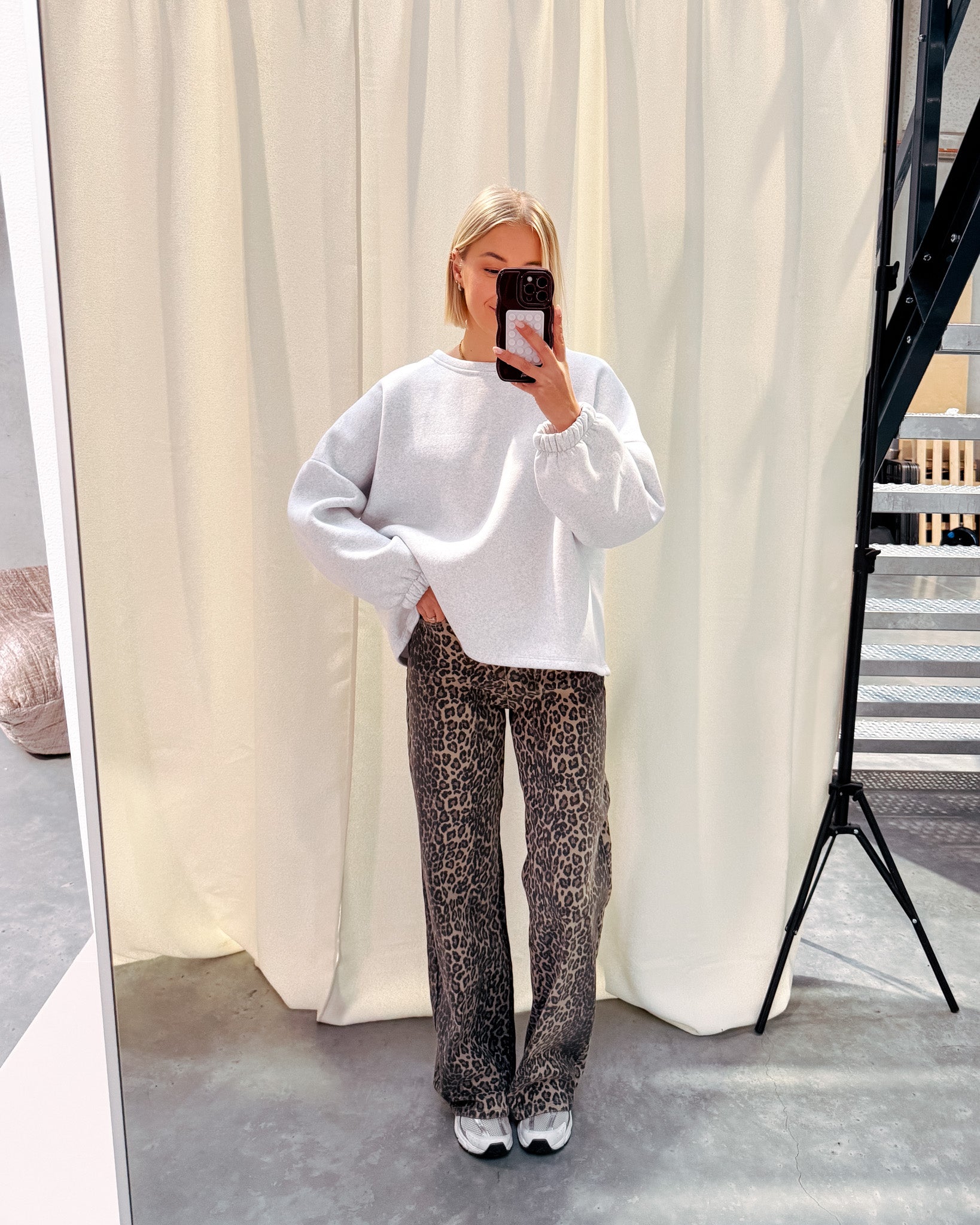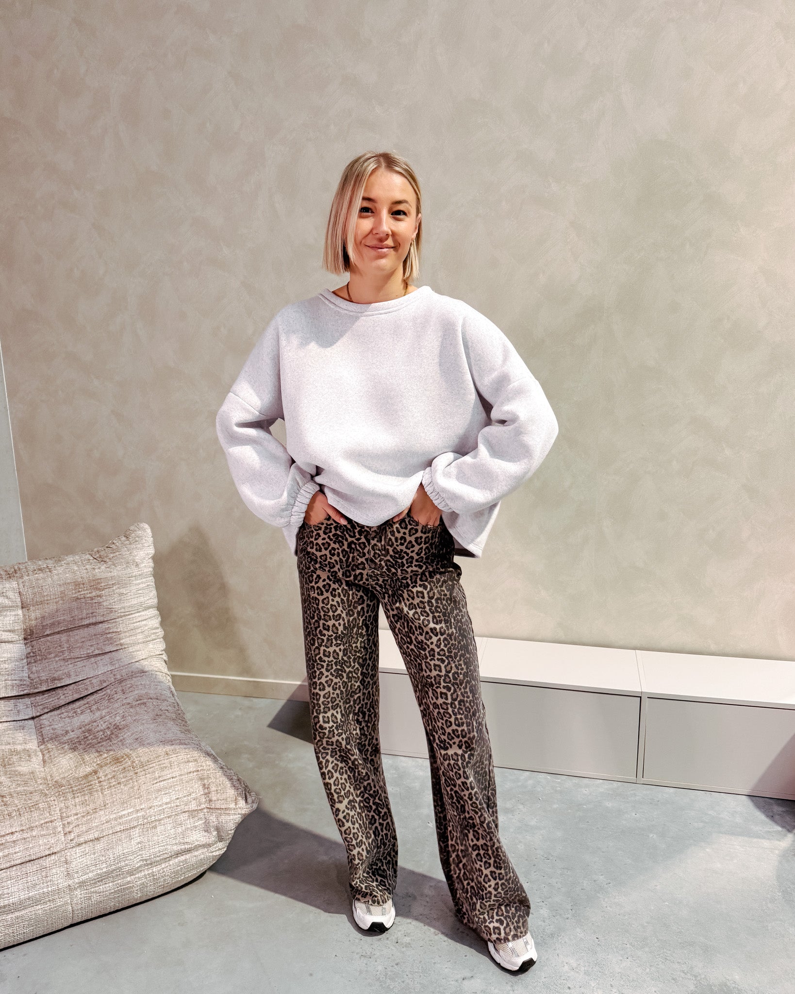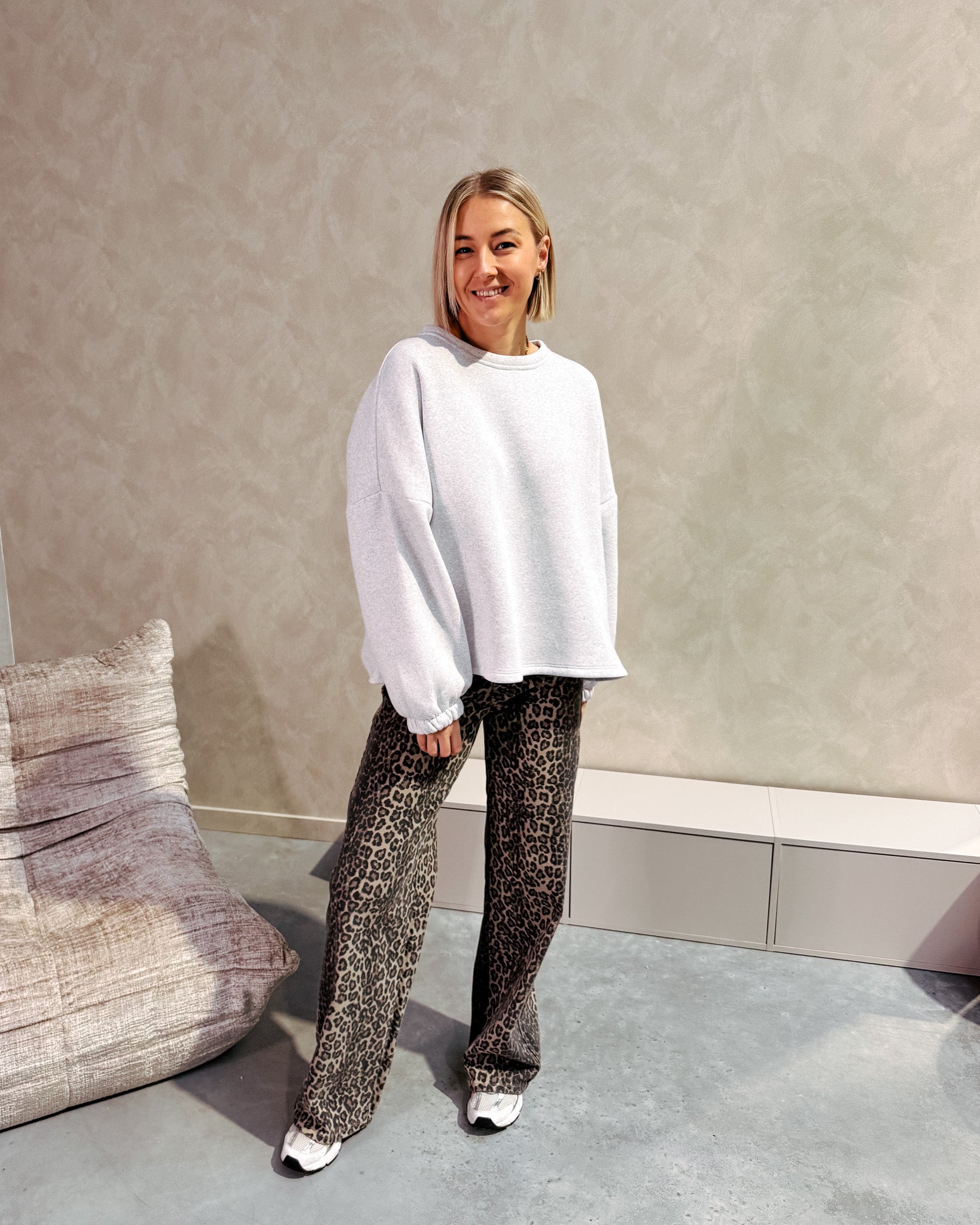 De sweater heeft een oversized model met zachte fleece stof binnen. Deze sweater draagt super zacht & comfortabel aan! Aan de mouwen zit er een elastiek, deze geven het een poofy detail! Op de sweater staat achteraan de tekst ‘BISOU’ in donker blauwe letters, deze geven een extra leuk detail aan de trui! Wij combineerden de sweater met de ‘ZARAH LEOPARD JEANS’ samen vormen ze een perfect geheel!