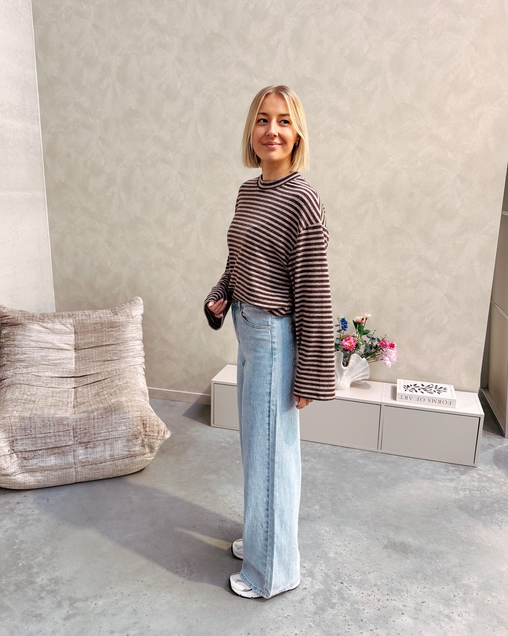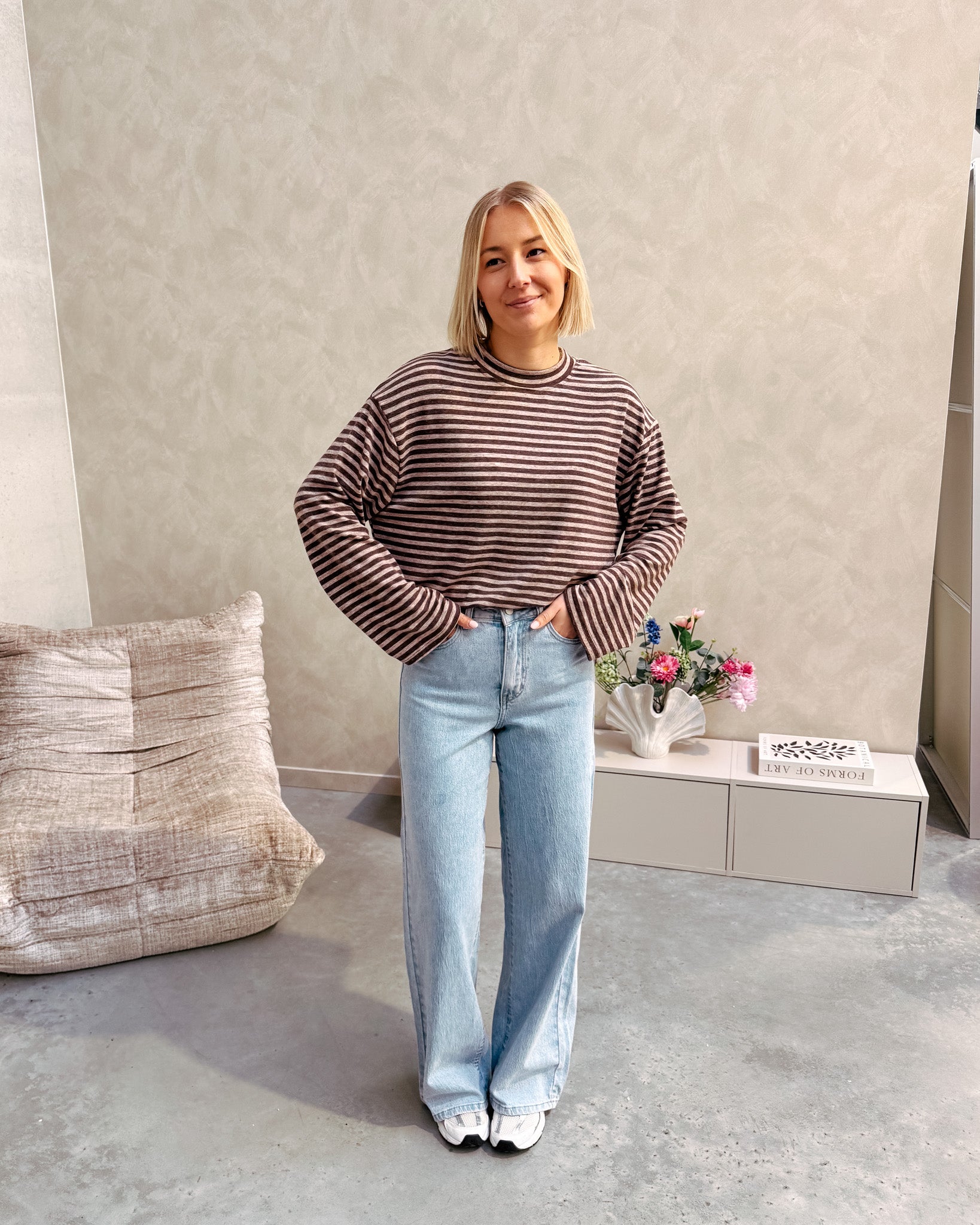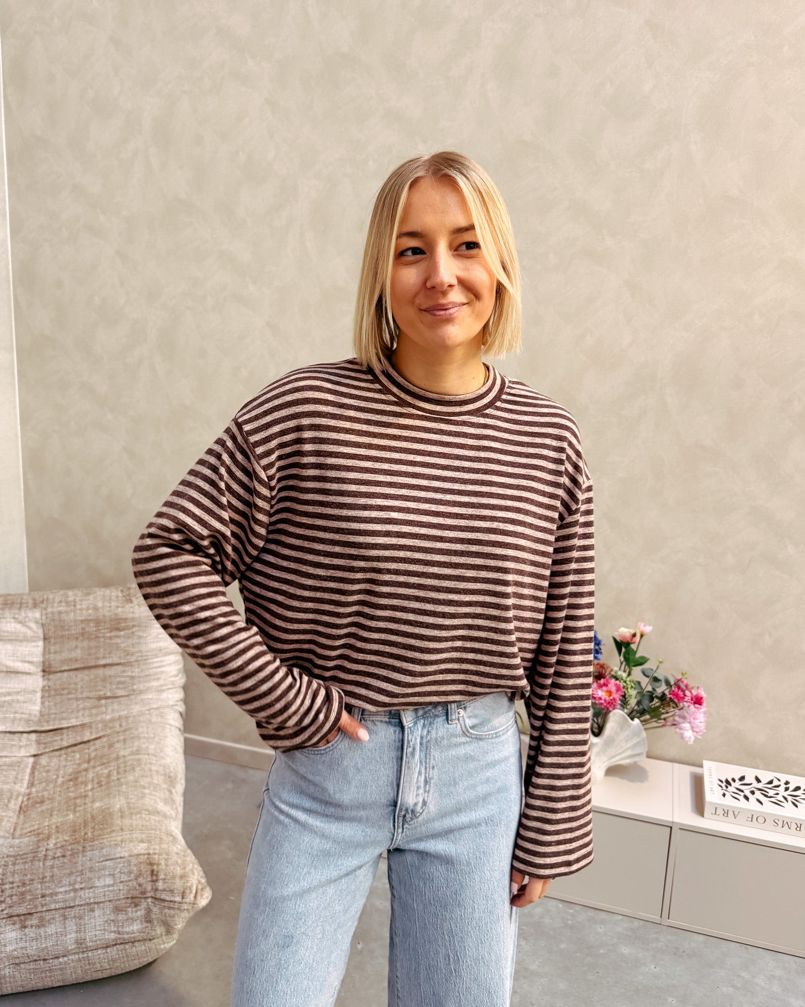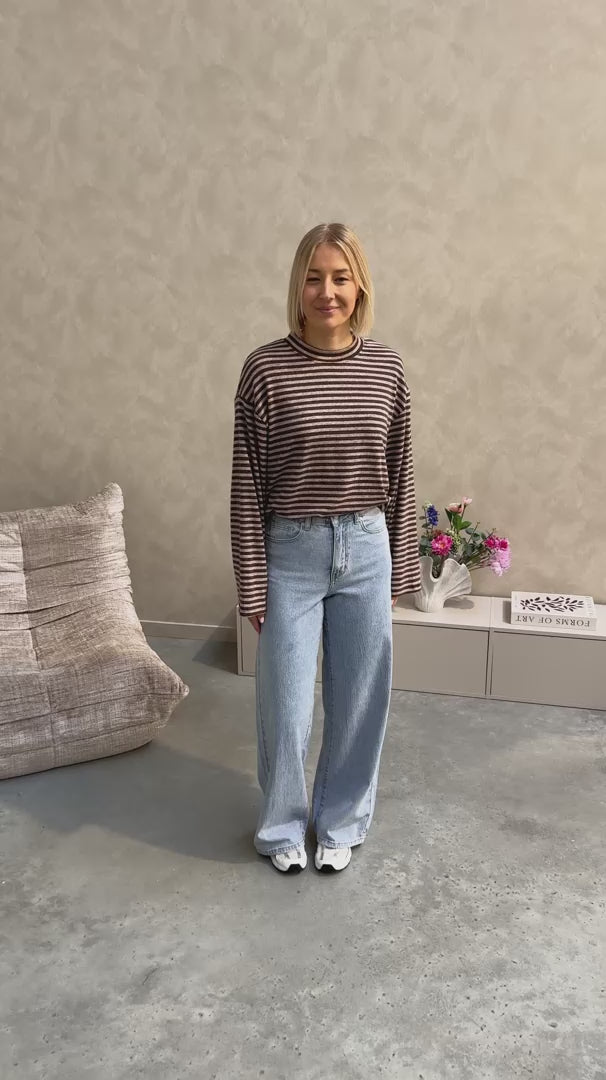 Het shirt met lange mouwen heeft een oversized fit. Ook heeft het brede mouwen en een tof streepjes patroon met chocolade bruin en beige. Dit shirt kan je ideaal nu al dragen met een cardigan/truitje erop en kan je zeker nog door dragen in de lente! Wij combineerden het shirt met de ‘THE NEW MAUD WIDE LEG JEANS - LIGHT BLUE’ samen vormen ze een perfect match! We raden aan het shirt met de hand te wassen.