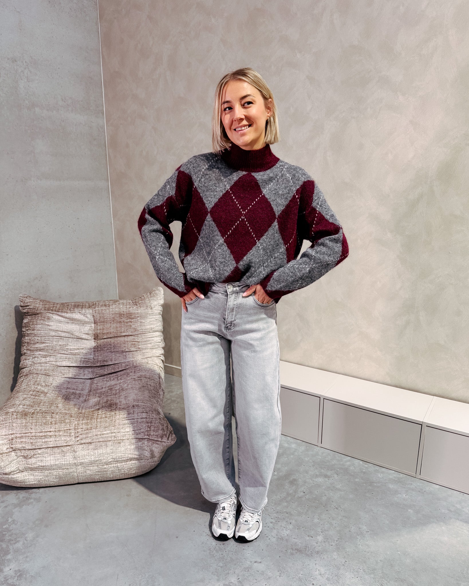 De trui heeft een opstaand kraagje met een leuk jacquard patroon. Deze trui draagt heel knus, zacht en warm aan! Wij zijn helemaal fan van de cozy kleuren combinatie van deze trui. Alhoewel er wol in de trui zit, prikt deze niet! Wij combineerden de trui met de ‘GAIA BALLOON FIT JEANS - LIGHT GREY’ samen vormen ze een perfect match! We raden aan de trui met de hand te wassen.