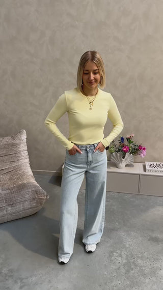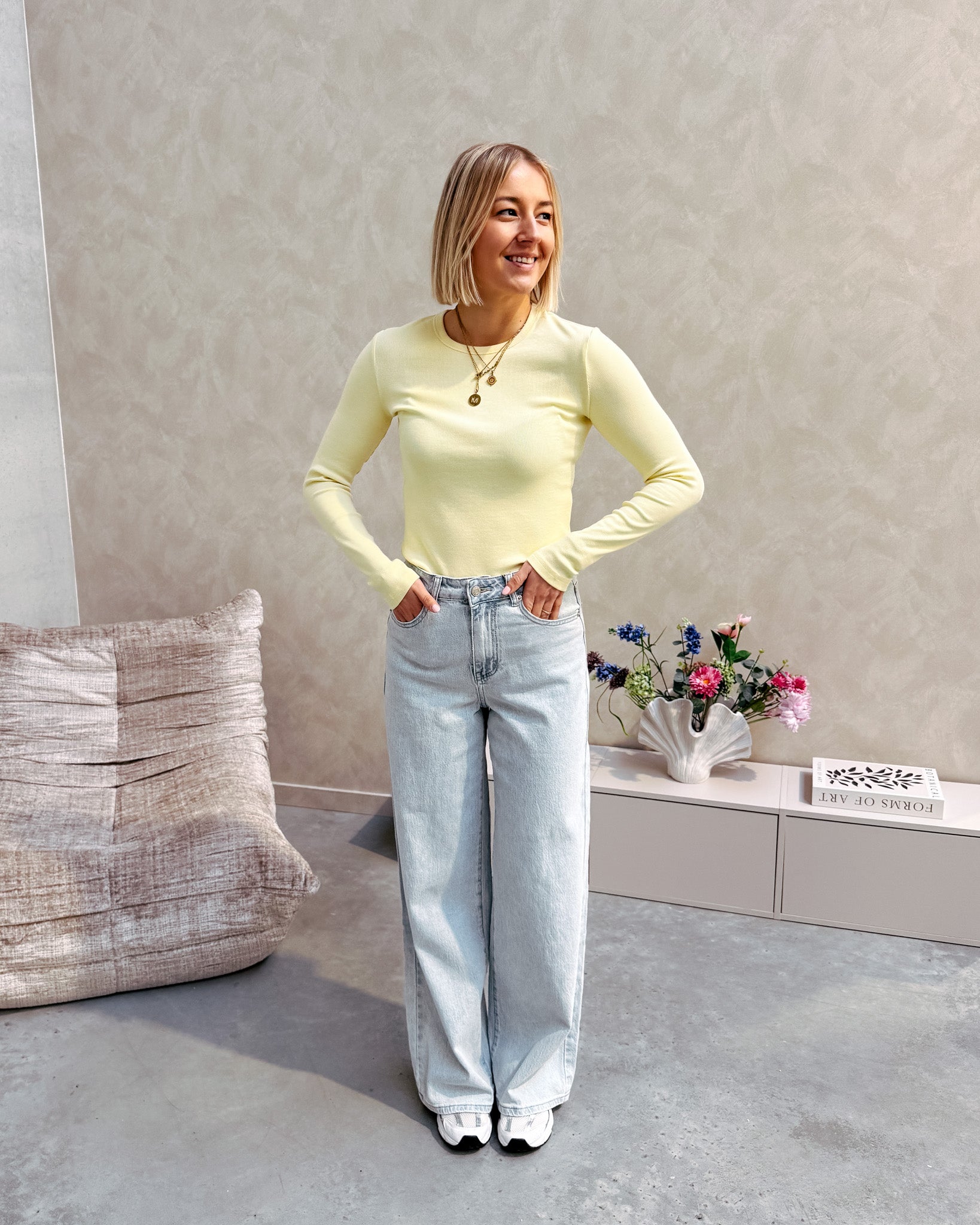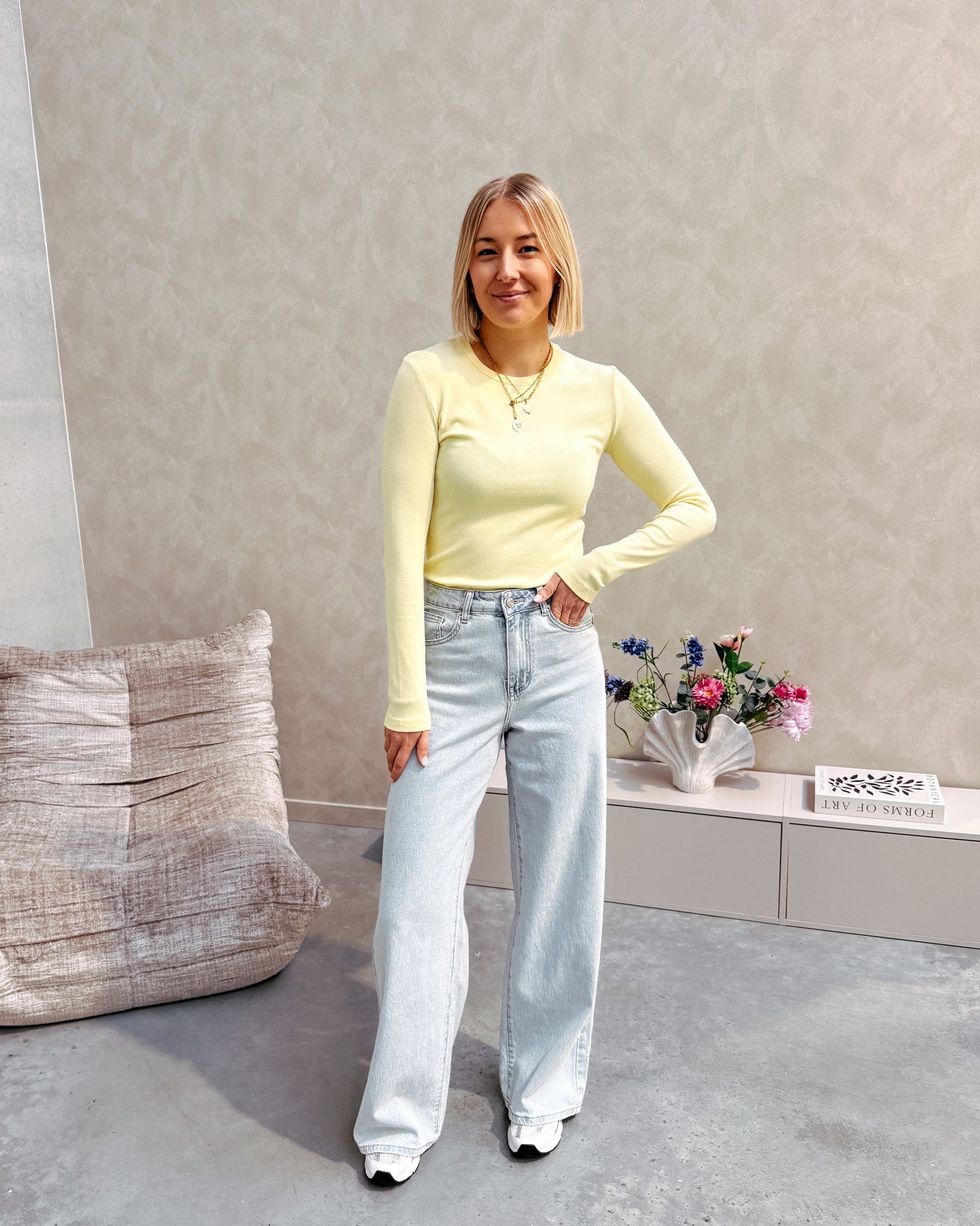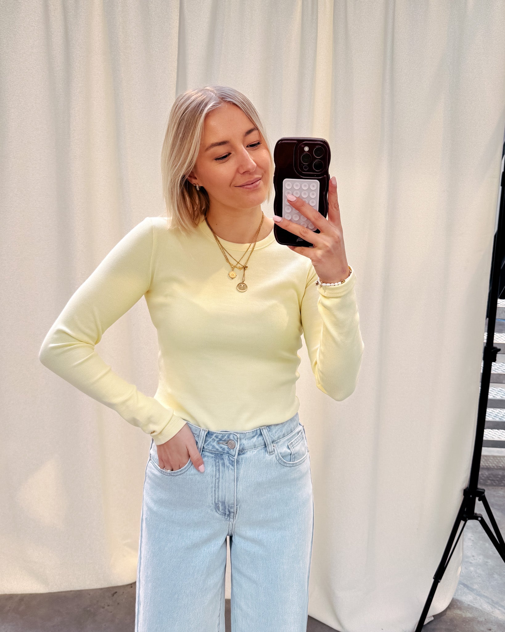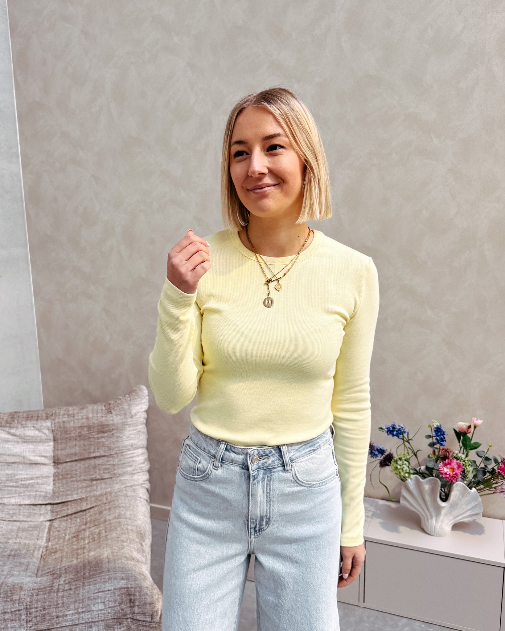 De longsleeve heeft een aansluitend model met heel veel stretch in. Het shirt is gemaakt van een zacht rib stofje in een prachtige botergele kleur. Wij combineerden het shirt met de 'MAUD WIDE LEG JEANS - LIGHT BLUE' samen vormen ze een perfect geheel. Geef deze outfit een twist met de 'AYLA SCARF - YELLOW/KAKI'. We raden aan het shirt met de hand te wassen.