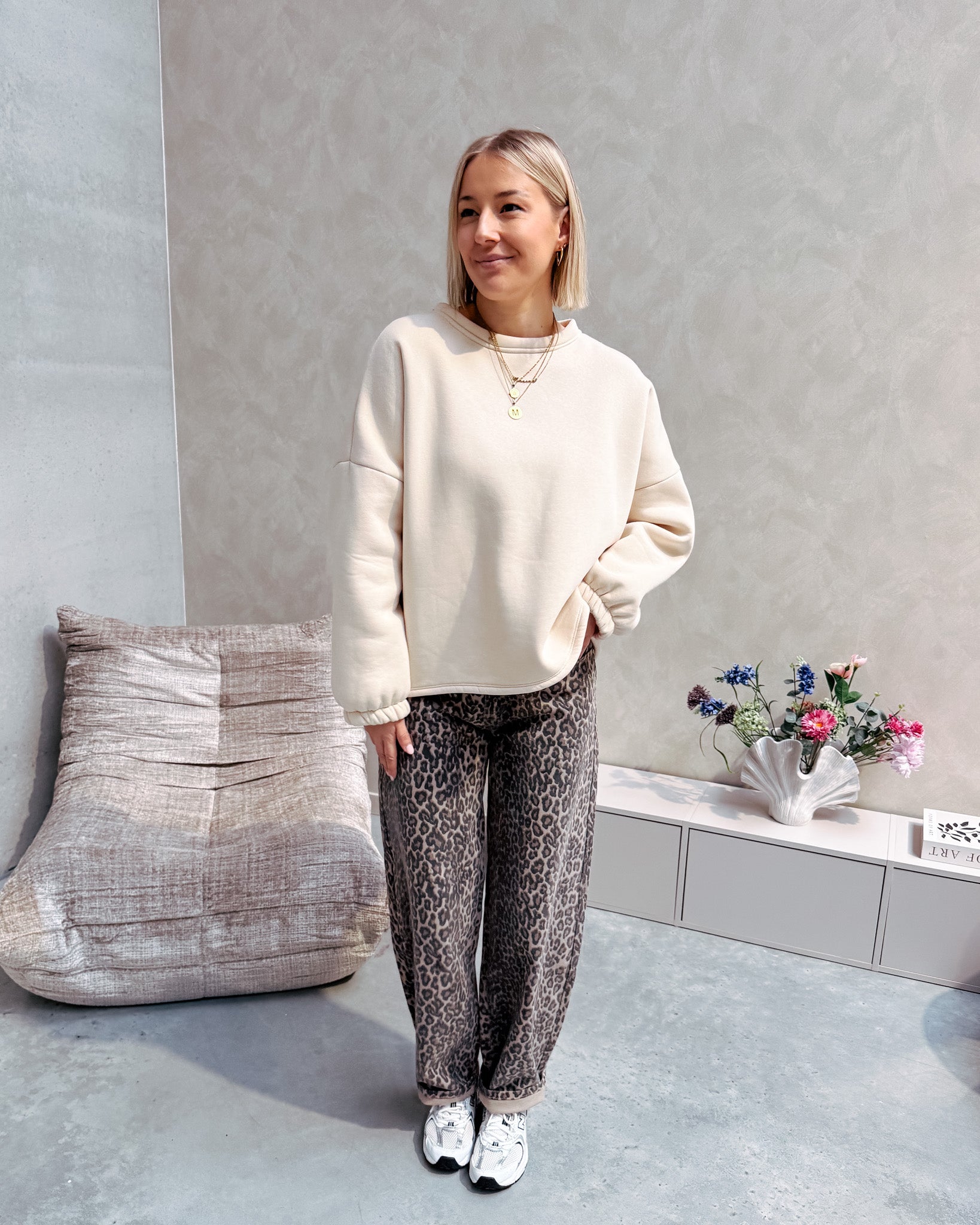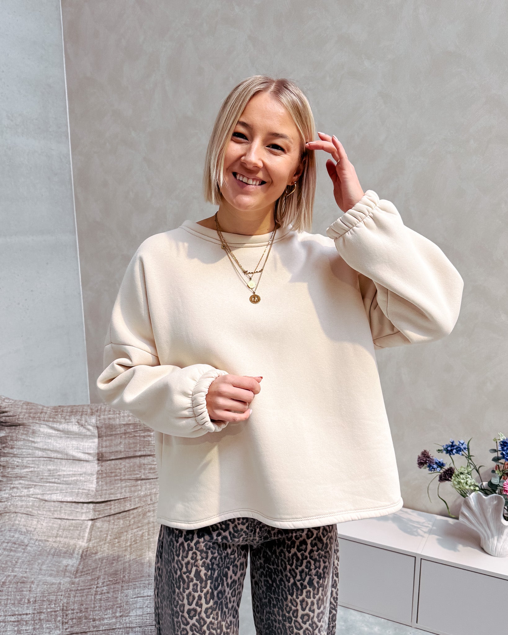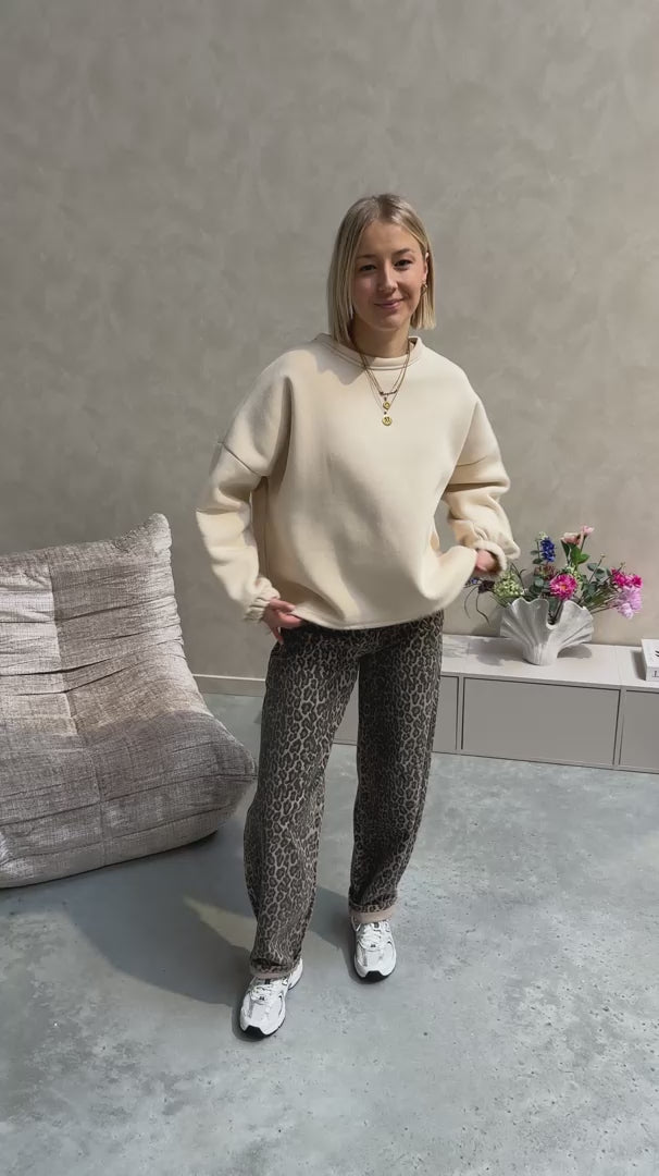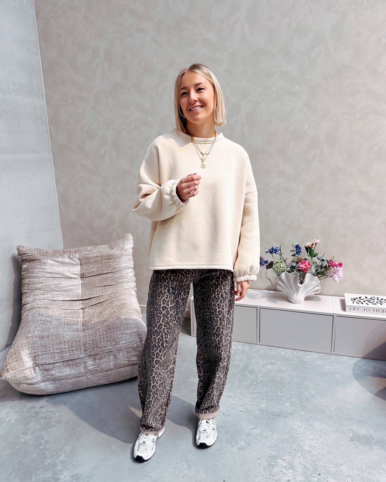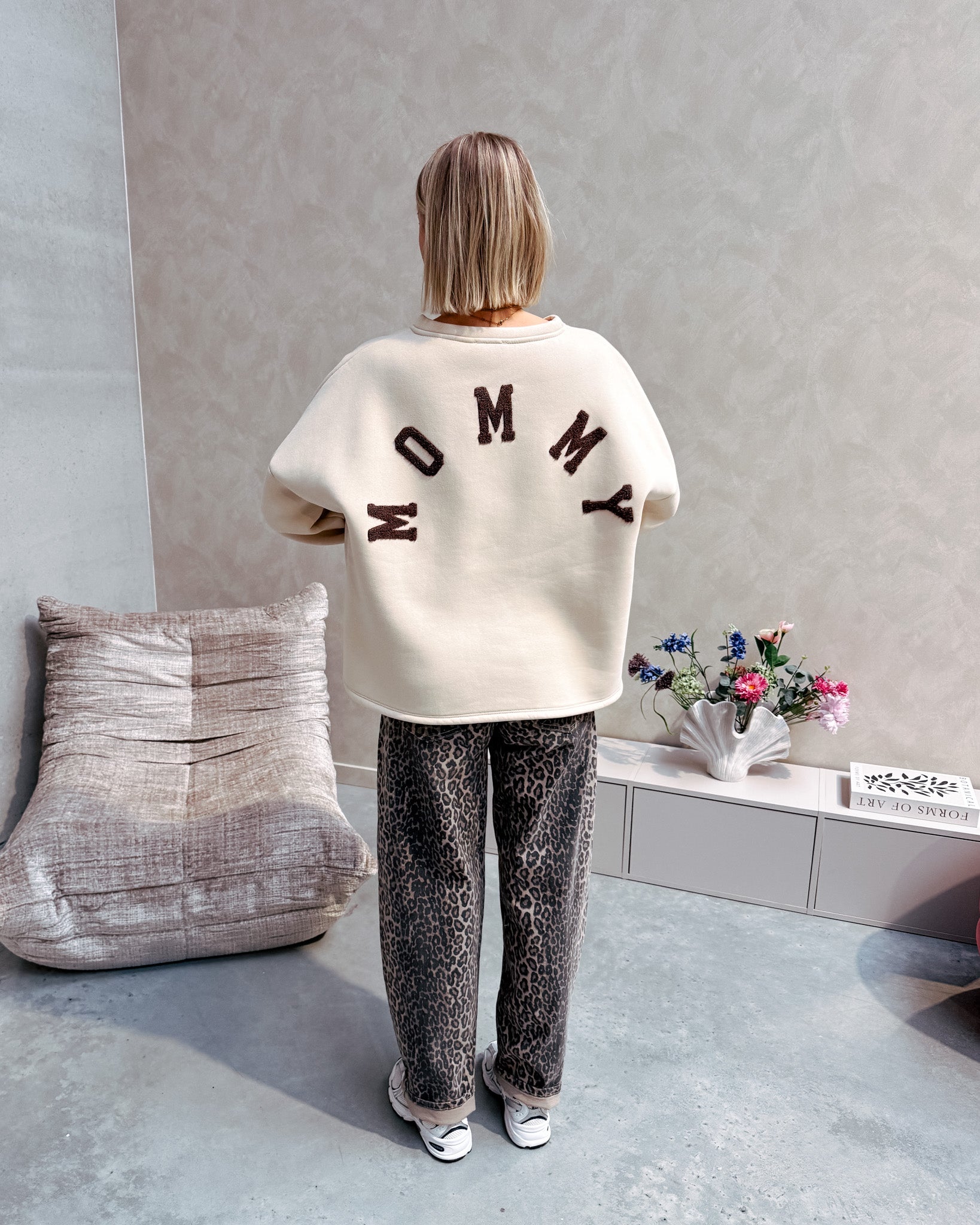 De sweater heeft een oversized model met een zachte fleece stof aan de binnenkant. Deze sweater draagt super zacht & comfortabel aan! Aan de mouwen zit er een elastiek, deze geven het een poofy detail! Op de sweater staat achteraan de tekst ‘MOMMY’ in bruine letters, deze geven een extra leuk detail aan de trui! Mom life, but make it comfy. Deze mommy sweater is jouw nieuwe favoriet voor elke dag – zacht, relaxed en met een knipoog. De perfecte mix van comfort en stijl voor elke mama! Wij combineerden de sweater met de ‘PRETTY WILD BALLOON JEANS’ en ‘HEART HOOP EARRINGS - GOLD’ samen vormen ze een perfect geheel!