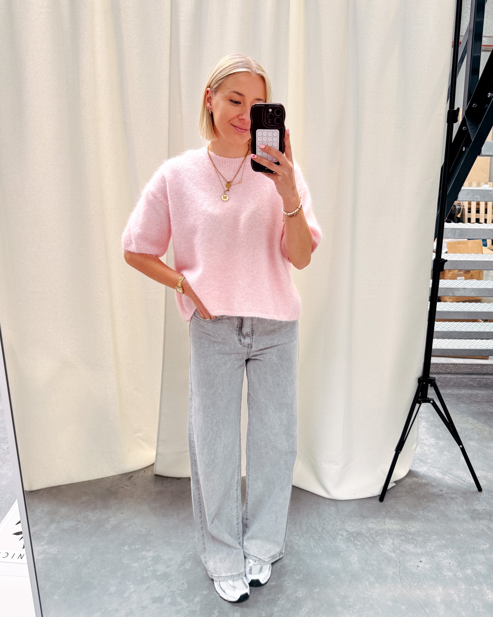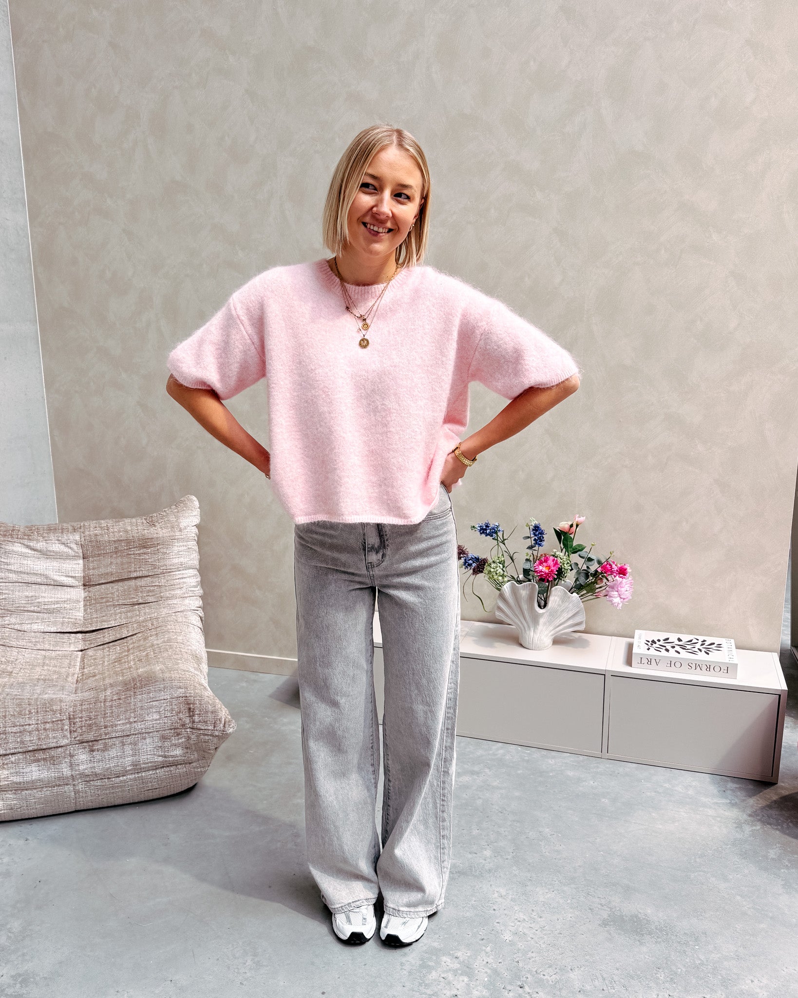 De trui is super zacht van stof en heeft korte mouwen. Deze trui heeft prachtige kanten details. Het truitje heeft achteraan een v-hals snit met een doorschijnend kanten stofje eronder, deze geven de trui zo een mooi effect! Alhoewel er wol in de trui zit, prikt deze niet! Wij combineerden de trui met de 'THE GREY MAUD WIDE LEG JEANS' samen vormen ze een mooi geheel! We raden aan om de trui met de hand te wassen.