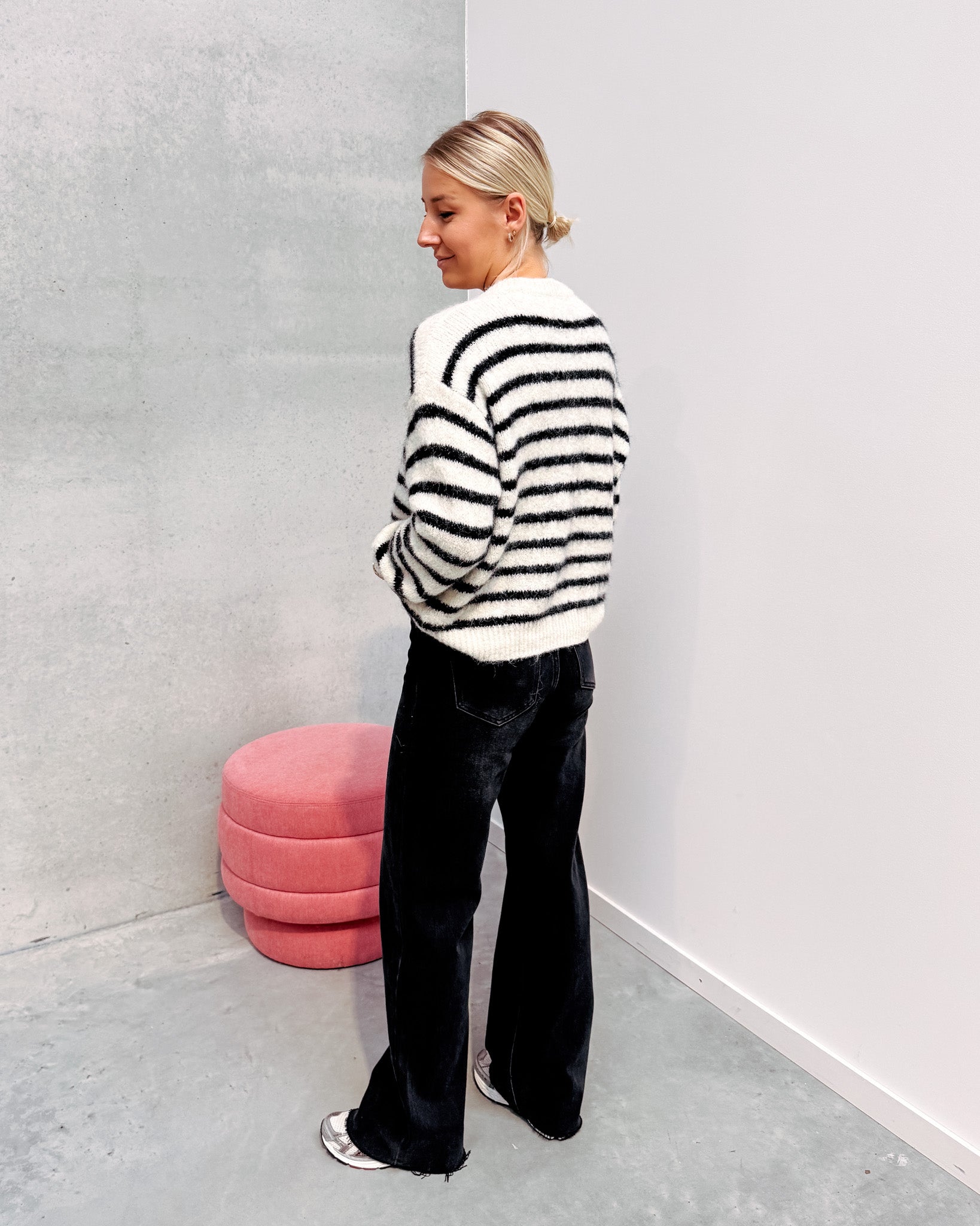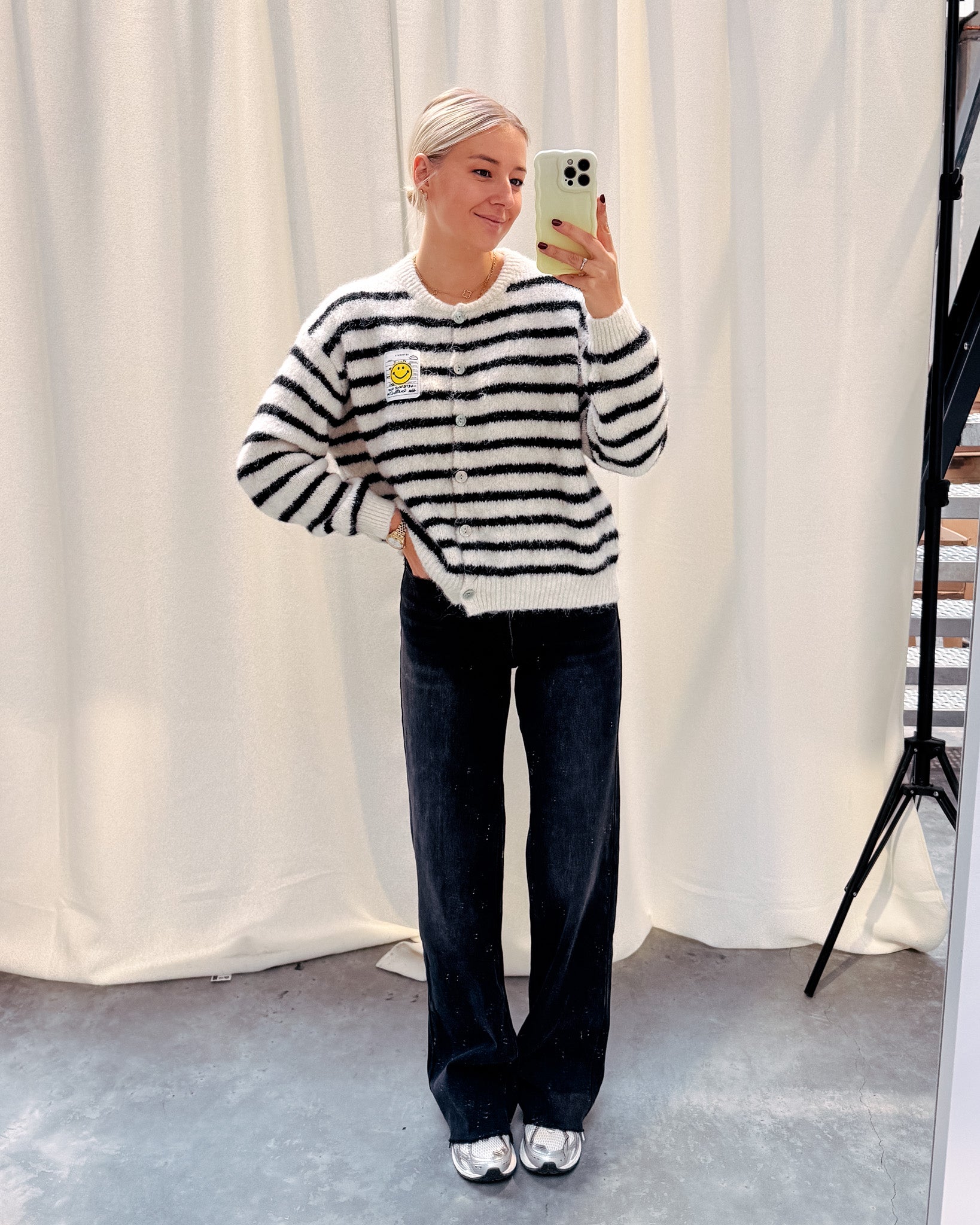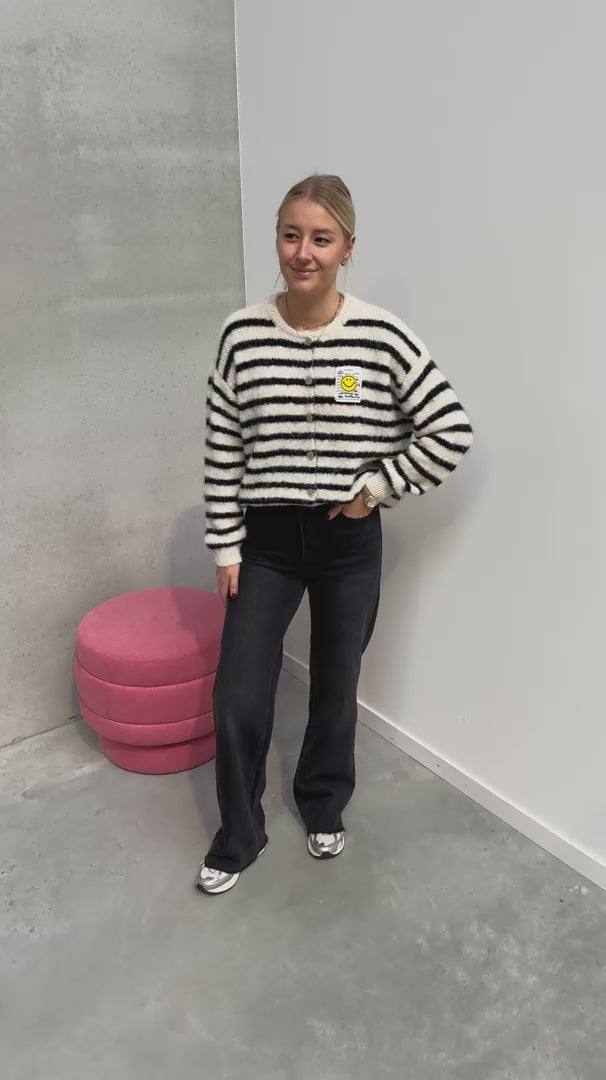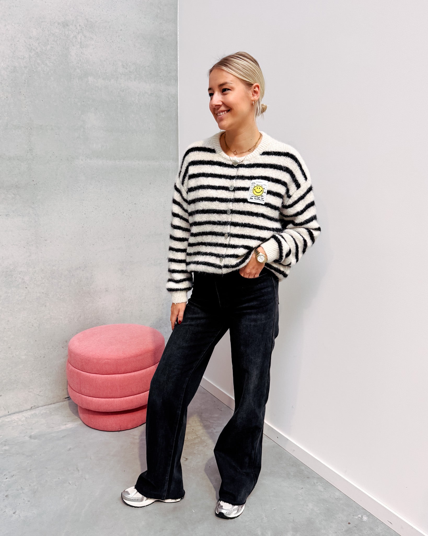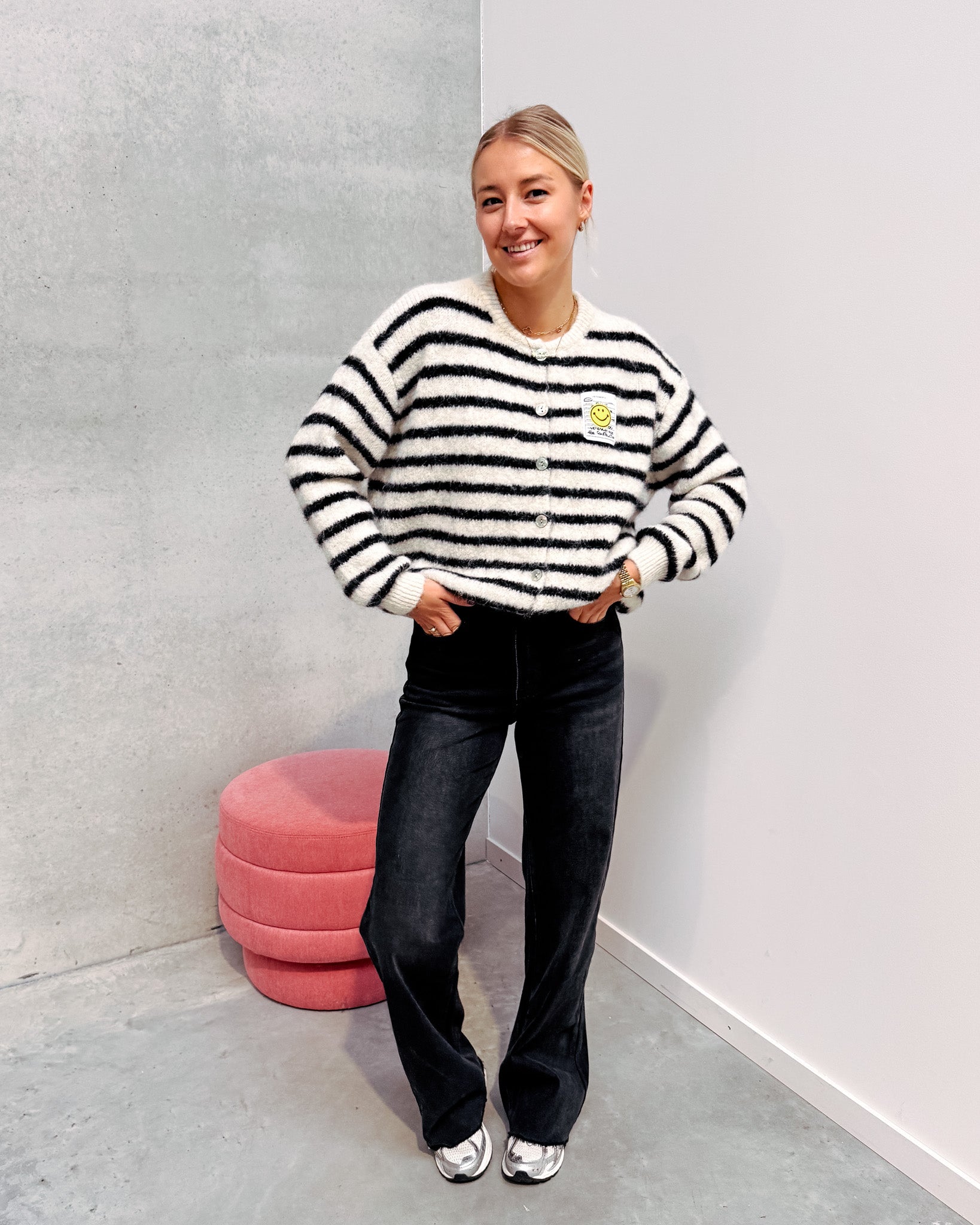 De cardigan sluit met witte knopjes. Je kan deze zowel open dragen als een vestje of gesloten als een truitje. De cardigan draagt super zacht aan! Alhoewel er wol in zit, prikt deze niet! Deze cardigan heeft een leuk streepjespatroon, ook zit er een afbeelding van een smiley op deze geeft het een extra leuke touch! Wij combineerden de cardigan met de ‘IDA CUT OFF JEANS - BLACK’ samen vormen ze een mooi geheel. We raden aan de cardigan met de hand te wassen.