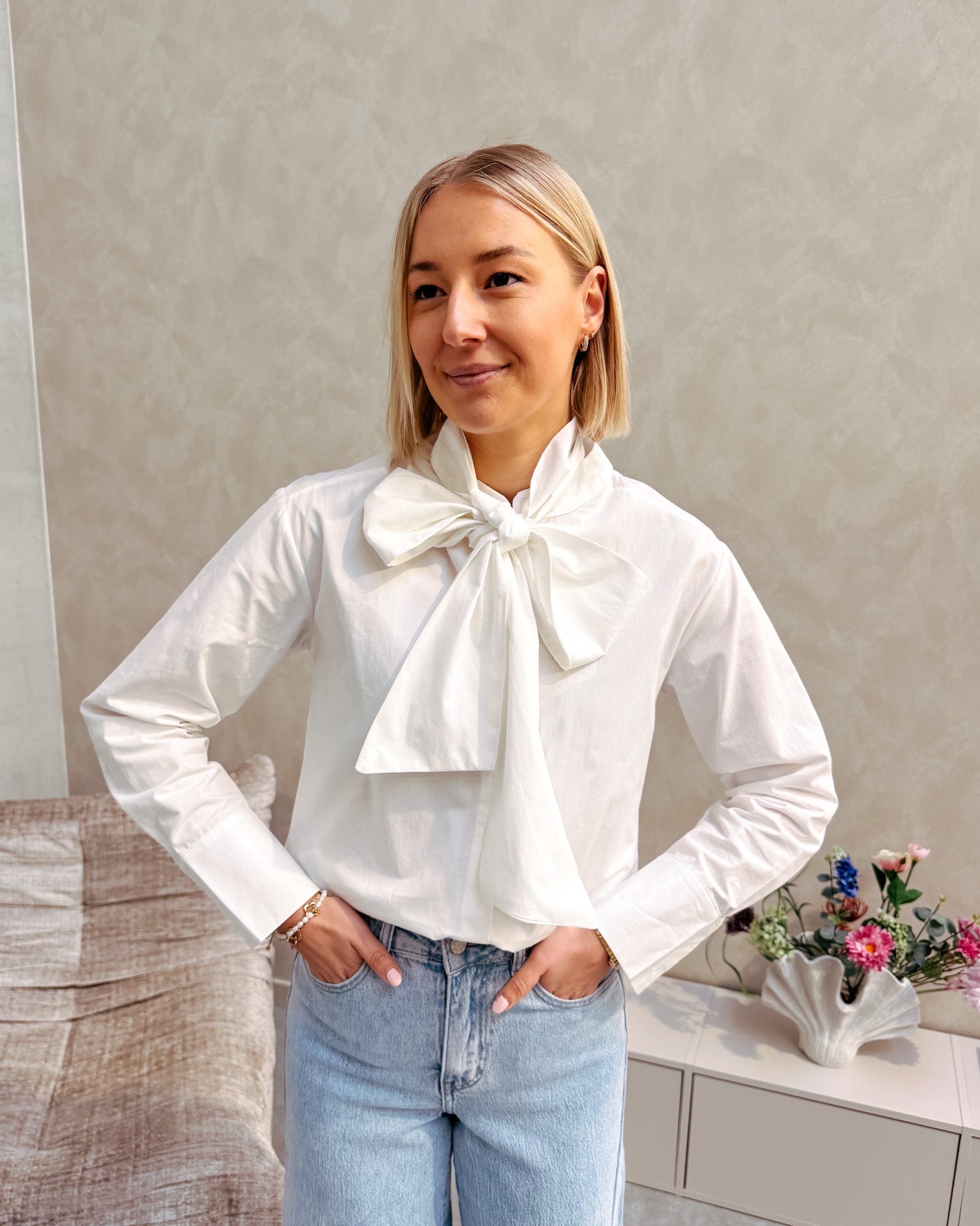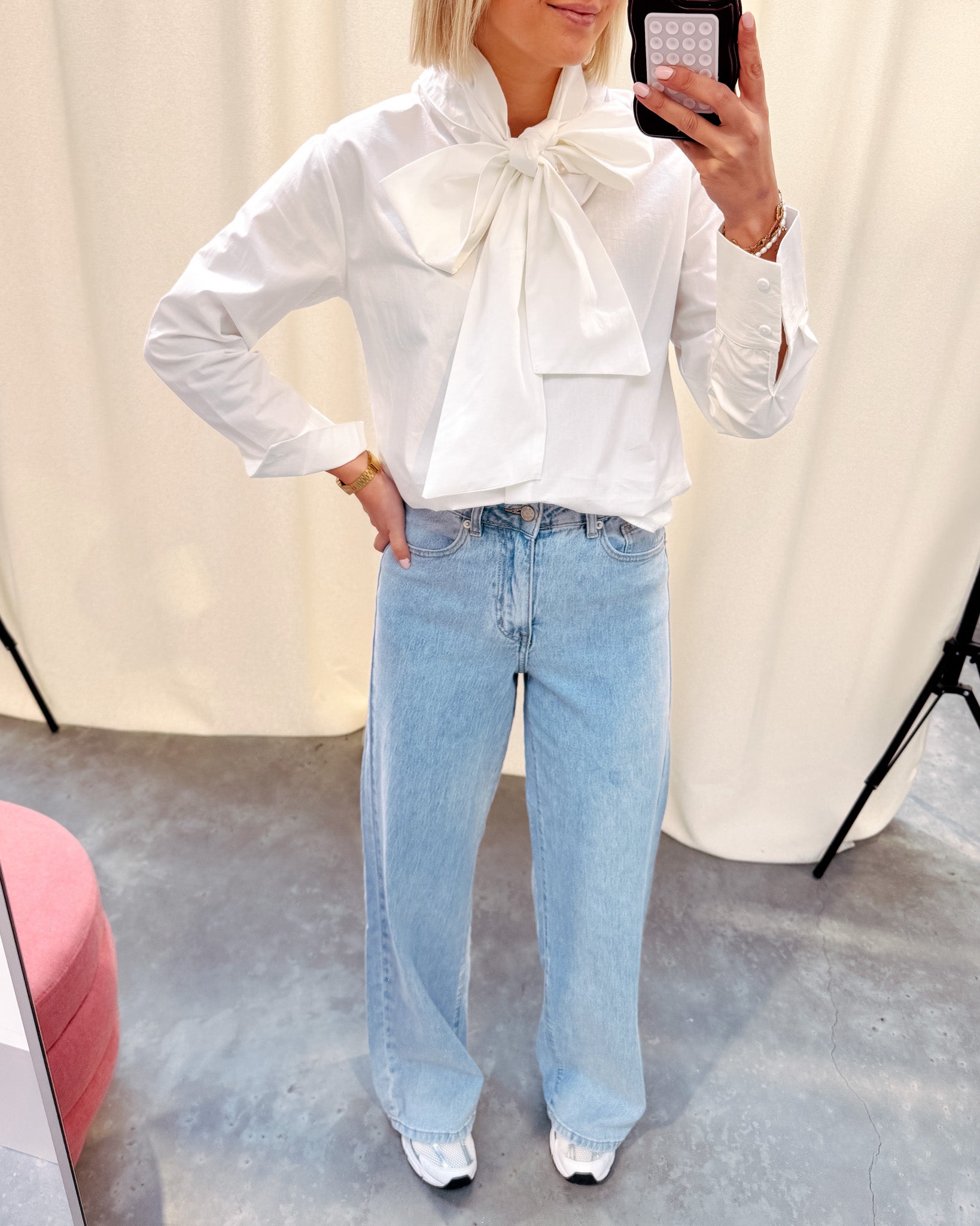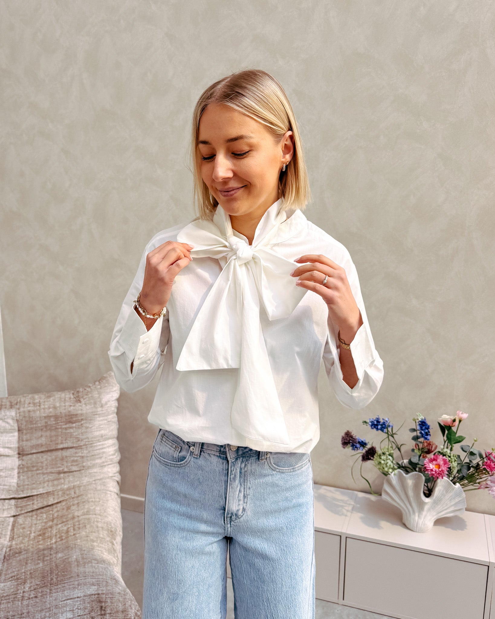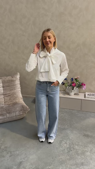 Het is een wit hemdje met een rond kraagje. Het hemd sluit met witte knopjes, bij het hemd zit ook een lintje bij. Met dit lintje kan je een hele mooie strik maken, deze geeft het hemd een mooi en elegant detail! Je kan het hemd zeker ook zonder het lint dragen. Wij combineerden het hemd met de ‘THE NEW MAUD WIDE LEG JEANS - LIGHT BLUE’ samen vormen ze een mooi geheel! We raden aan het shirt op een delicaat programma te wassen.