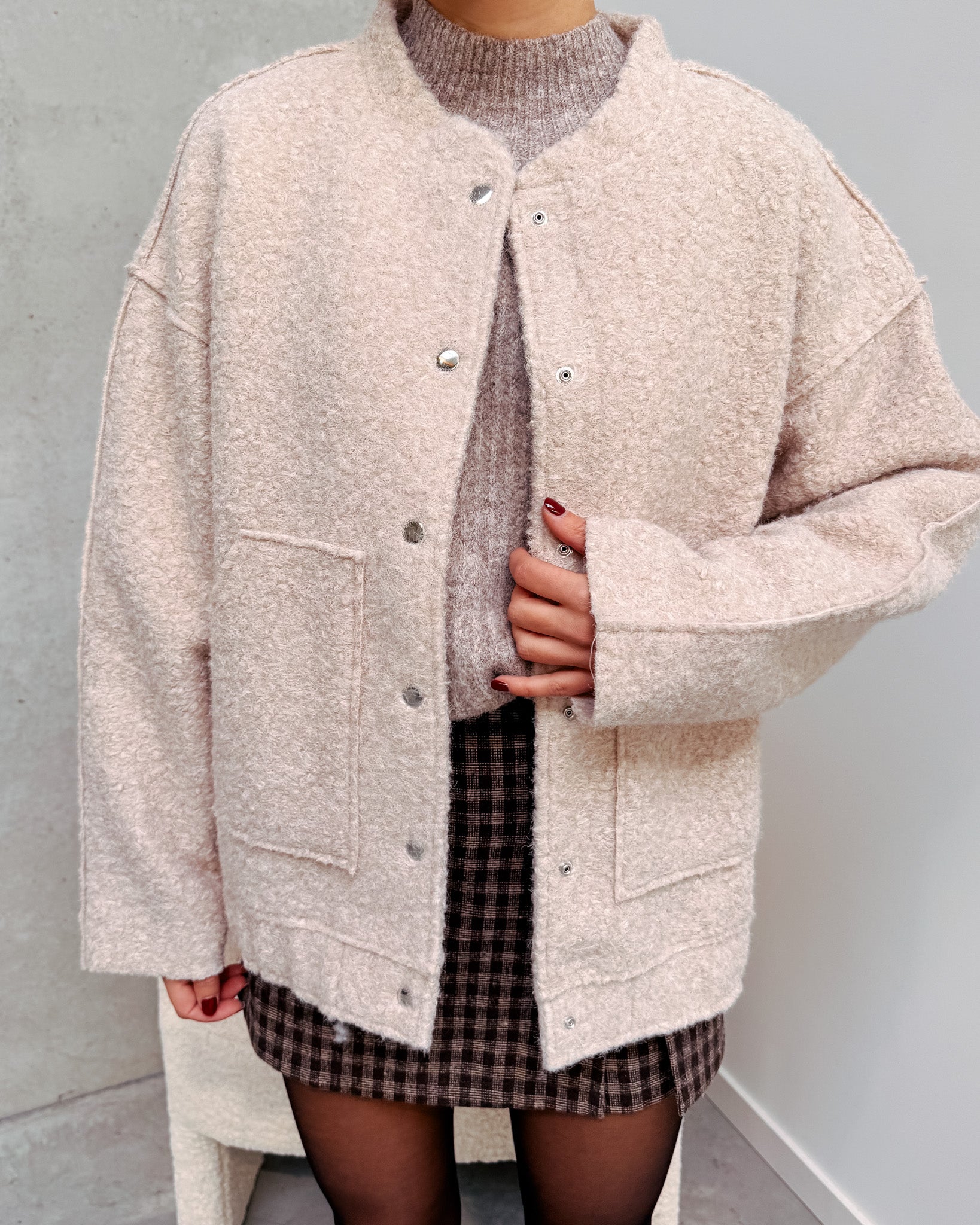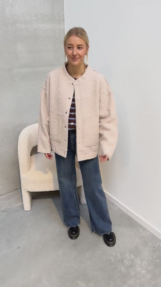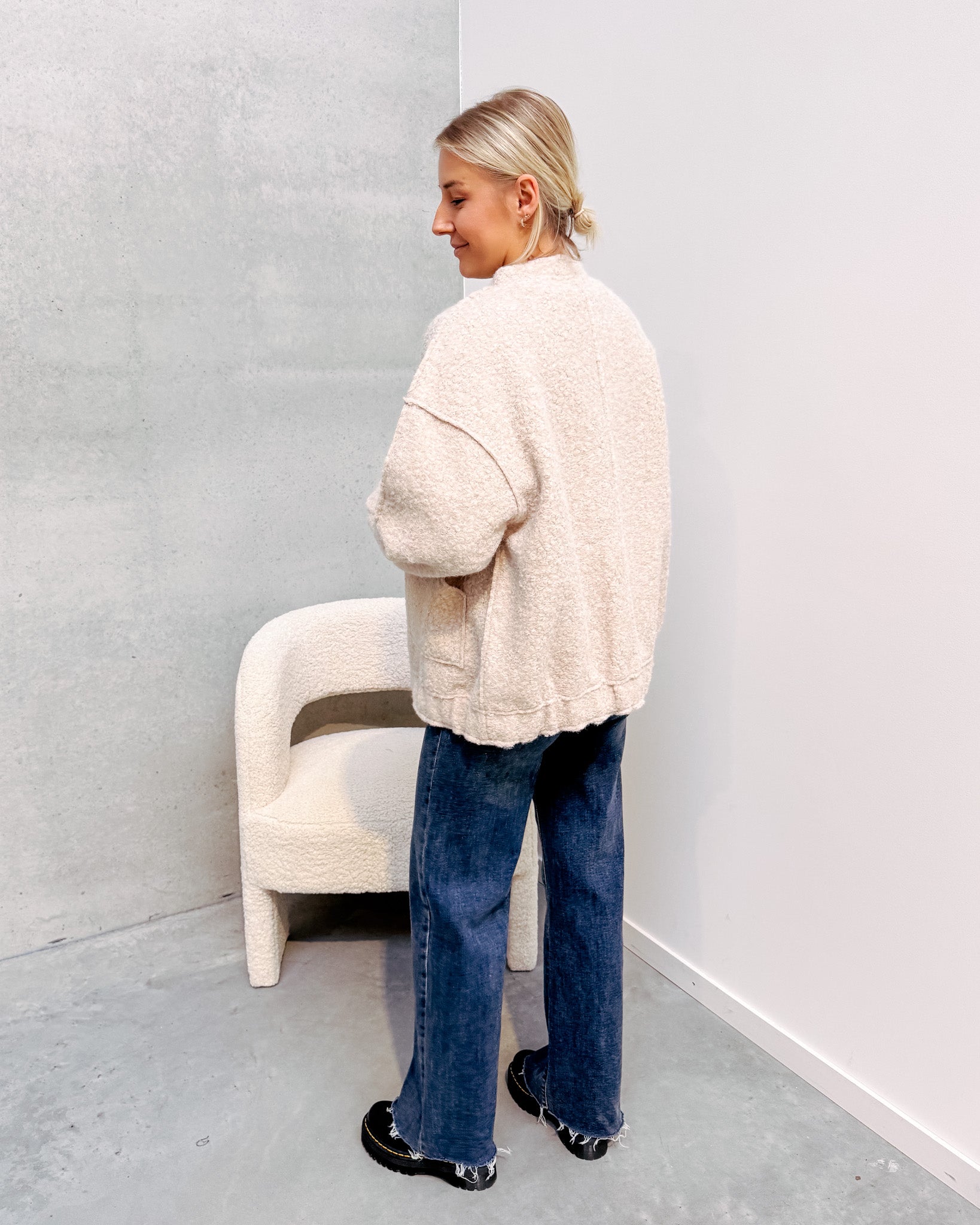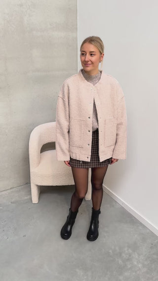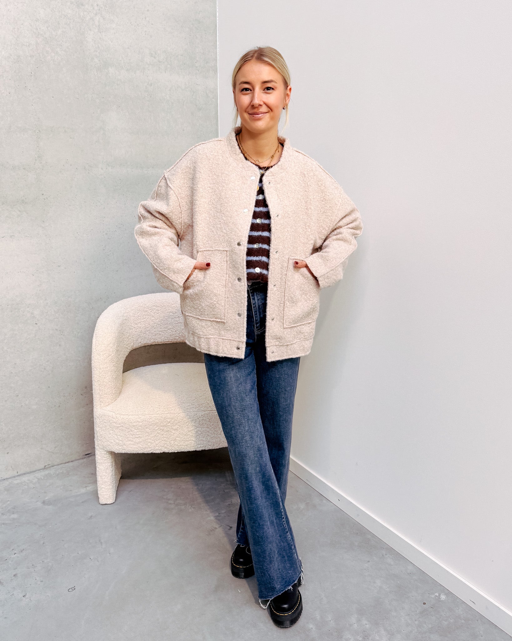 Het jasje heeft een oversized bomber model en valt iets langer. Het jasje heeft een zachte teddy stof. Dit jasje sluit met drukknopjes en heeft handige zakjes. Het ideale jasje om nu te dragen! Wij combineerden het jasje met ‘LYNN CUDDLY KNIT - TAUPE, 'MORGAN CHECKED SKIRT’ 'PERFECT BLACK PANTY' & 'BLISS BUCKLE BOOTS - BLACK' samen vormen ze een perfect geheel! Ook combineerden wij het jasje met de 'ODA CUT OFF JEANS - BLUE' en 'MIREILLE CARDIGAN - BLUE/BROWN' voor een casual look!