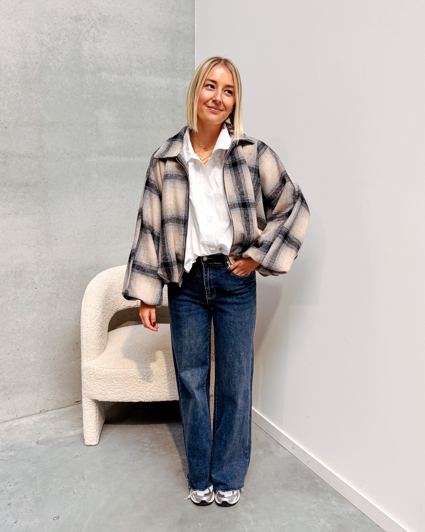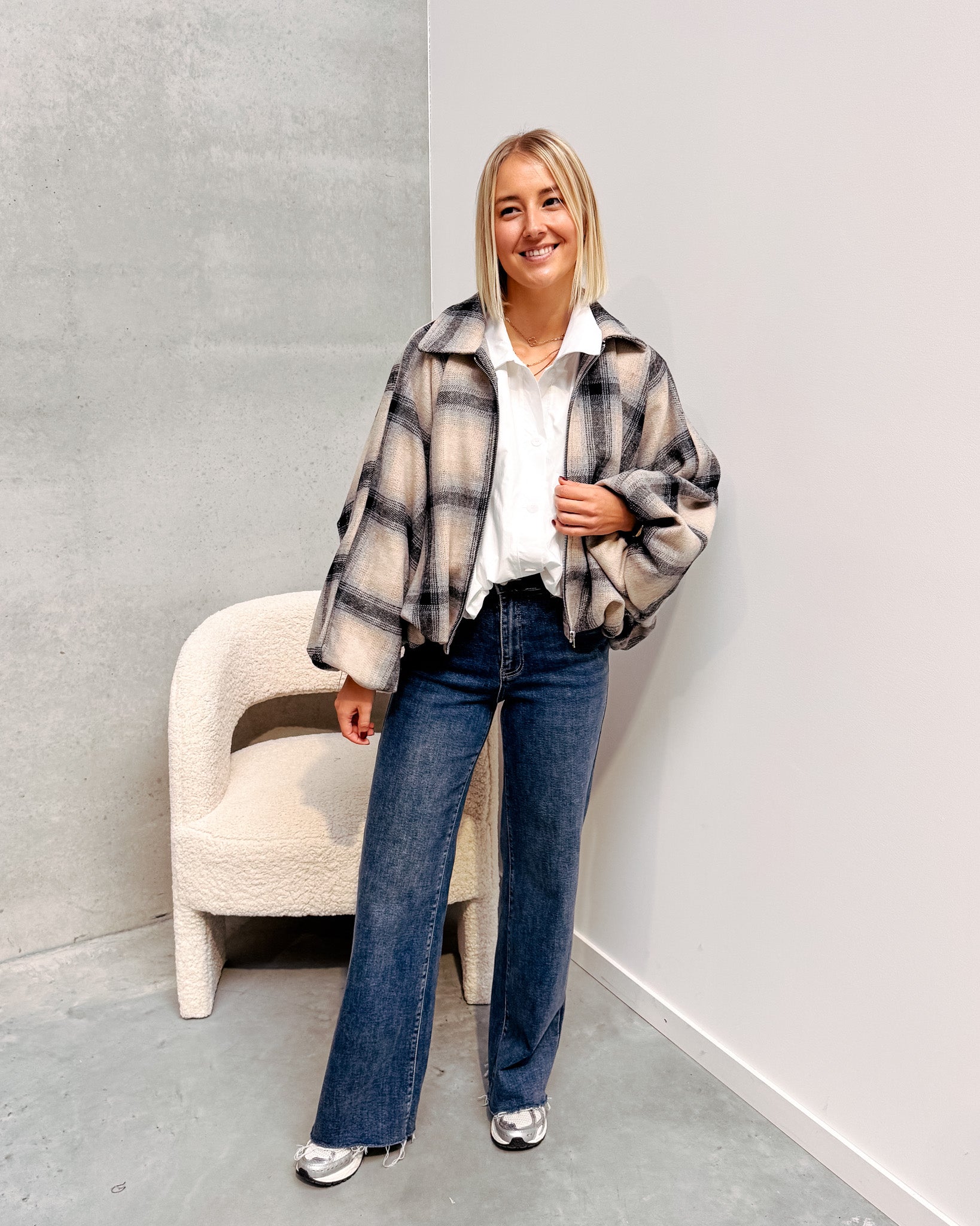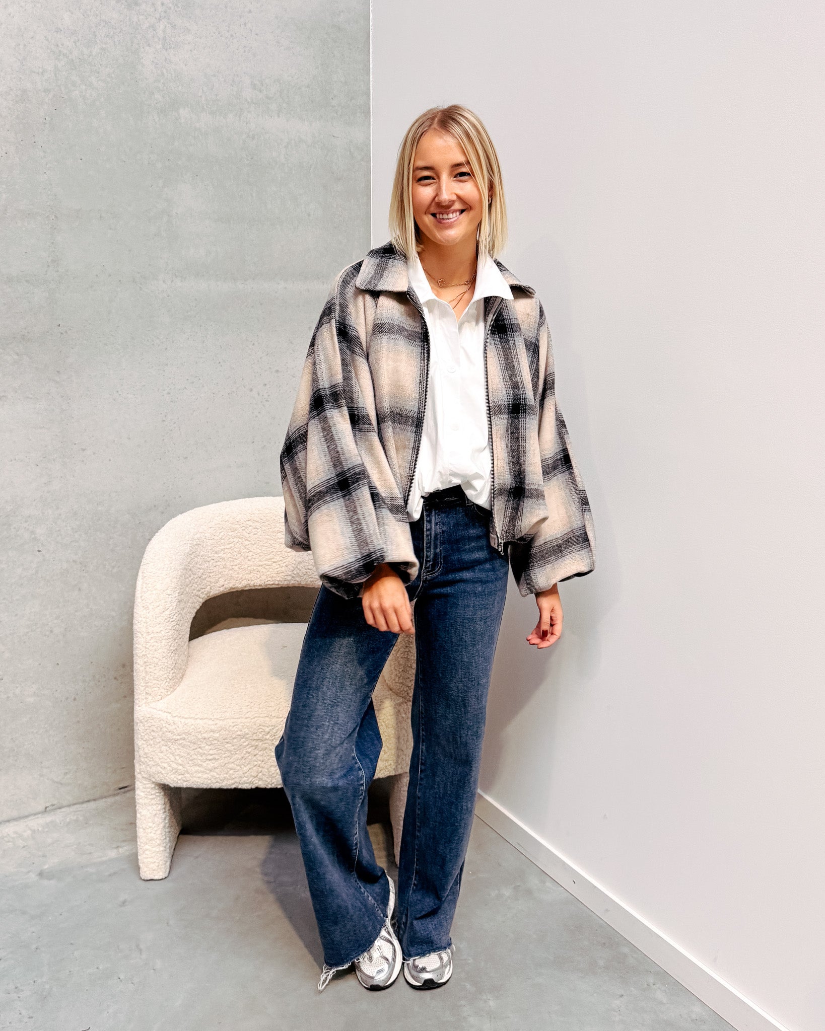 Deze jas is momenteel helemaal on trend. De jas heeft een wollen stofje met een prachtig geruit printje! Deze jas heeft leuke pofmouwen, een oversized model en valt lekker poofy! Wij combineerden de jas met de ‘TARA STATEMENT BLOUSE -WHITE’ en ‘ODA CUT OFF JEANS - BLUE’ samen vormen ze een perfect geheel!