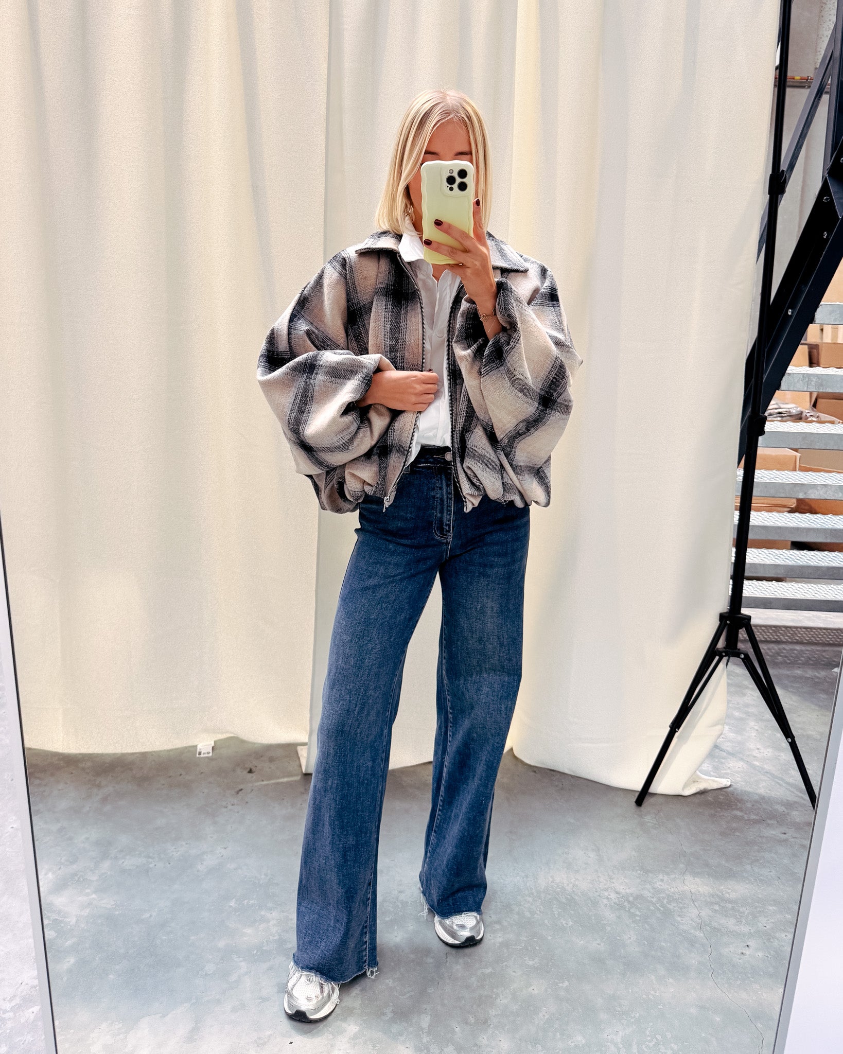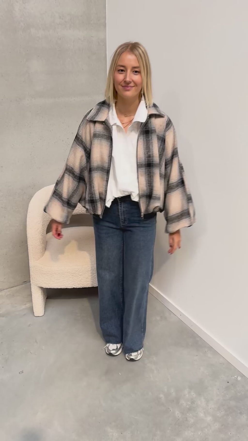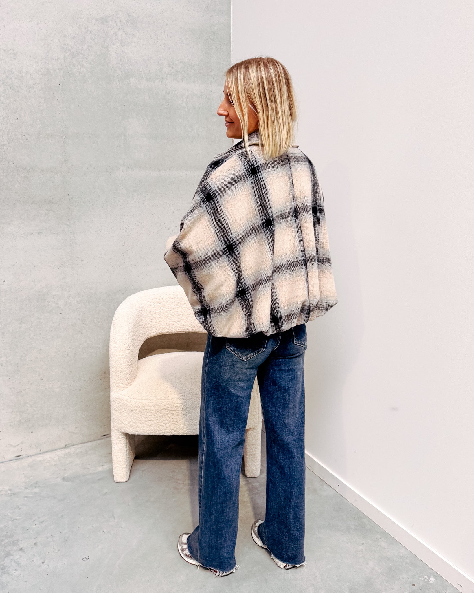 Deze jas is momenteel helemaal on trend. De jas heeft een wollen stofje met een prachtig geruit printje! Deze jas heeft leuke pofmouwen, een oversized model en valt lekker poofy! Wij combineerden de jas met de ‘TARA STATEMENT BLOUSE -WHITE’ en ‘ODA CUT OFF JEANS - BLUE’ samen vormen ze een perfect geheel!