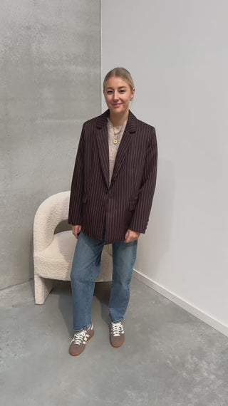 De blazer heeft een prachtige chocolade bruine kleur en heeft een krijtstreepje als detail. Ook heeft deze dichtgenaaide zakken. De blazer heeft een licht oversized model. Je kan deze zowel open dragen als gesloten met het knopje. Wij combineerden de blazer met de ‘ELSA MOM JEANS - BLUE’ en ‘DOTTY BOW KNIT - TAUPE’ samen vormen ze een perfect match! Je kan de blazer zowel casual als chic dragen!
