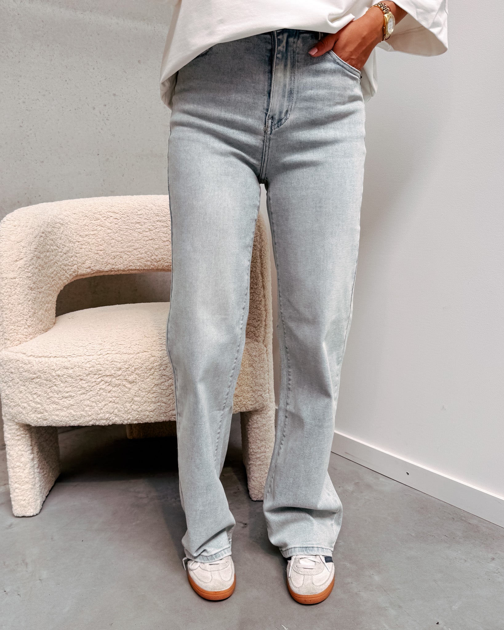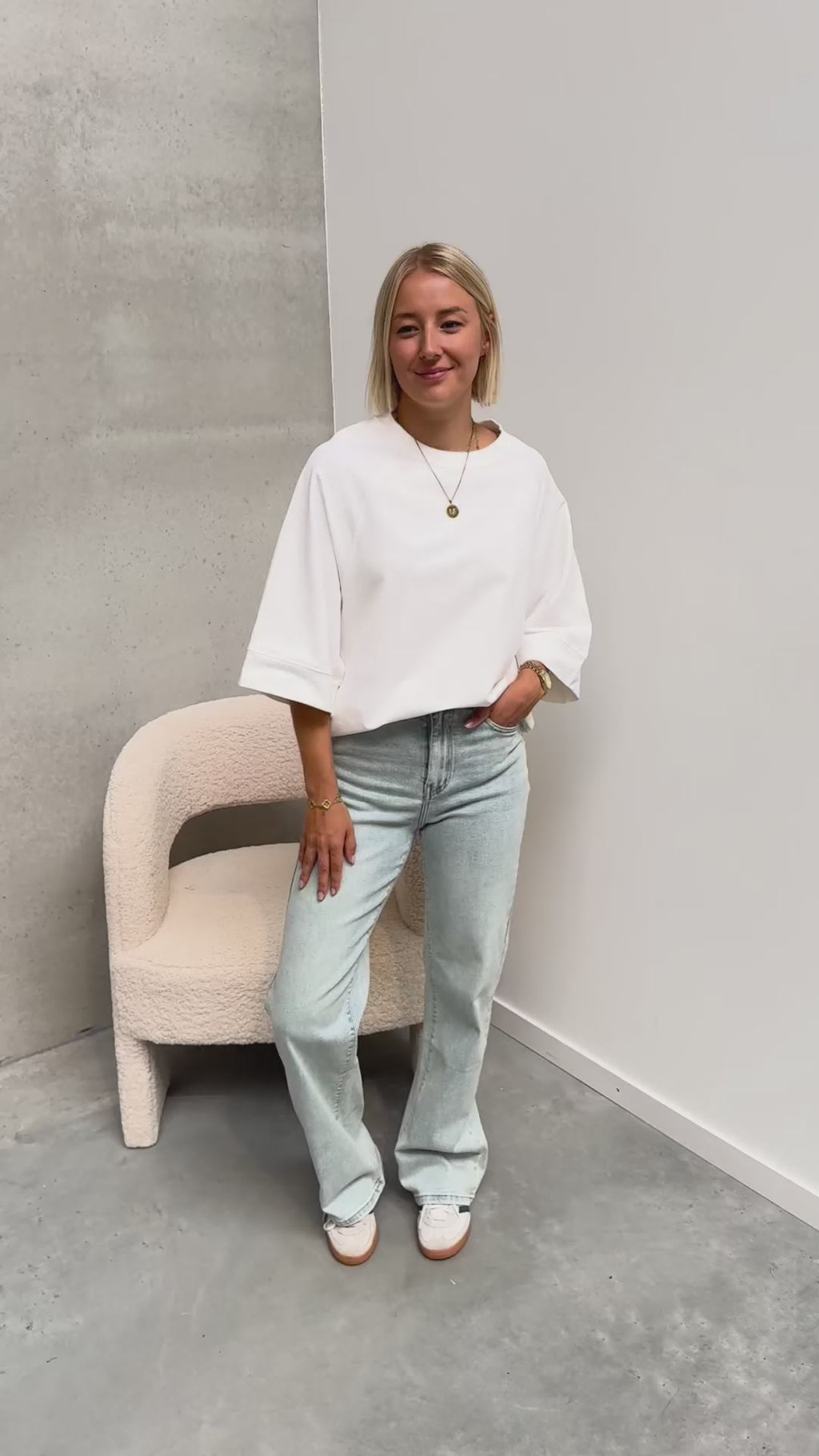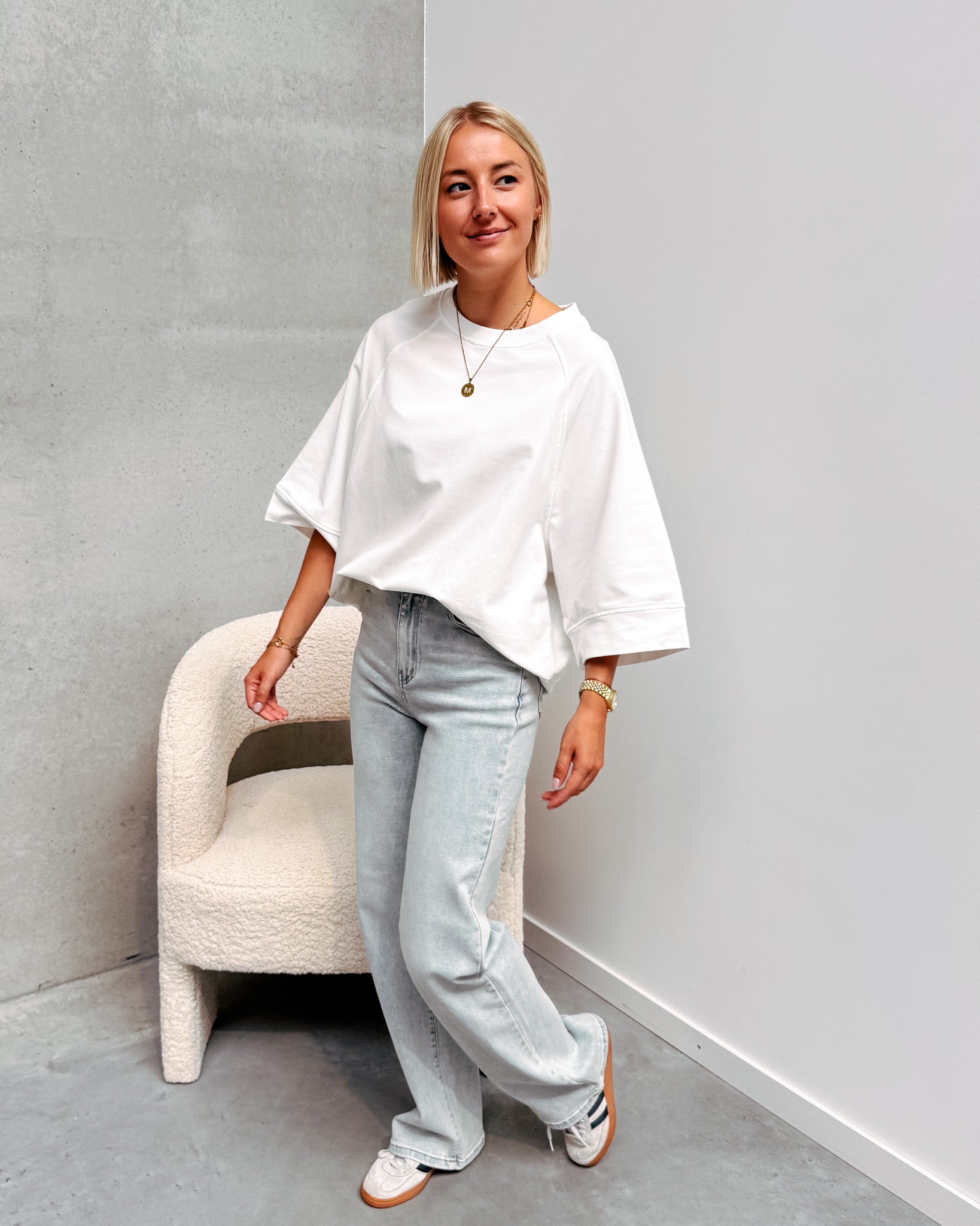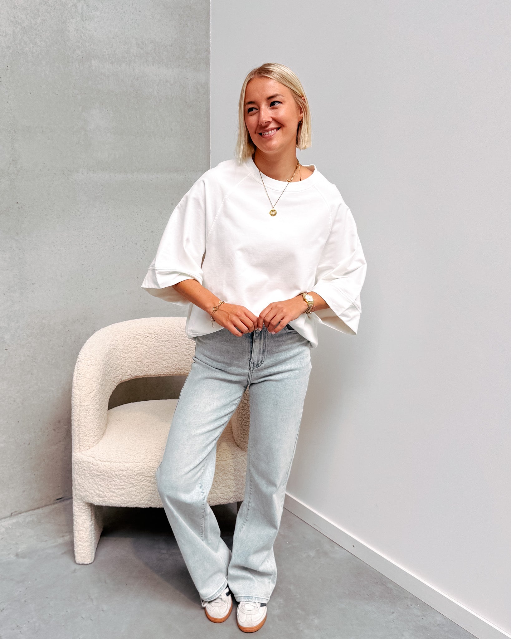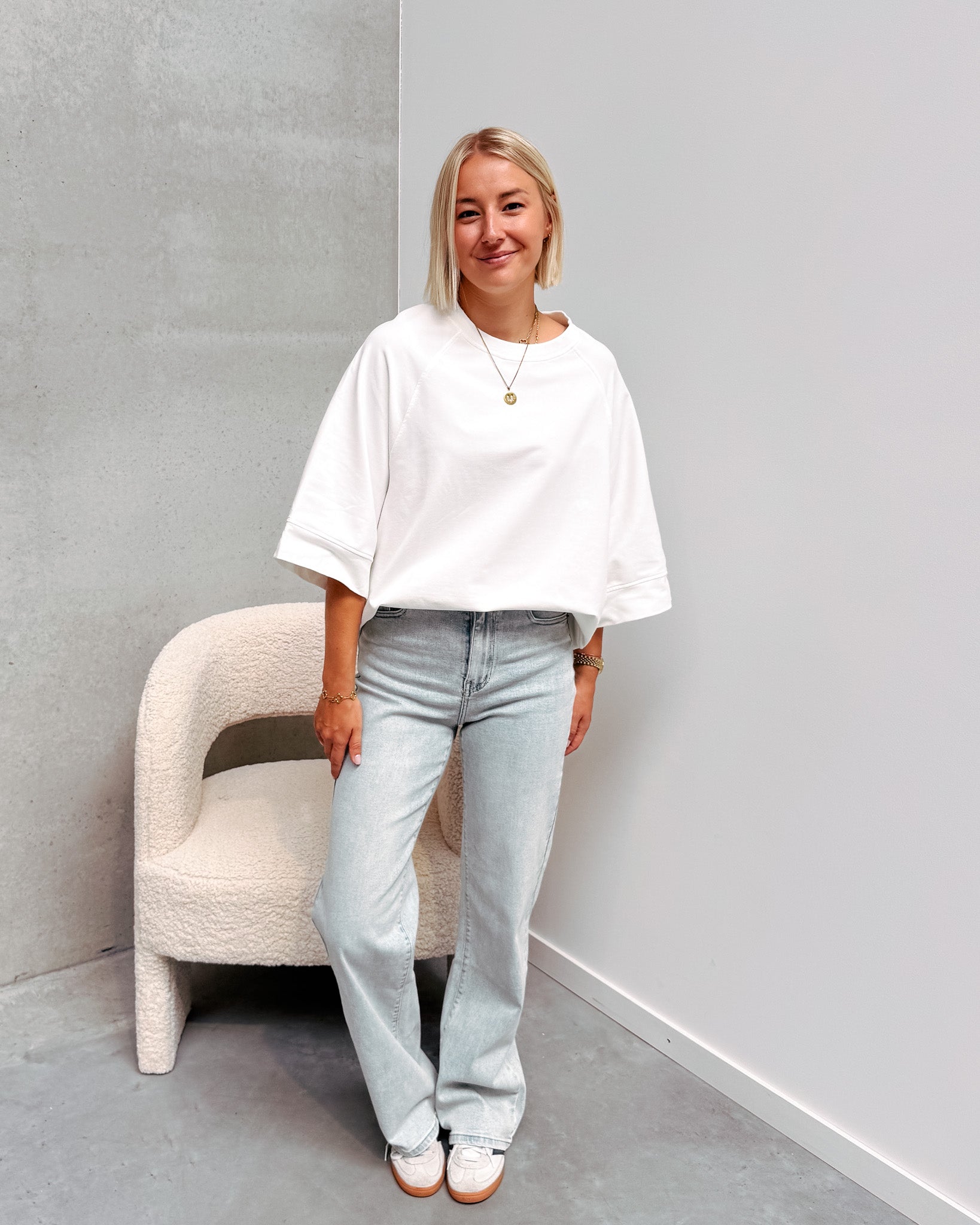 De broek heeft een hoge taille met brede pijpen. Er zit veel stretch in de jeans wat het heel aangenaam maakt om te dragen! Deze jeans heeft een hele mooi lichte kleur. Wij combineerden de jeans met de ‘TAHNEE SWEATER TEE - WHITE‘ samen vormen ze een mooi geheel.