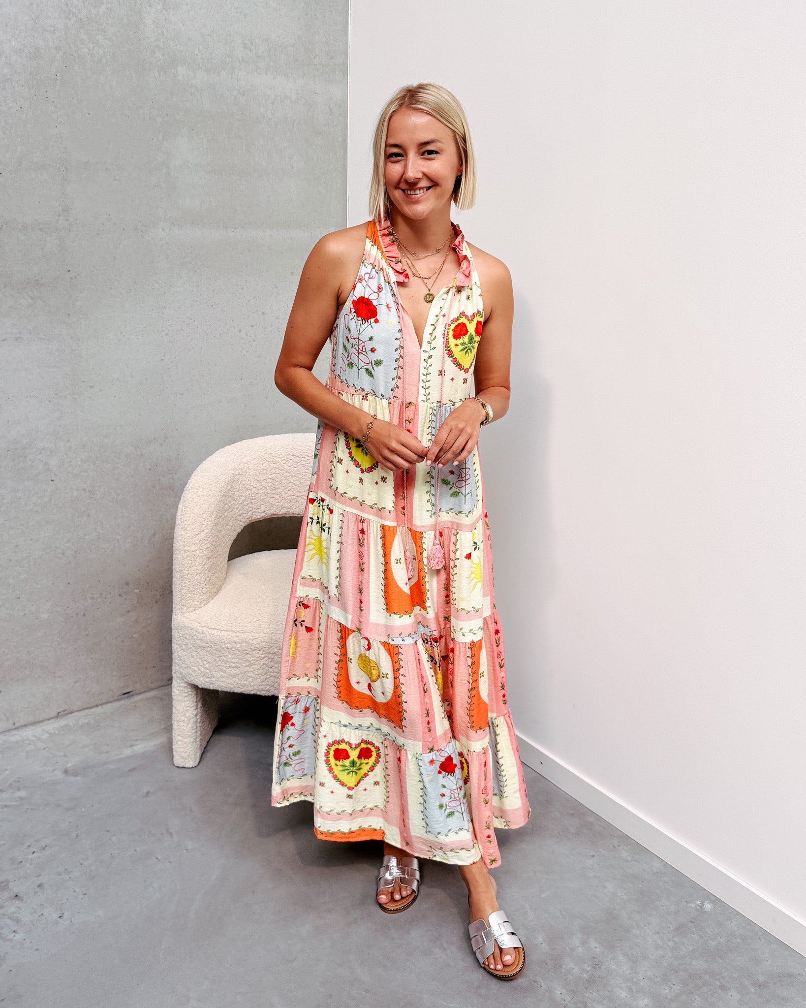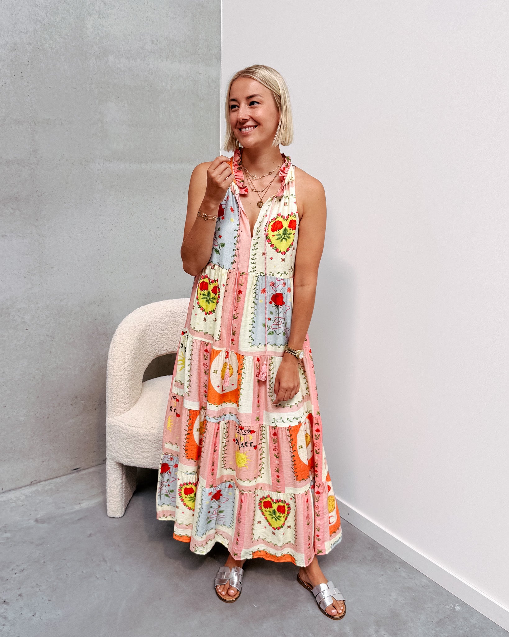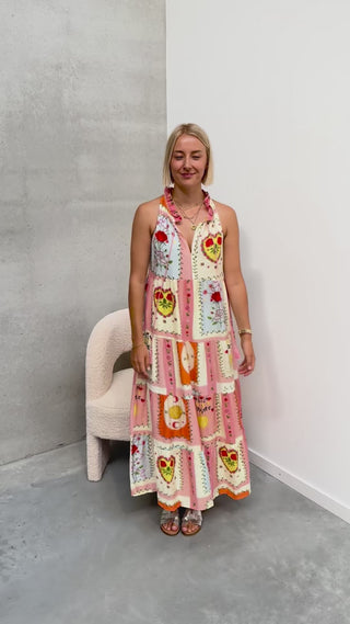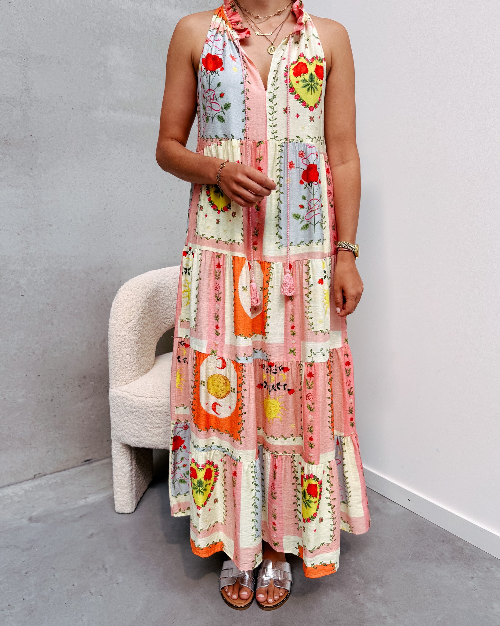 Het jurkje heeft een uitlopend modelletje in een prachtig printje en luchtig stofje! Deze jurk heeft een opstaand kraagje met een leuk ruffle detail en 2 touwen. Ook heeft het jurkje een mooie v-hals. Wij combineerden het jurkje met de ‘COCO CHUNKY SANDALS - MULTICOLOR’ samen vormen ze een perfect match! We raden aan de jurk met de hand te wassen.