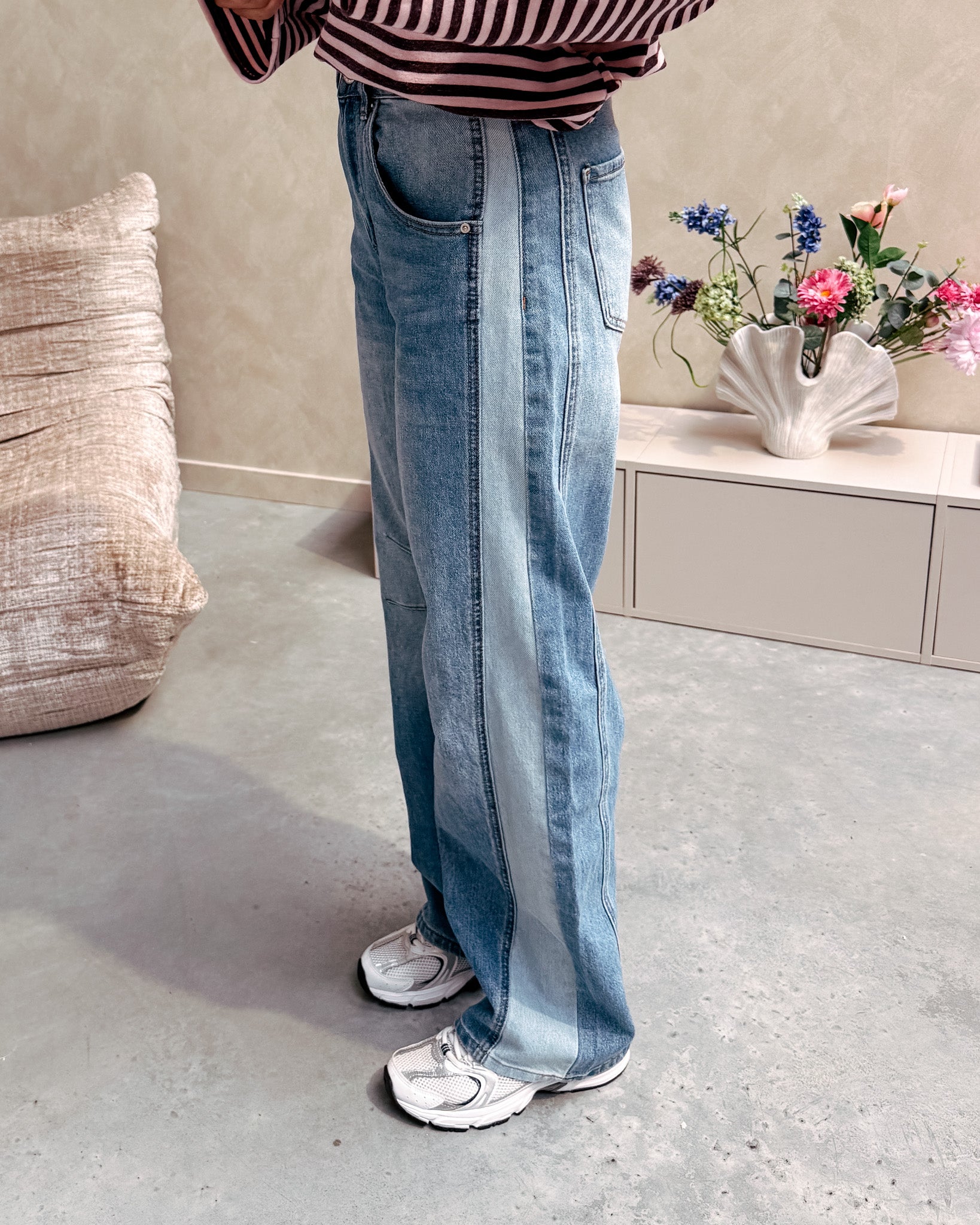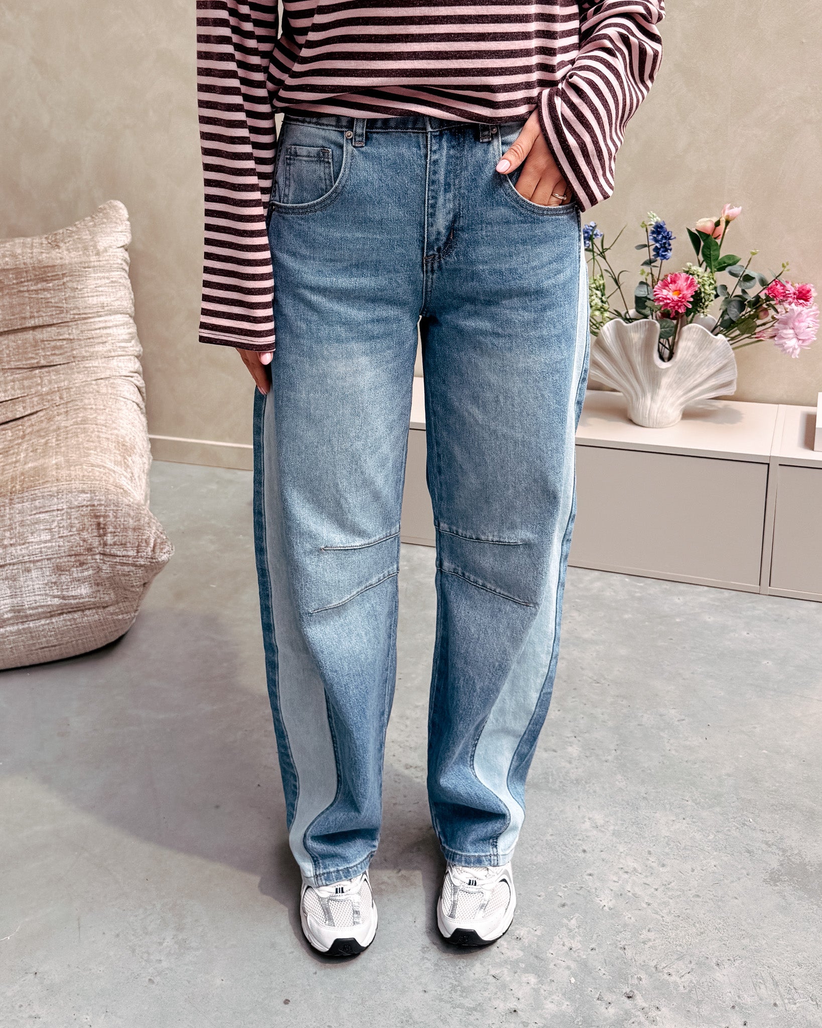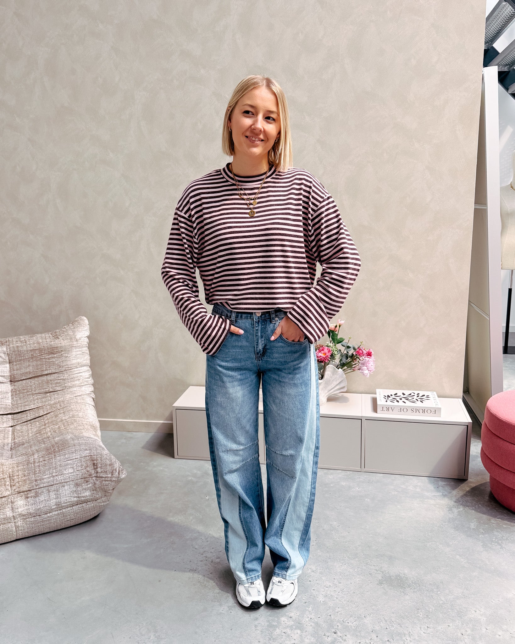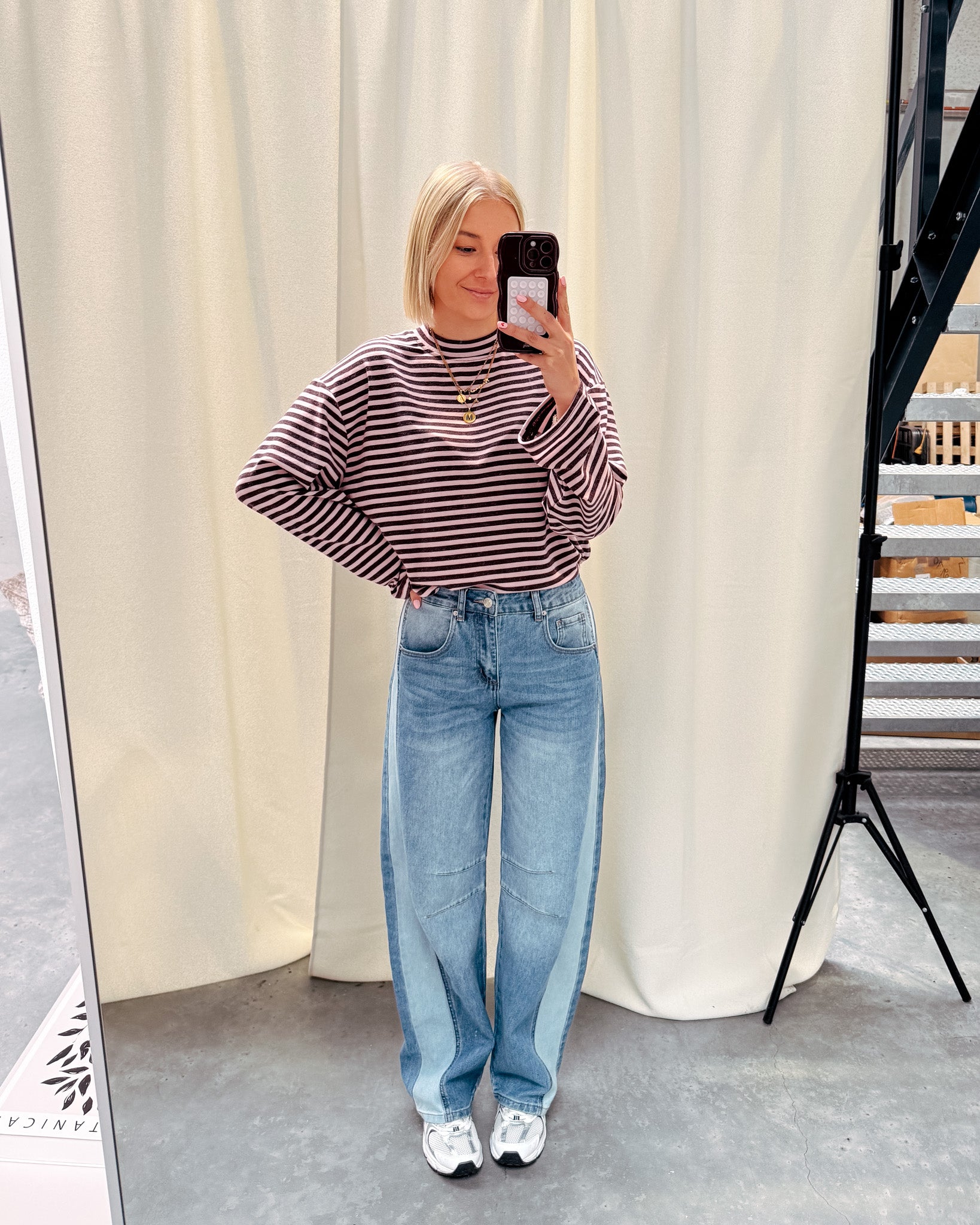 Deze jeans heeft een balloon model. De jeans heeft een hoge taille met stretch waardoor deze heel aangenaam zit. Deze jeans heeft wijde pijpen en valt dan smaller toe naar de enkels, zo creëer je het balloon effect. Ook heeft deze jeans nog een leuk lichtblauw streep detail aan de zijkant. De jeans valt iets langer van lengte, je kan deze altijd heel tof omplooien. Wij combineerden de jeans met de ‘CASUAL CLUB STRIPED LONGSLEEVE - ROSE/PURPLE’ samen vormen ze een mooi geheel!