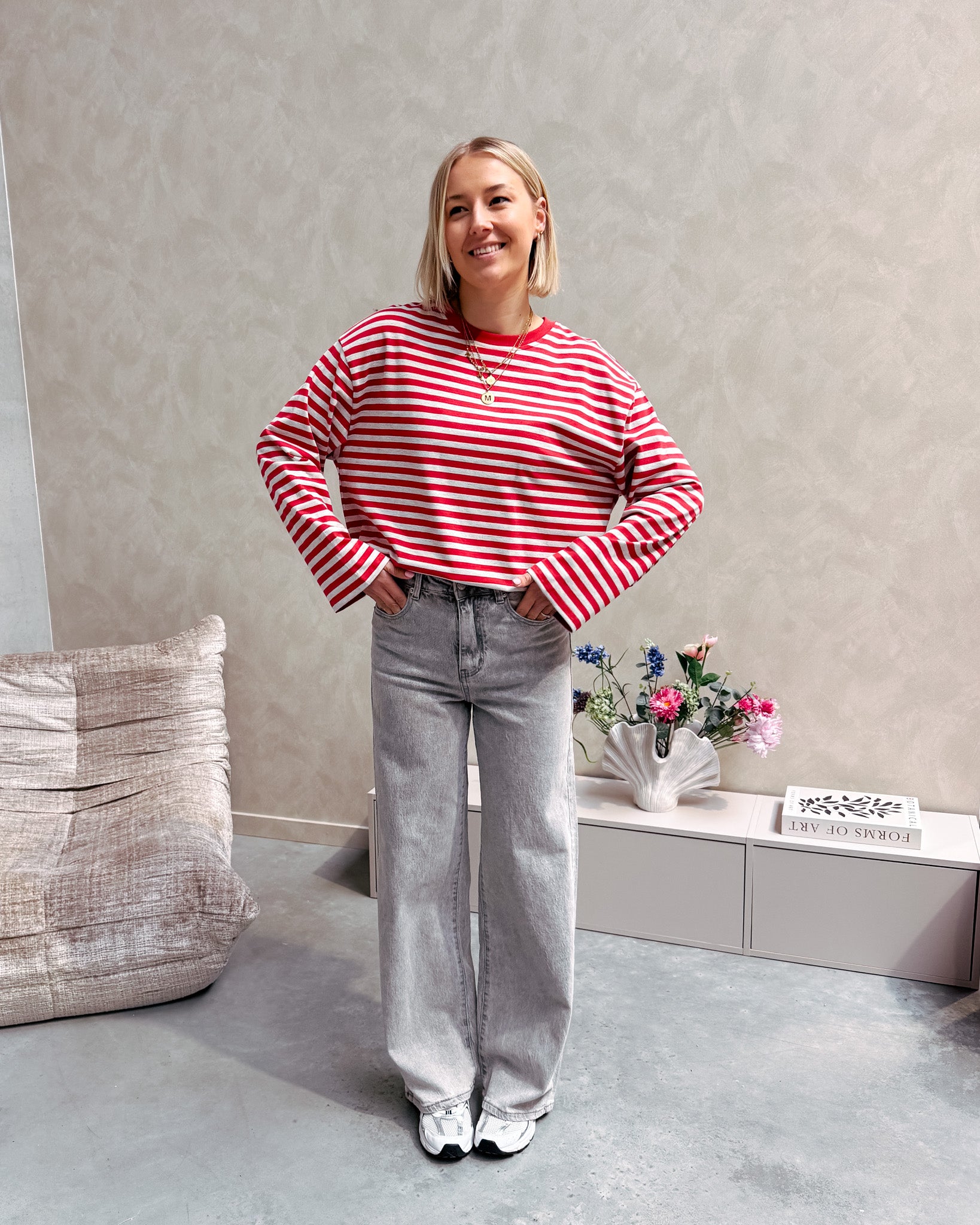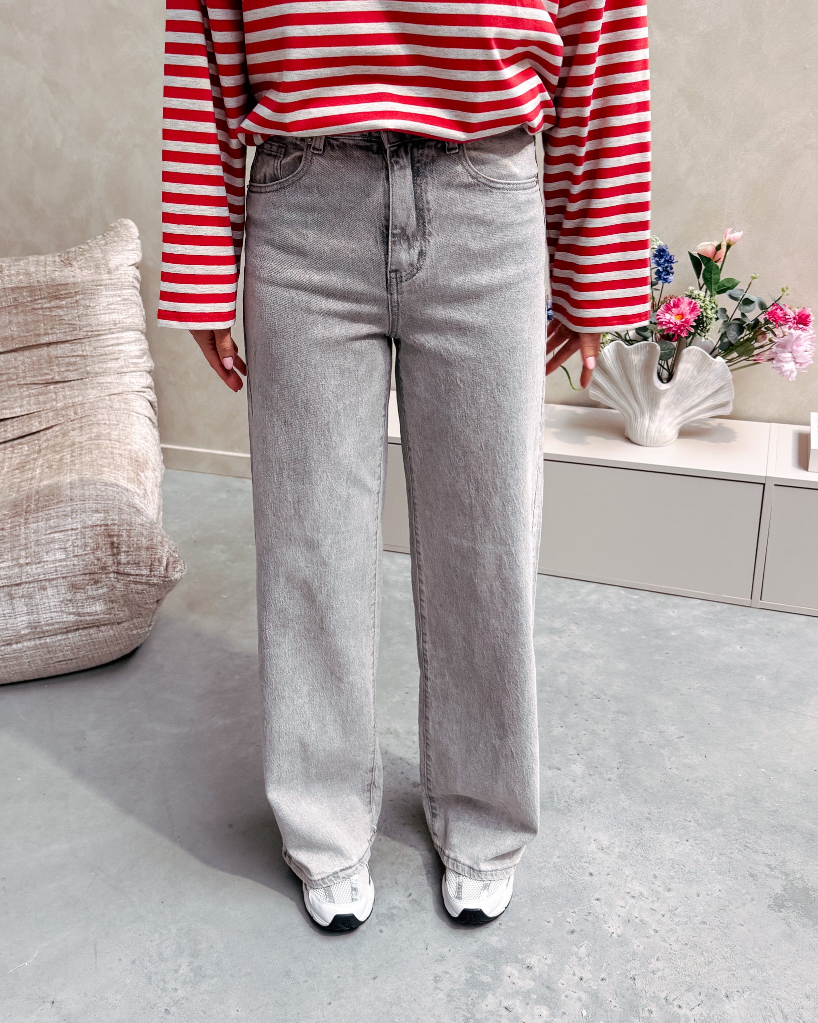 De broek heeft een hoge taille met brede pijpen. Er zit stretch in de jeans wat het heel aangenaam maakt om te dragen! Deze jeans heeft een hele mooie licht grijze kleur en een soepele dunne jeans stof. De pasvorm van deze broek is ook heel flatterend. Wij combineerden de jeans met de ‘REDLINE ESSENTIAL LONGSLEEVE TEE’ samen vormen ze een perfect geheel.