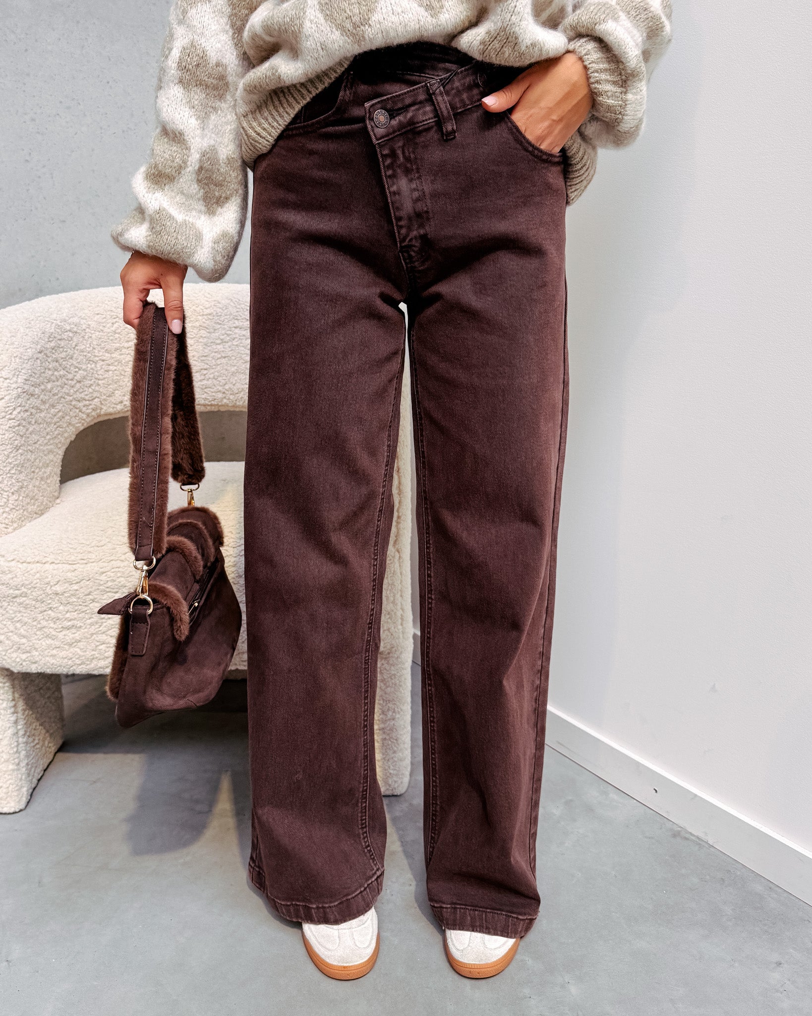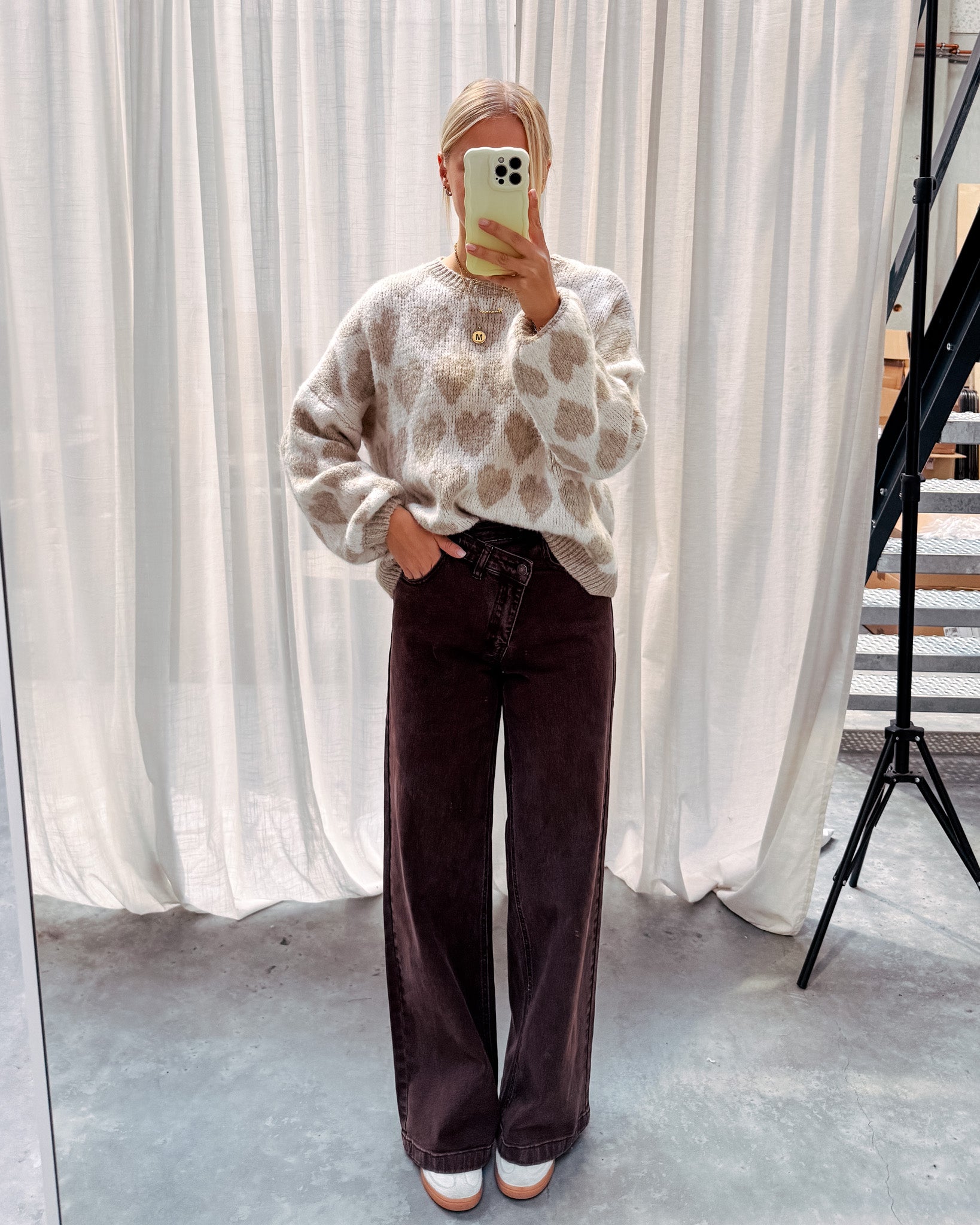 De broek heeft een breed modelletje en een asymmetrische sluiting. Er zit veel stretch in de jeans wat het heel aangenaam maakt om te dragen! Wij combineerden de jeans met de ‘HEARTS KNIT - BEIGE/CREAM‘ en 'FUZZY BABE BAG - BROWN' samen vormen ze een mooi geheel.