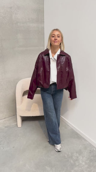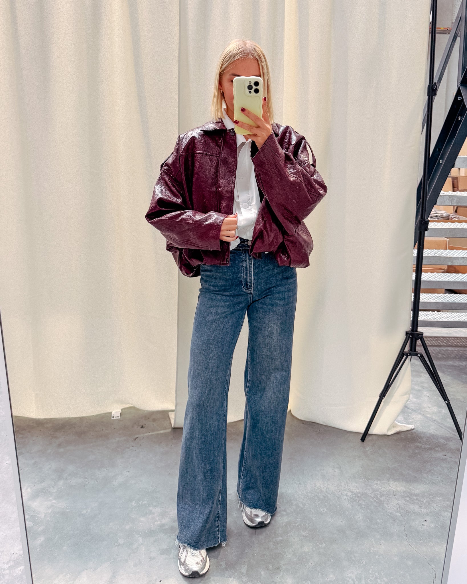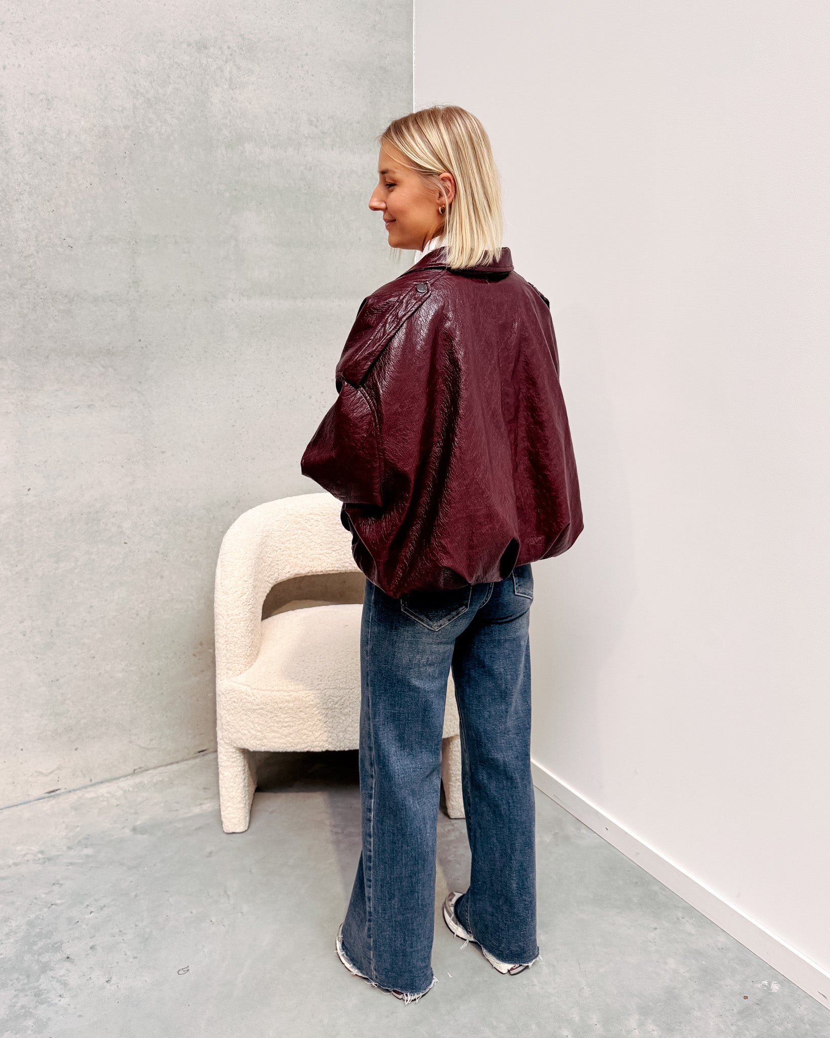 Deze jas is momenteel helemaal on trend. De jas heeft een mooi glanzend PU stofje in een prachtige bordeaux kleur! De jas heeft leuke pofmouwen, een oversized model en valt lekker poofy! Wij combineerden de jas met de ‘TARA STATEMENT BLOUSE - WHITE’ en ‘ODA CUT OFF JEANS - BLUE’ samen vormen ze een perfect geheel!