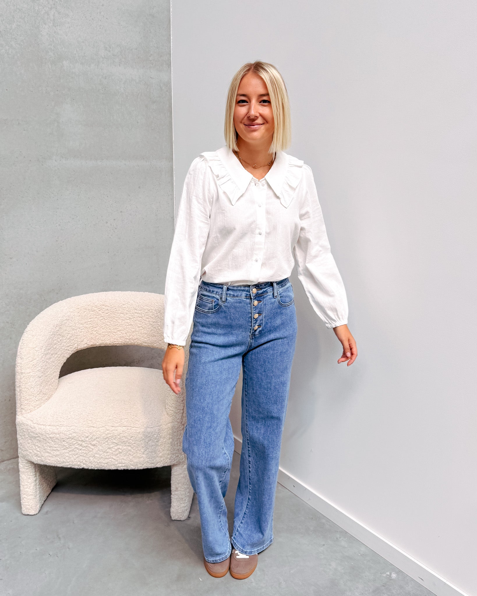 De broek is vooraan afgewerkt met leuke gouden knopjes! Deze broek heeft een hoge taille, ook heeft deze een breed model. Er zit veel stretch in de broek wat het heel aangenaam maakt om te dragen! Wij combineerden de jeans met de 'MATHILDA BLOUSE - WHITE' samen vormen ze een mooi geheel!